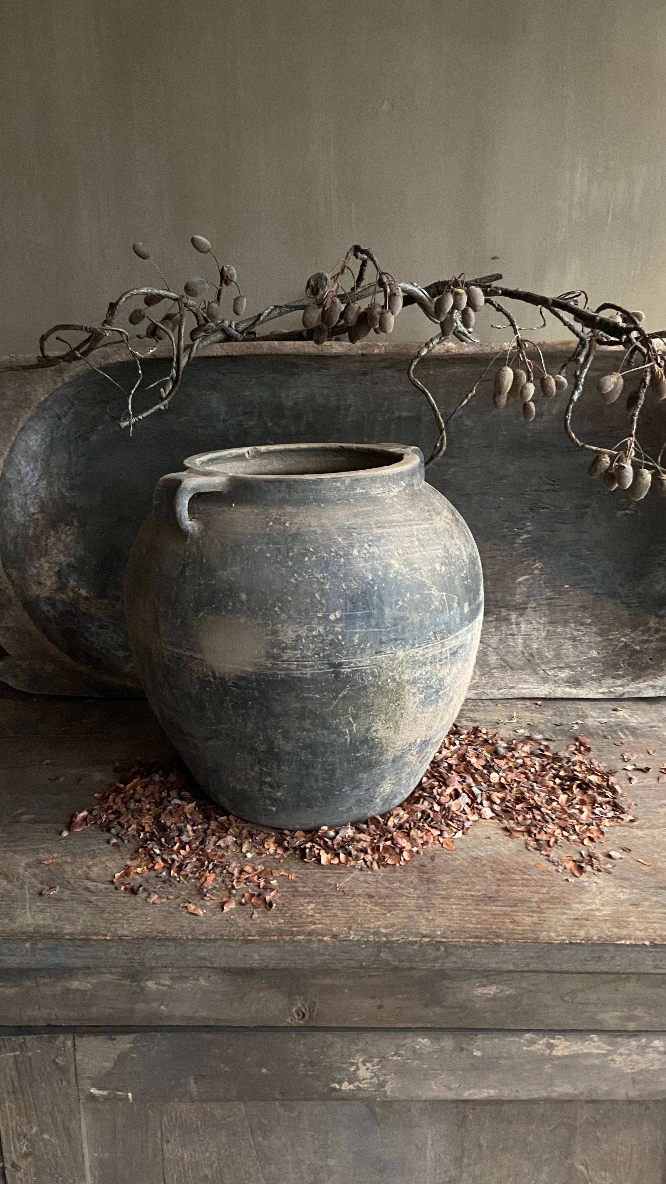 Deze Chinese kruik met oor is een karaktervolle toevoeging aan een stoer en sober interieur.