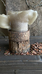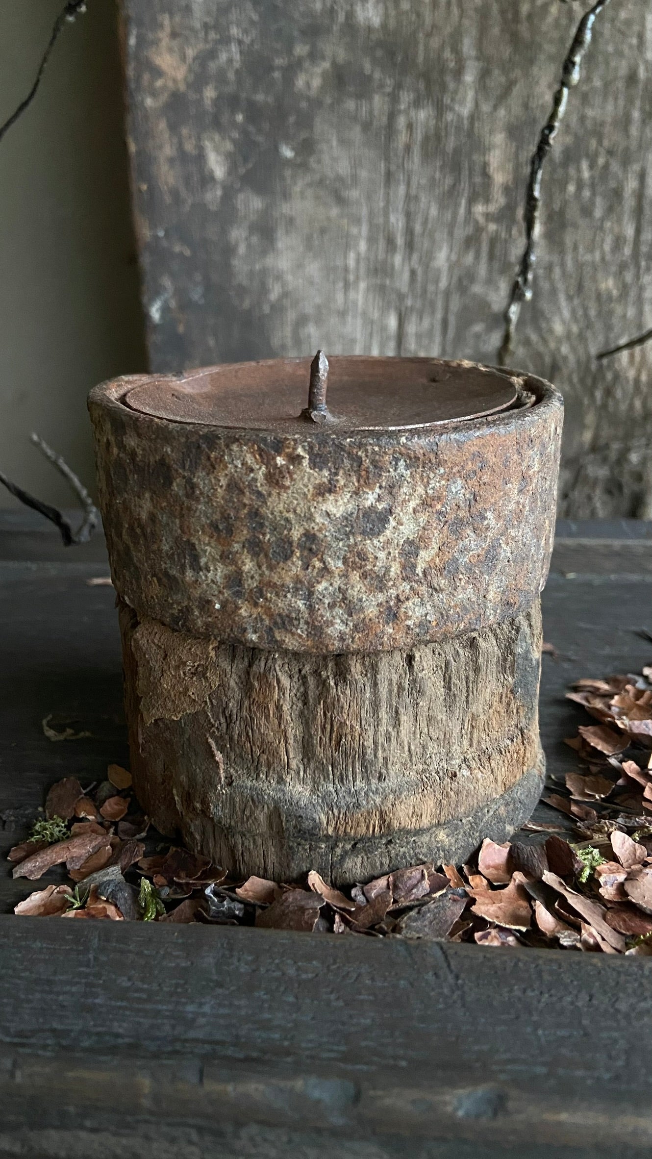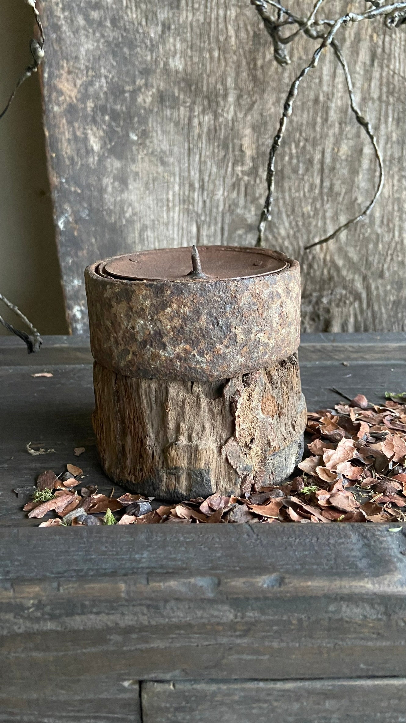 Deze kandelaar is gemaakt van een stuk oud hout en afgewerkt met een metalen houder. Het hout heeft een doorleefde uitstraling met scheuren en oneffenheden, wat elk exemplaar uniek maakt.