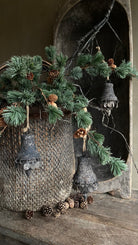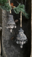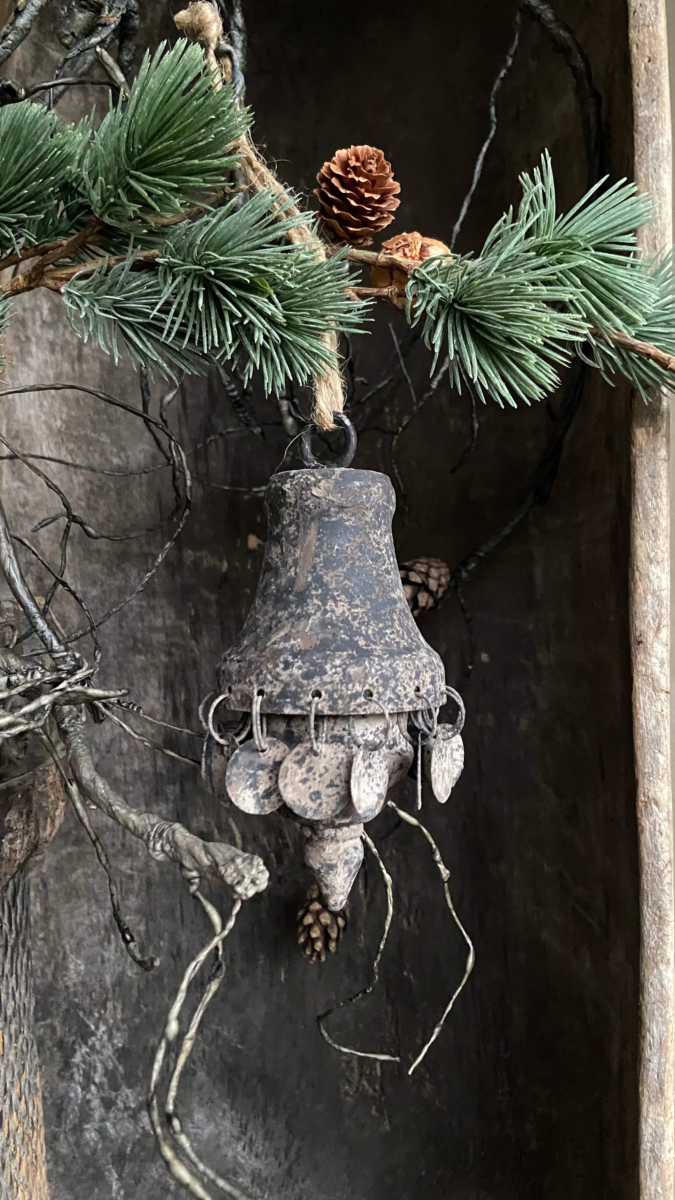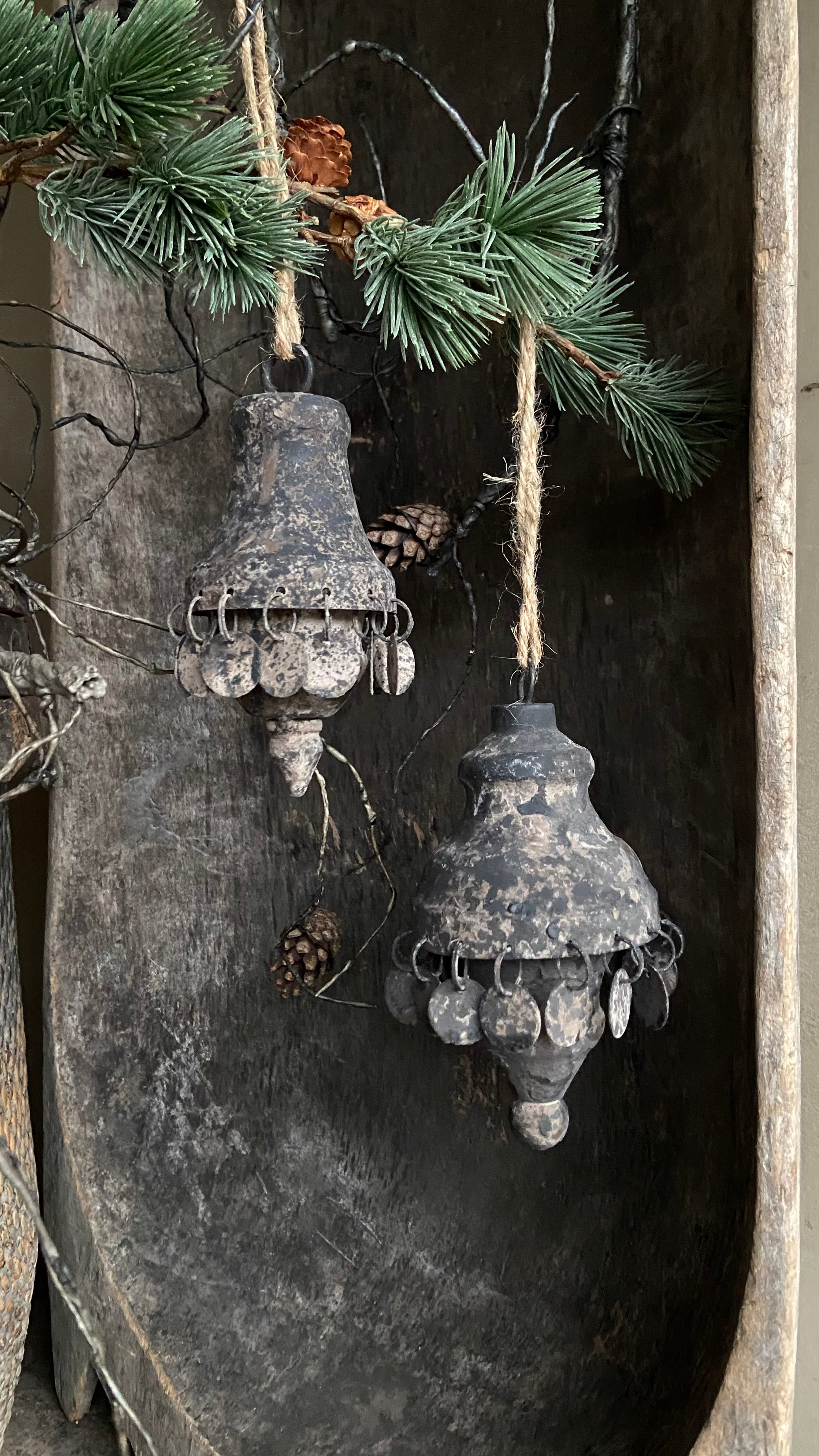 Gemaakt van metaal met een grijs patina en kleine metalen schijfjes rondom. De hanger heeft een doorleefde, sobere look die meteen sfeer geeft.