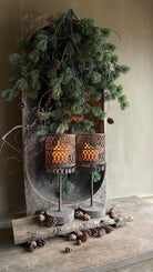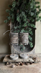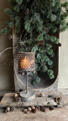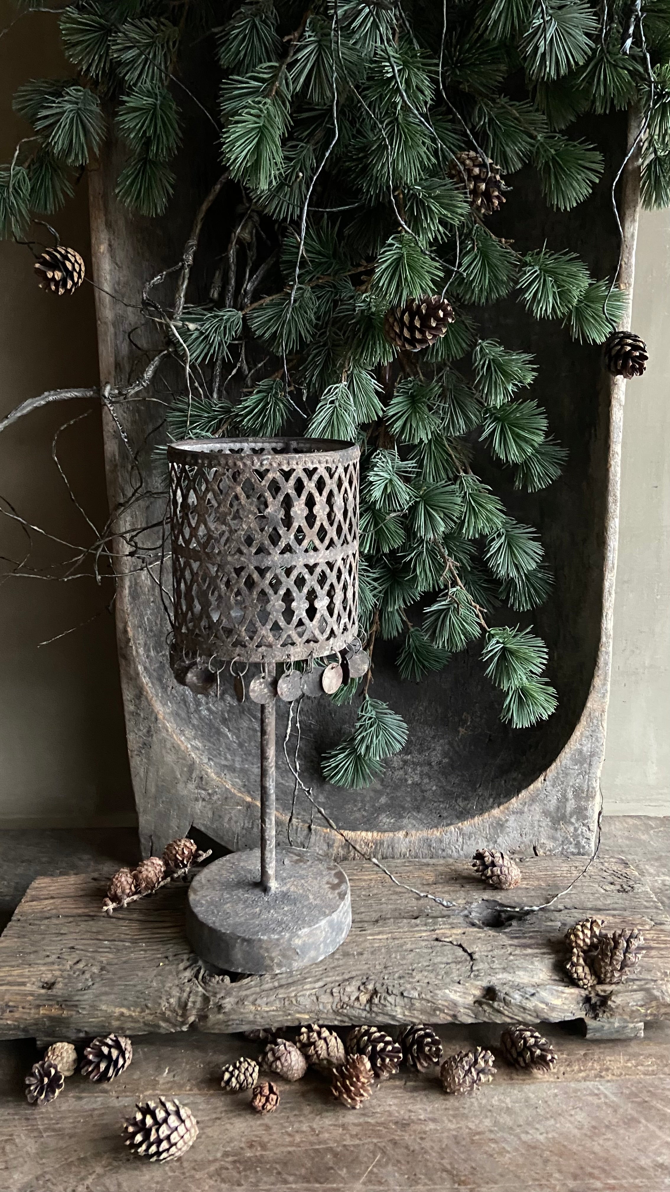 Deze metalen lantaarn op voet brengt direct warmte en sfeer in huis, de verweerde grijze kleur en het opengewerkte patroon geven een stoere maar gezellige uitstraling die mooi past in een sober of landelijk interieur.