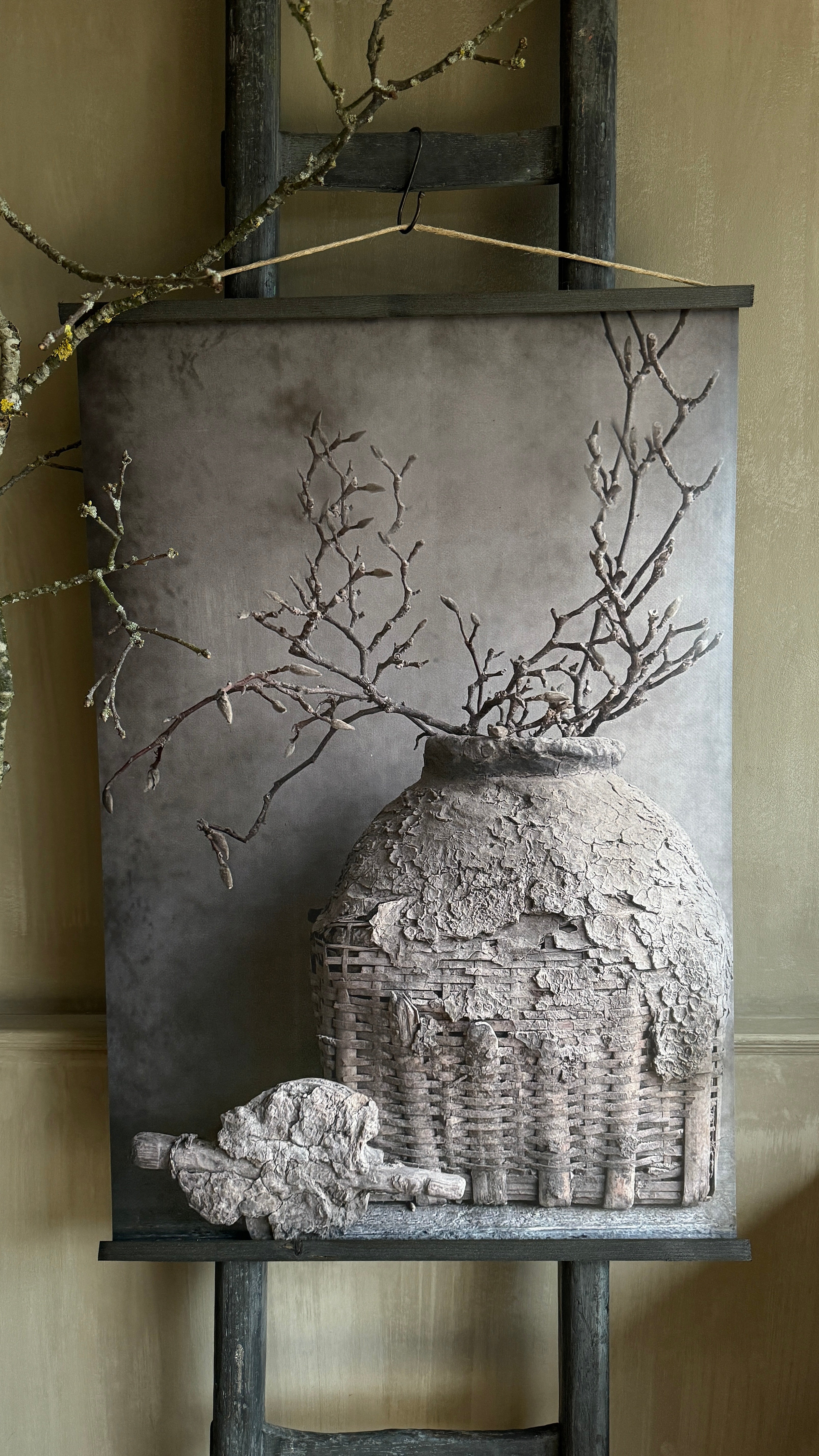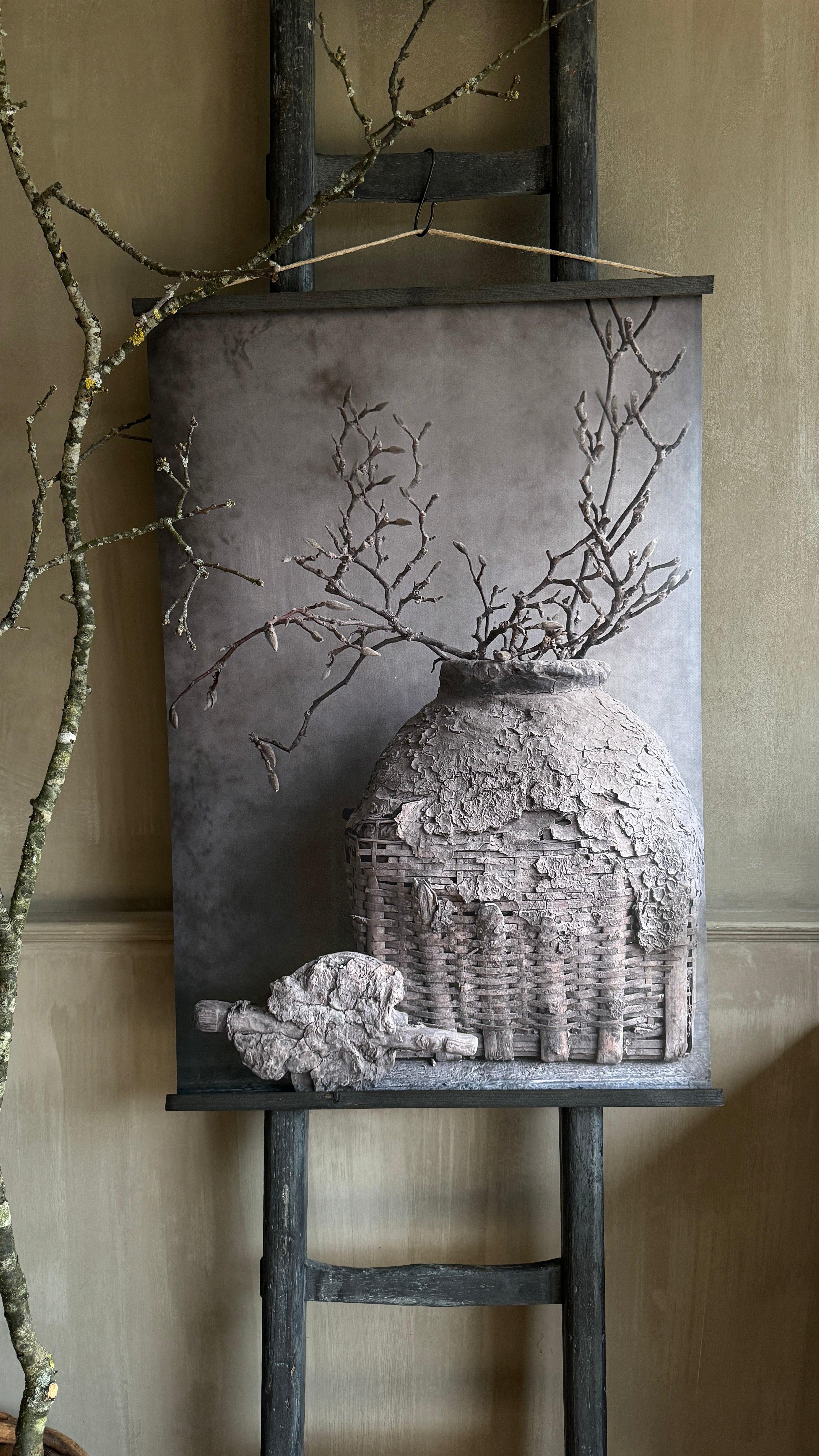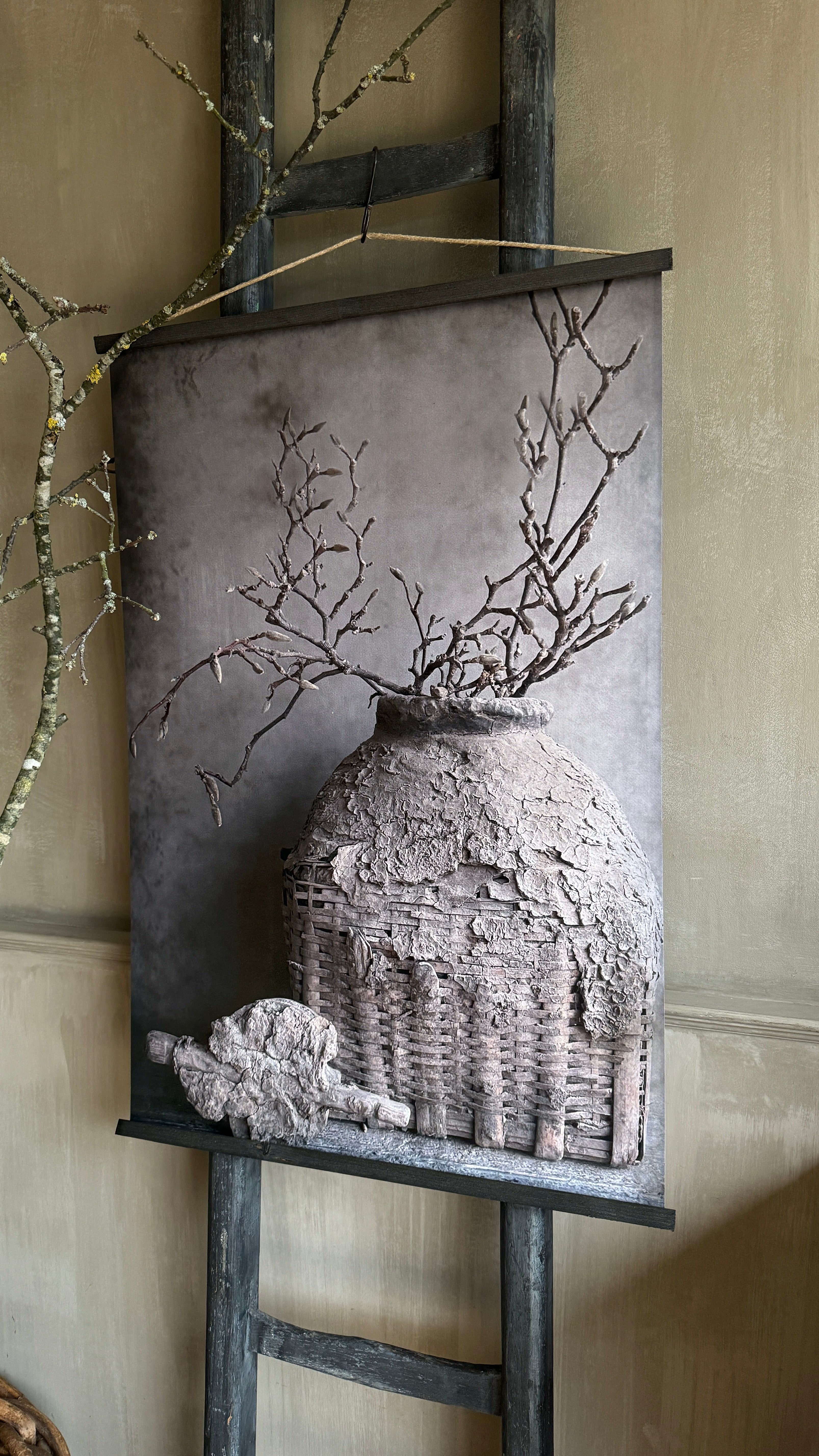 2. Stijlvol ontwerp: De poster wordt gepresenteerd met twee donkergrijze latjes aan de boven- en onderzijde, die niet alleen functioneren als een stevige ondersteuning, maar ook een vleugje sobere sfeer toevoegen aan het geheel. Het subtiele touw aan de bovenste lat maakt het ophangen een fluitje van een cent en voegt een rustiek accent toe.