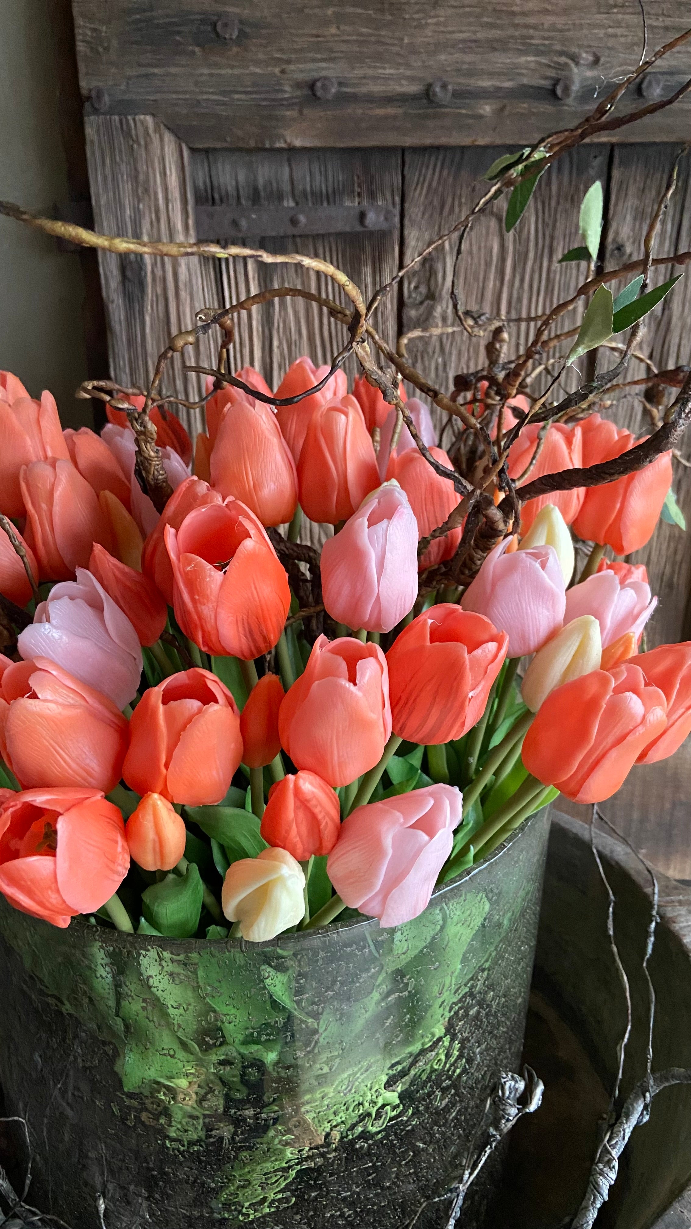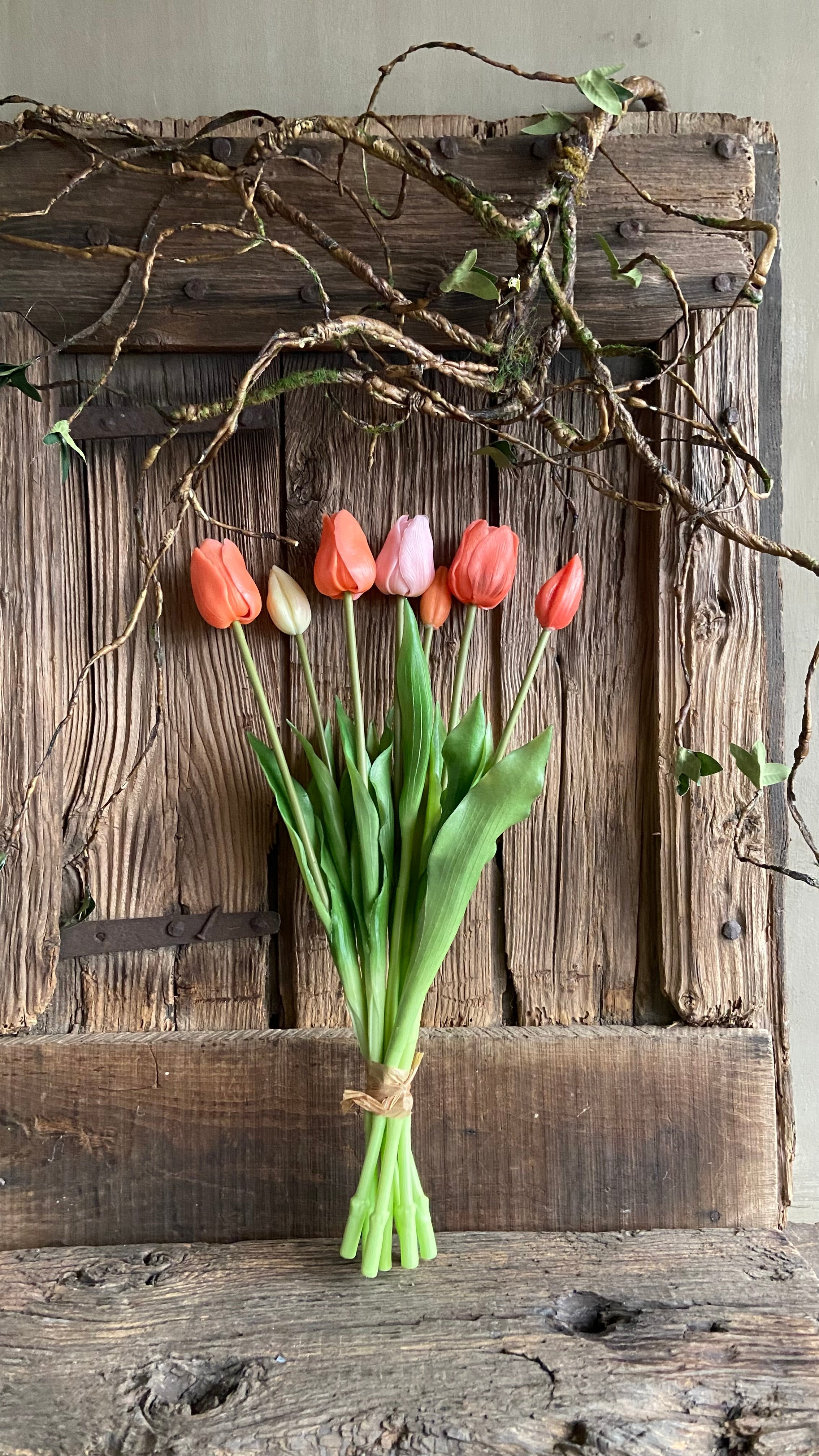 Deze kunsttulpen mix zalm worden geleverd als bos van 7 stuks en hebben een mooie mix van zalm- en zachte roze tinten. Het groene blad is vol en natuurlijk van vorm, waardoor het boeket een frisse en rustige uitstraling krijgt die goed past in een sober en landelijk interieur.