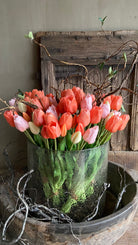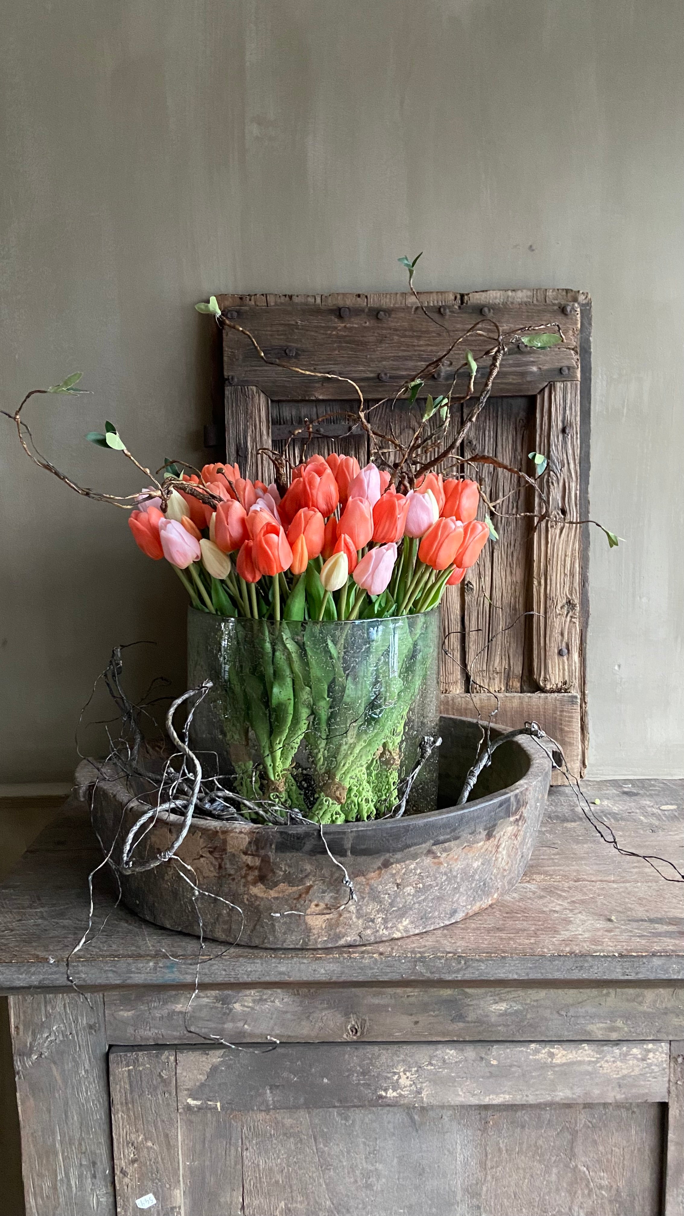 De tulpen zijn heel goed te combineren met een gagelbosje of met een takkenbos met blad. Dit zorgt voor extra hoogte en een natuurlijk geheel, zoals op de sfeerfoto’s te zien is. Per tulpenbos van 7 stuks adviseren we 1 gagelbosje voor een mooi en rustig resultaat.