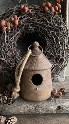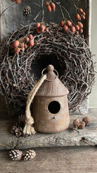 Het huisje hangt aan een stevig touw en heeft een rustieke look die goed past bij een sober en landelijk interieur. Mooi om neer te zetten op een plank, vensterbank of te combineren met groen en natuurlijke materialen.