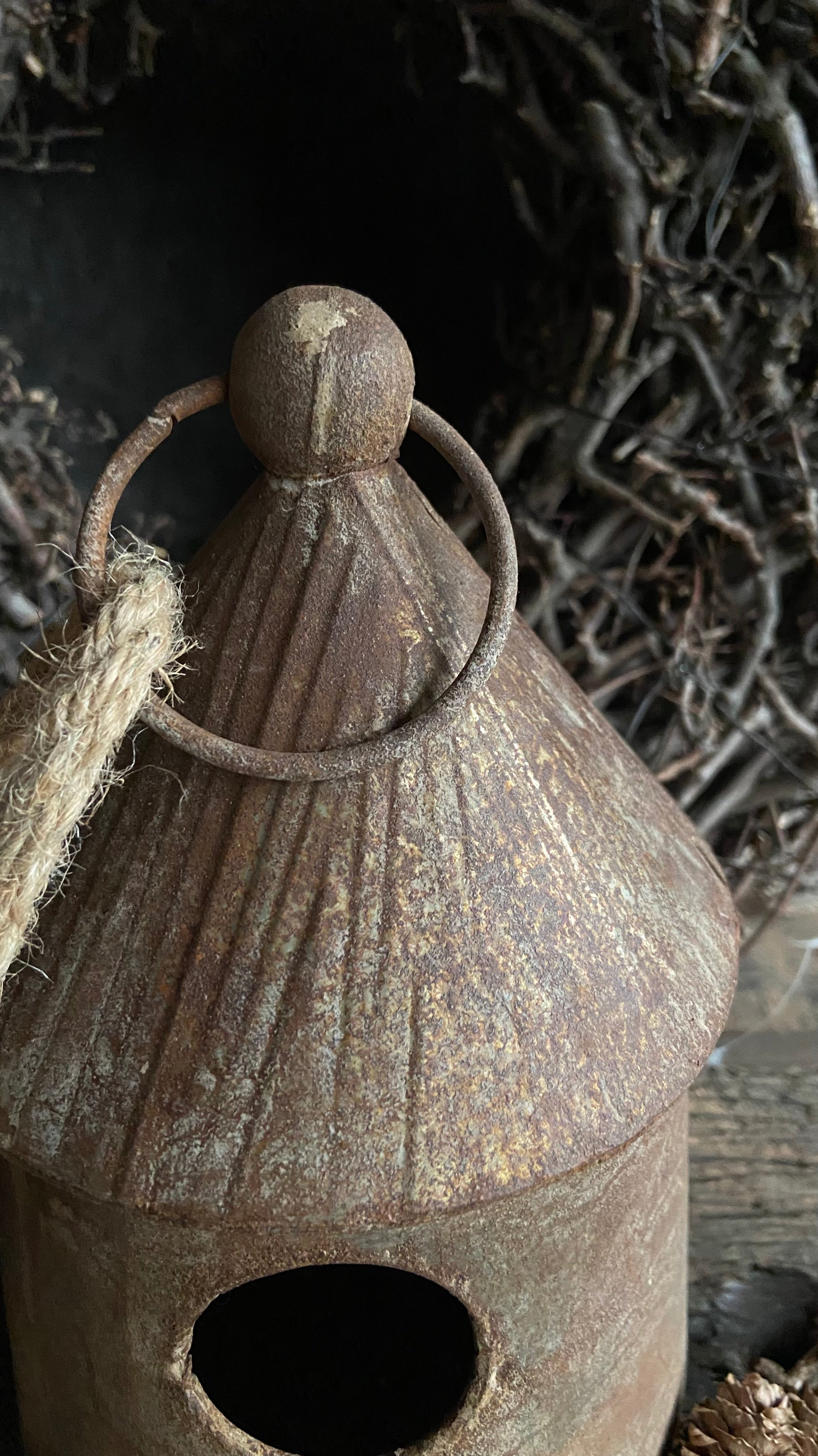 Metalen vogelhuis met touw, verweerde roestbruine kleur, verkrijgbaar in twee maten, decoratief voor binnen of onder een overkapping, past perfect bij een stoere en sobere woonstijl.
