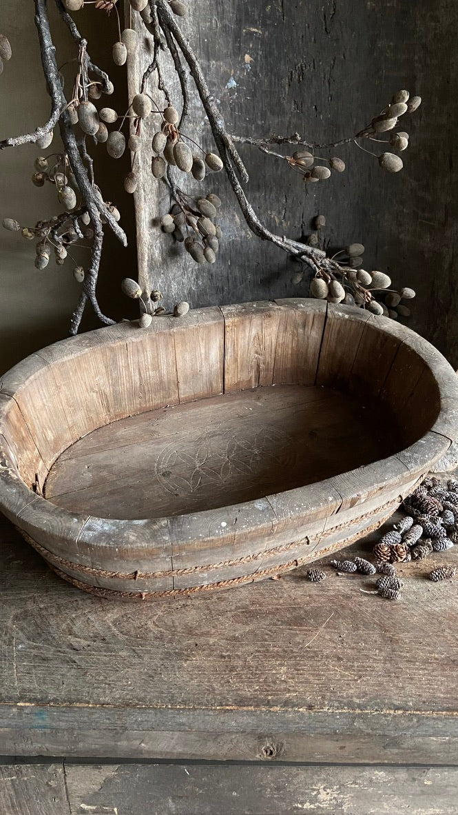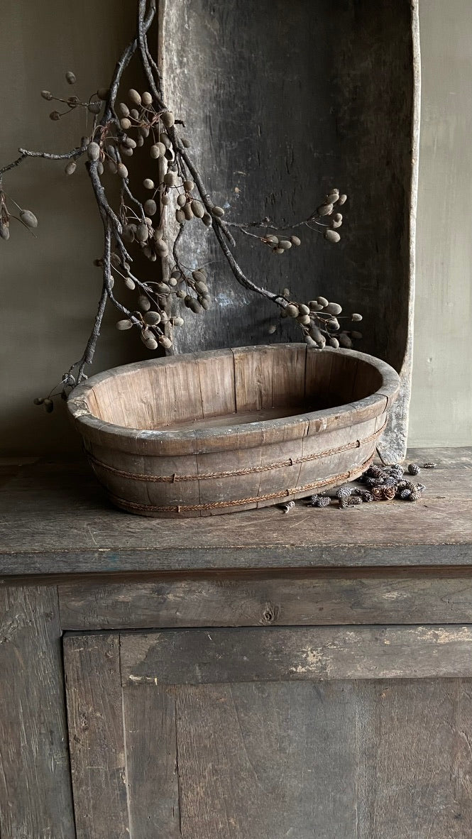 Deze oude houten olijfbak is een prachtig, doorleefd exemplaar met een authentieke uitstraling. Oorspronkelijk gebruikt bij het verwerken van olijven, draagt hij een uniek stukje geschiedenis met zich mee. De verweerde houtstructuur en natuurlijke veroudering zorgen voor een robuuste en karaktervolle look.