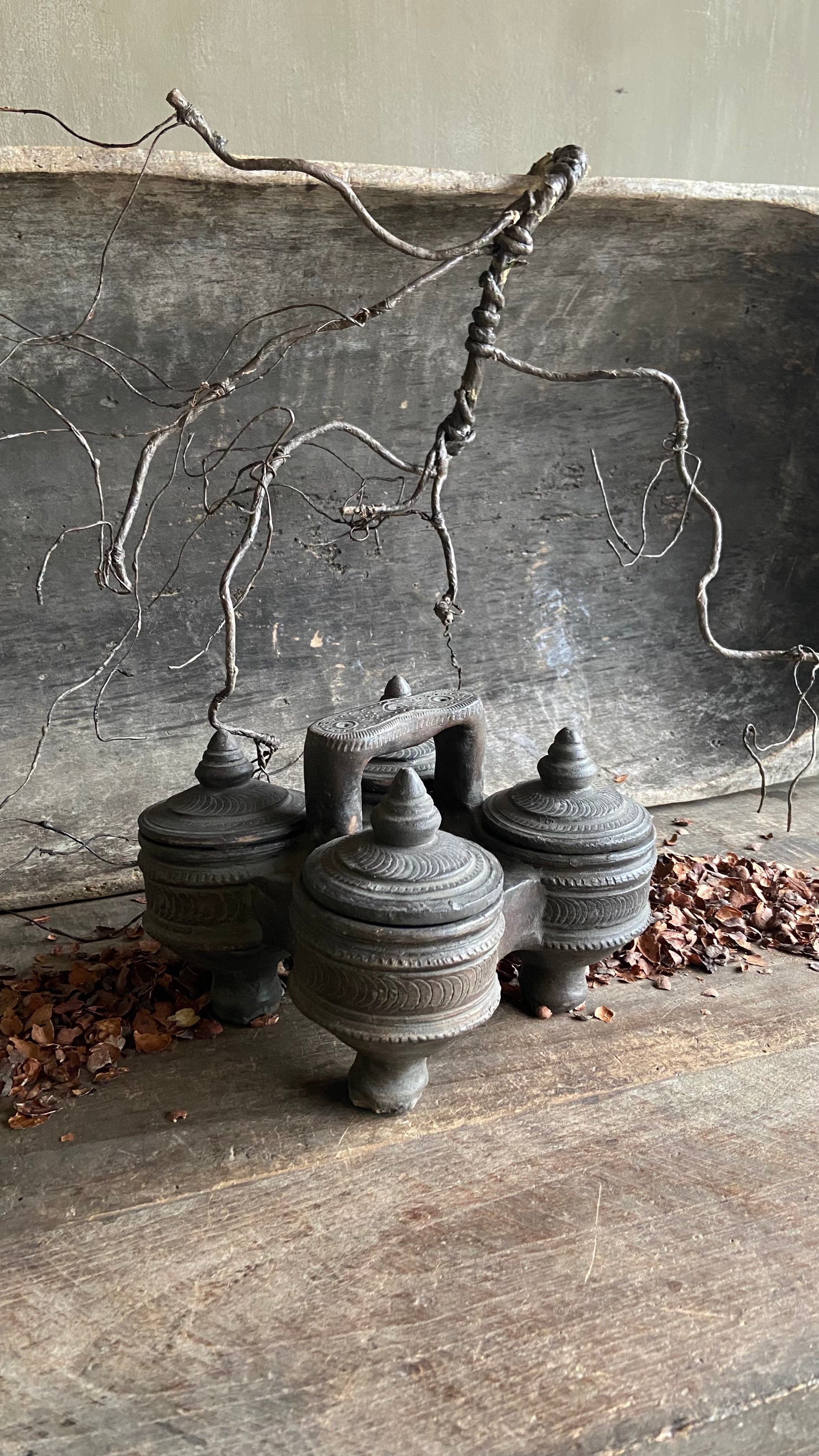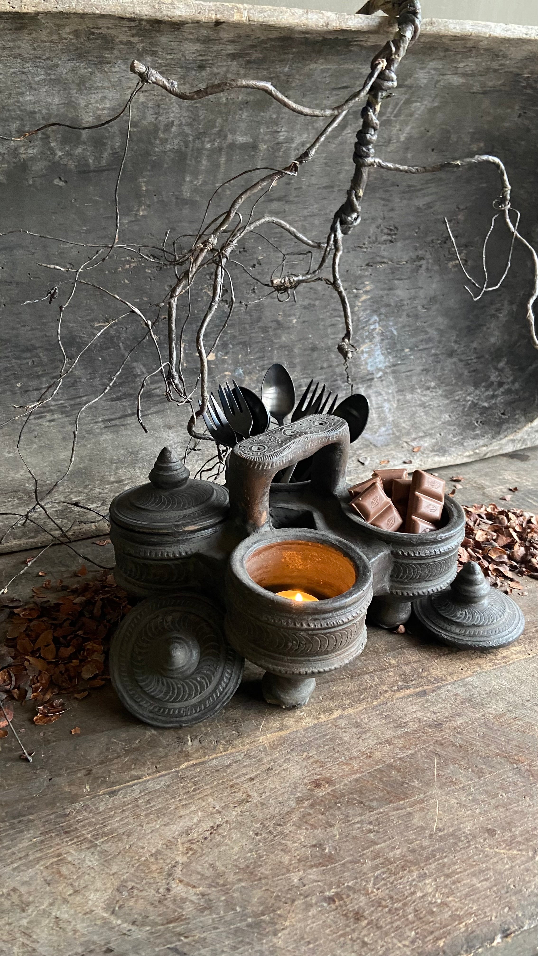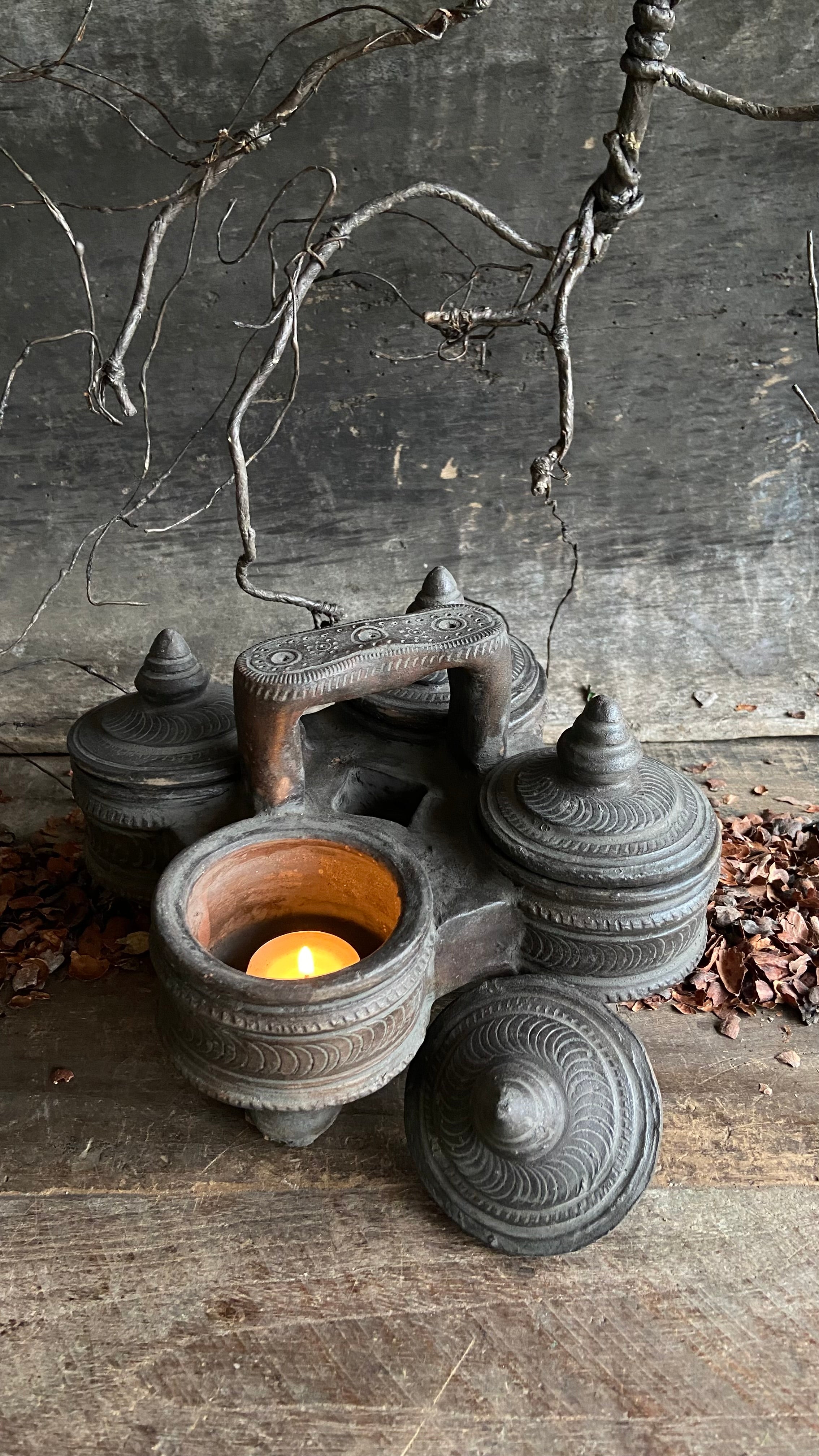 Met de hand gemaakt van klei en voorzien van fijne gravering in het oppervlak. De box bestaat uit vier kleine potjes met deksels, samengebracht in één geheel met stevige pootjes en een handgreep. Door het gebruik van traditionele technieken en het verweerde oppervlak is elk stuk uniek en doorleefd.