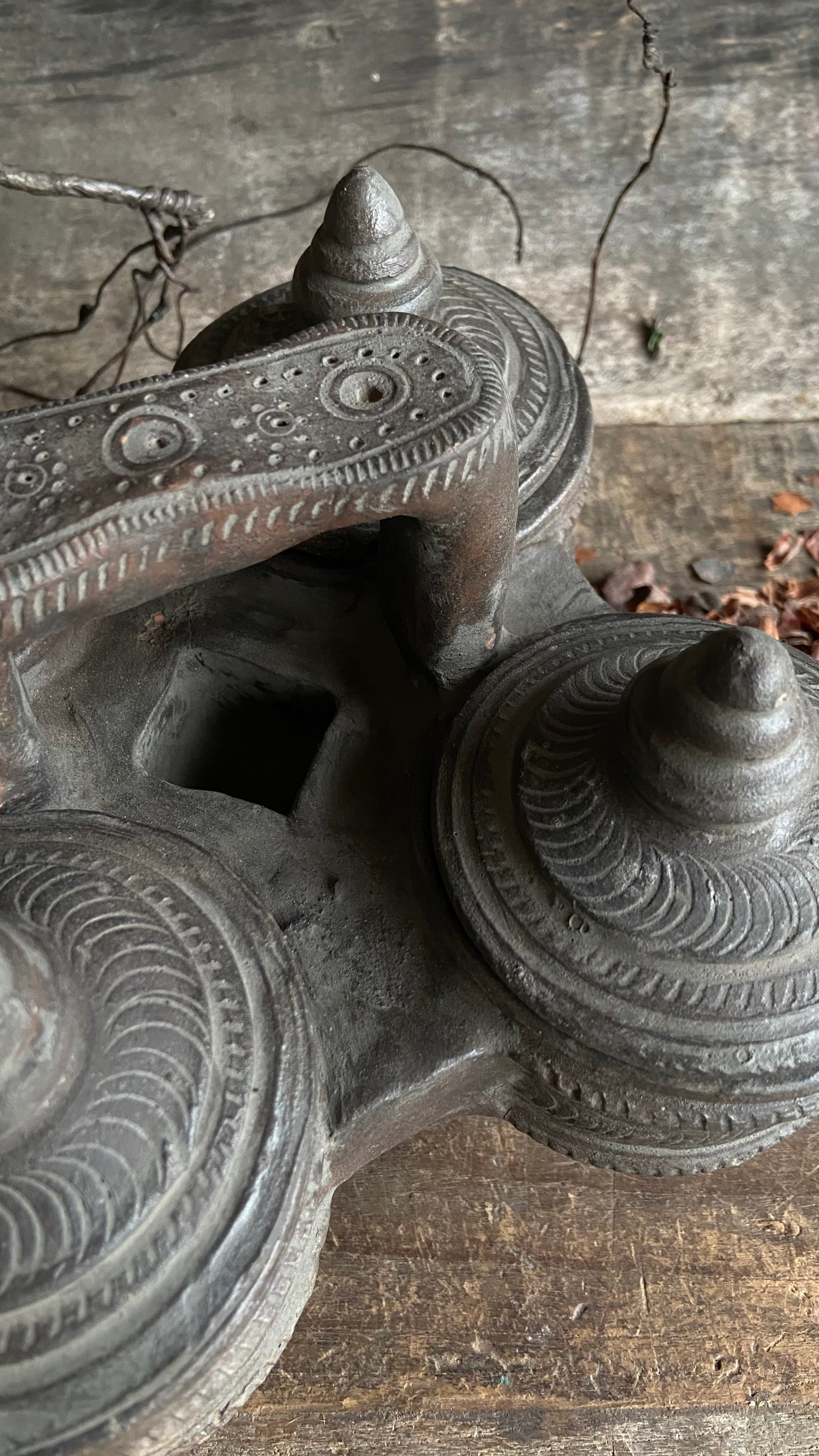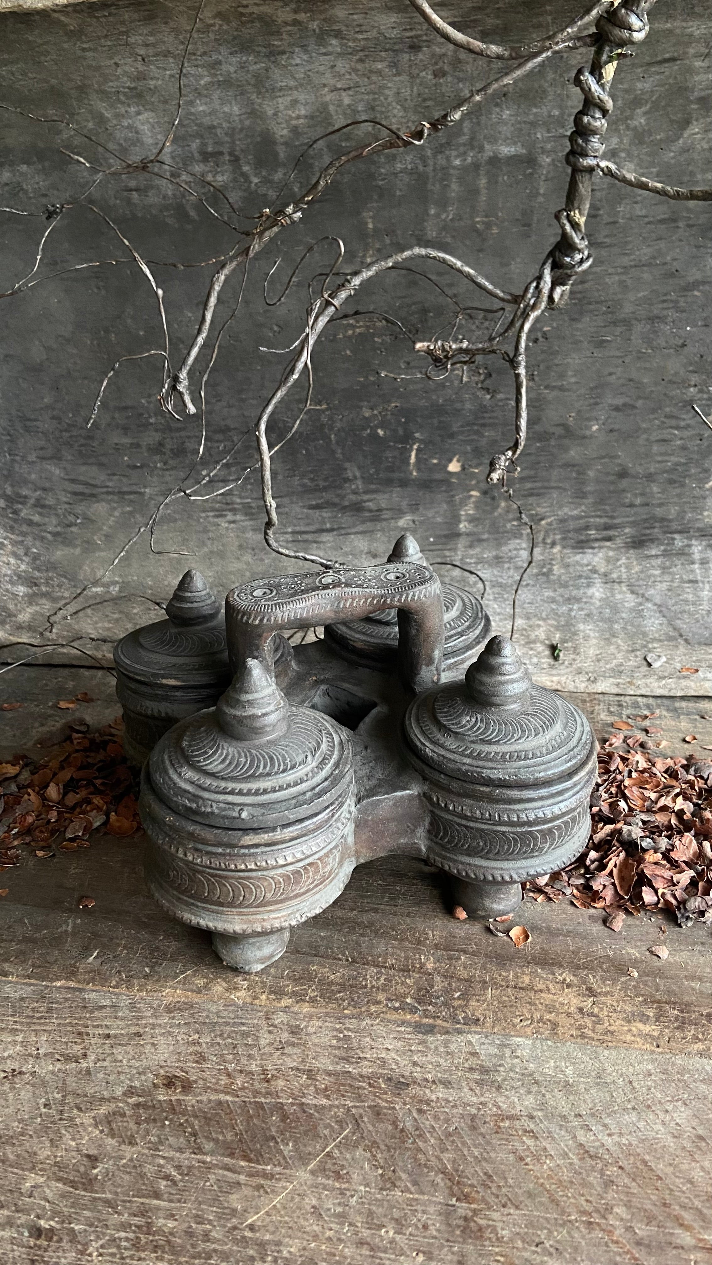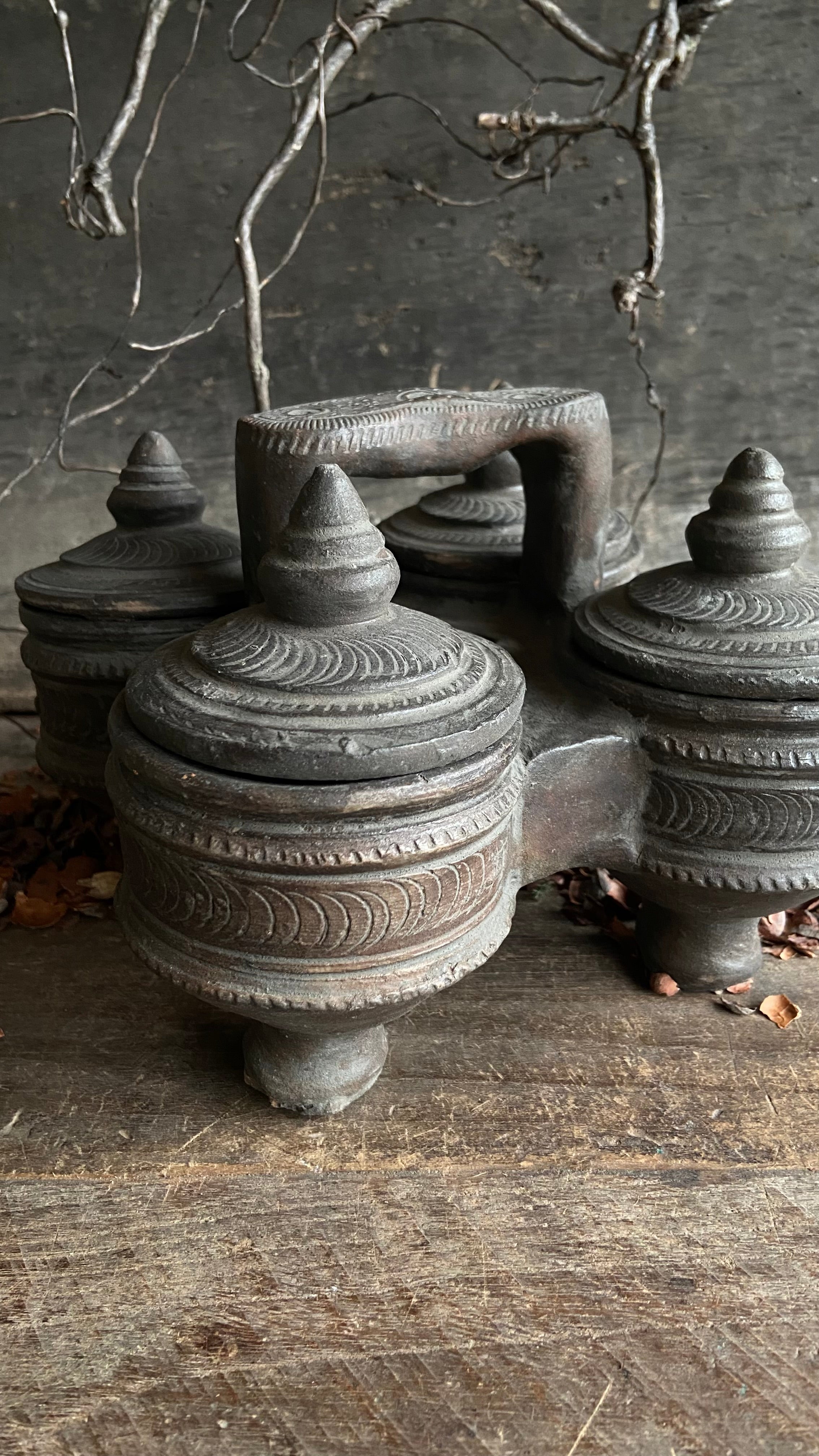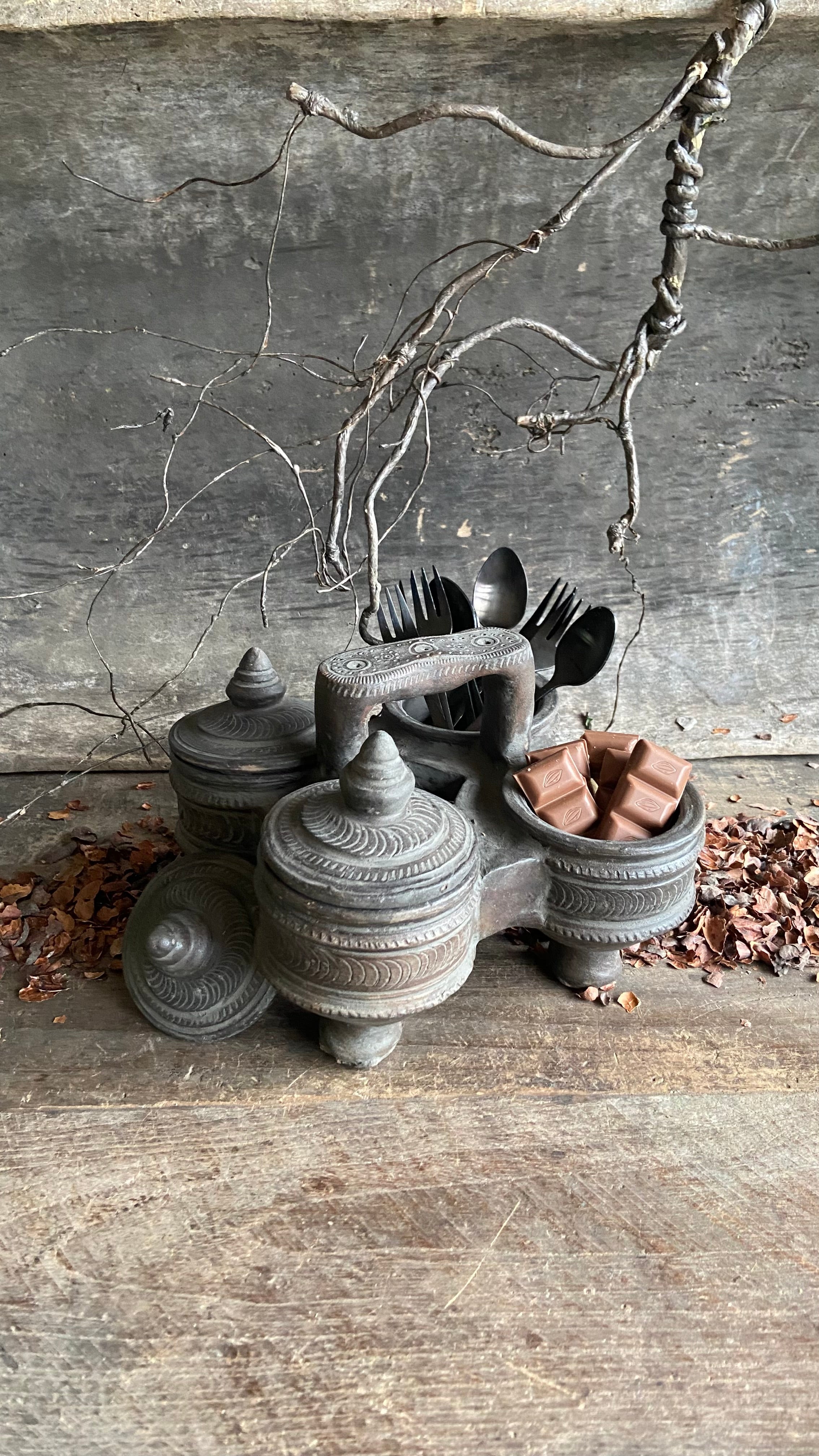 Met de hand gemaakt van klei en voorzien van fijne gravering in het oppervlak. De box bestaat uit vier kleine potjes met deksels, samengebracht in één geheel met stevige pootjes en een handgreep. Door het gebruik van traditionele technieken en het verweerde oppervlak is elk stuk uniek en doorleefd.
