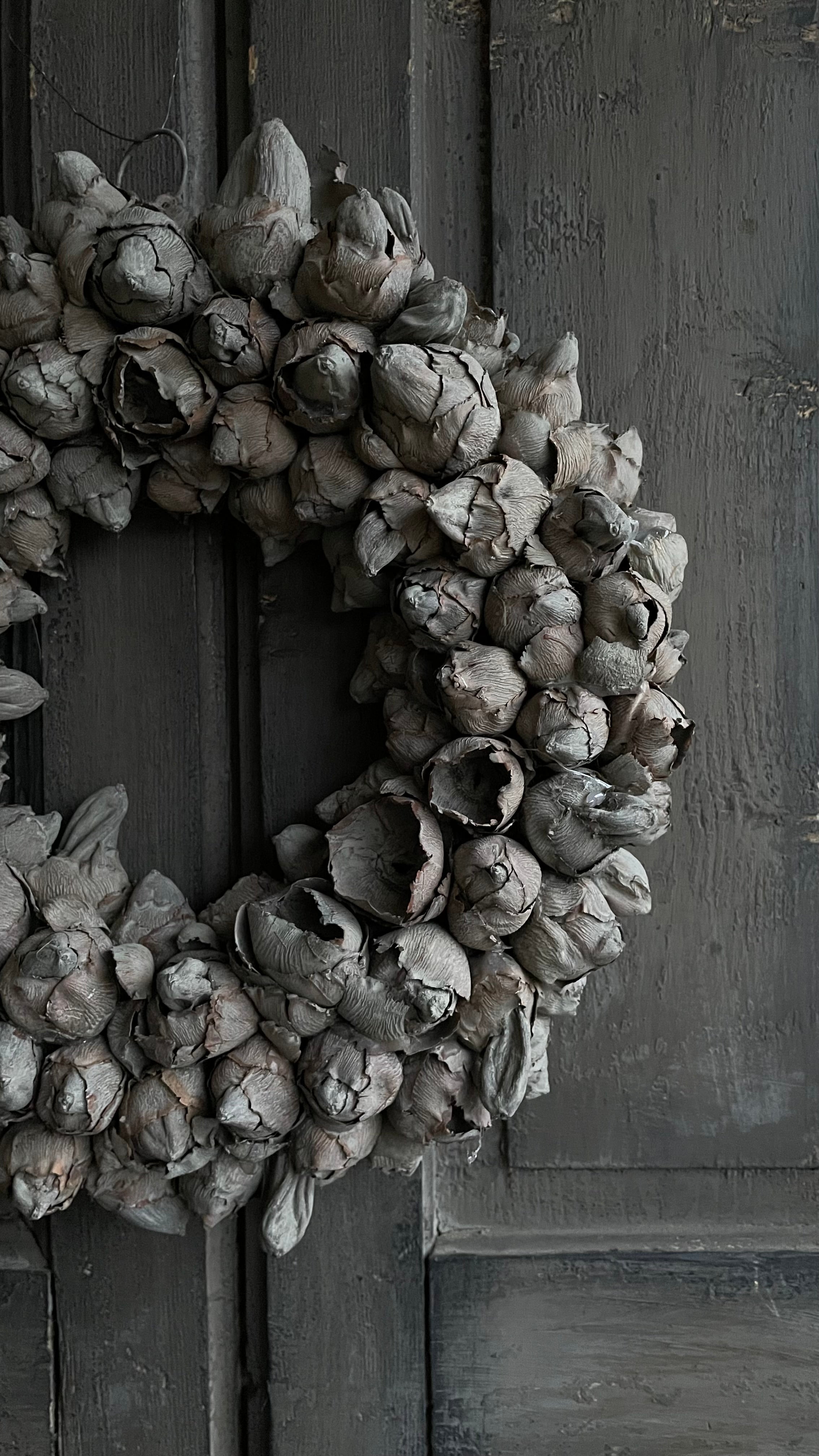 - Dieser Kokoskranz mit seiner wunderschönen, grau verwitterten Patina ist sehr stimmungsvoll.
