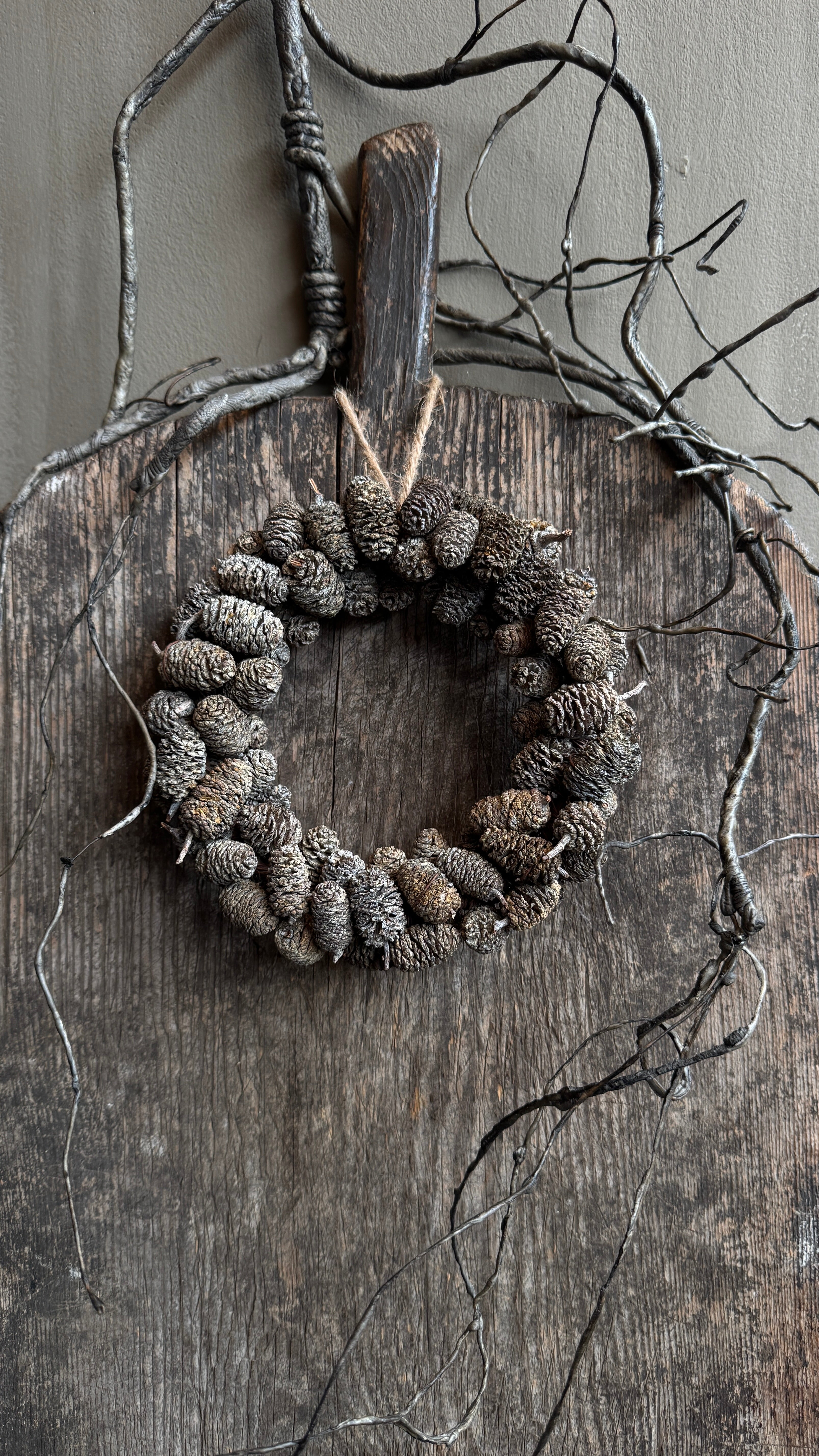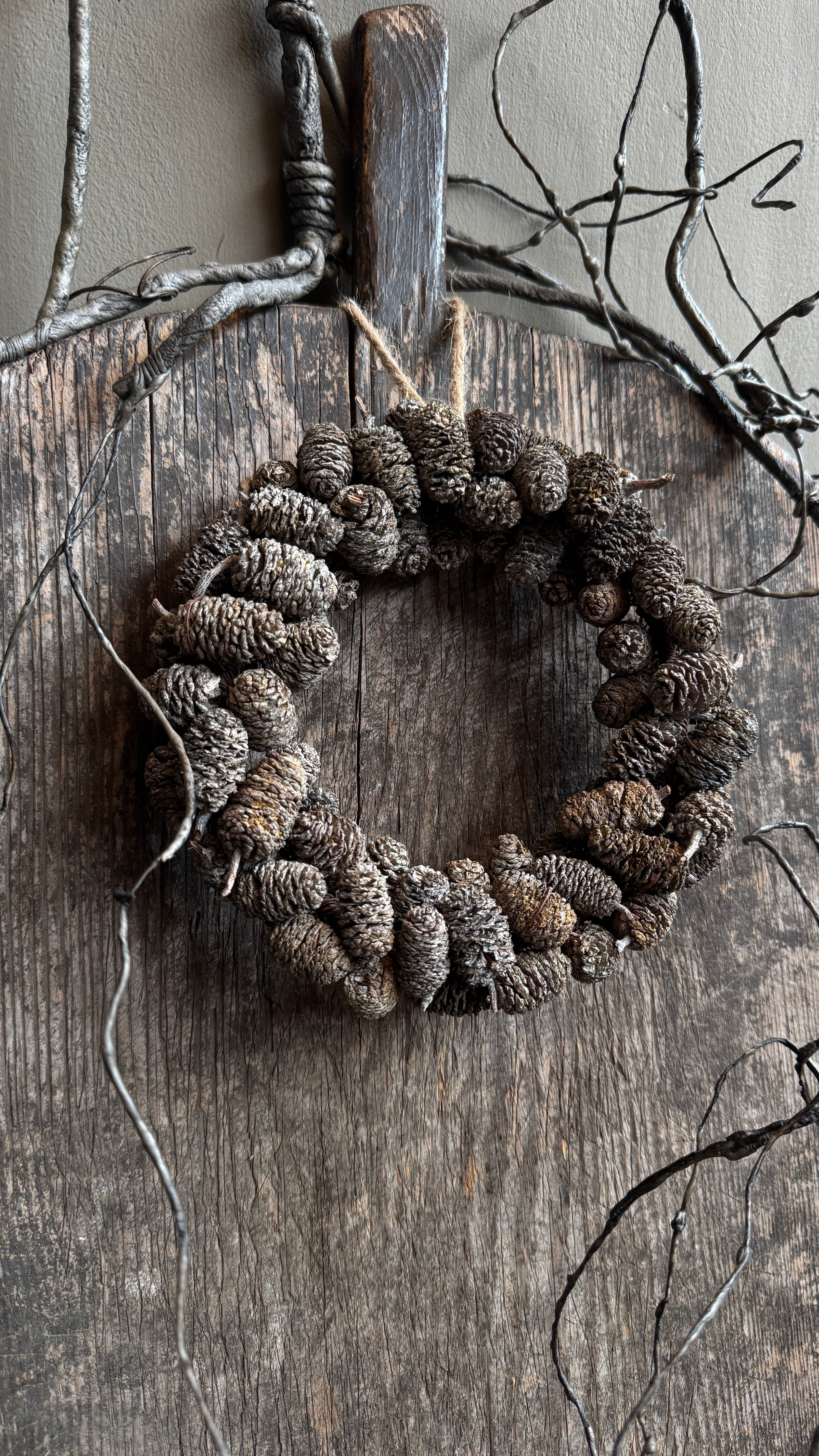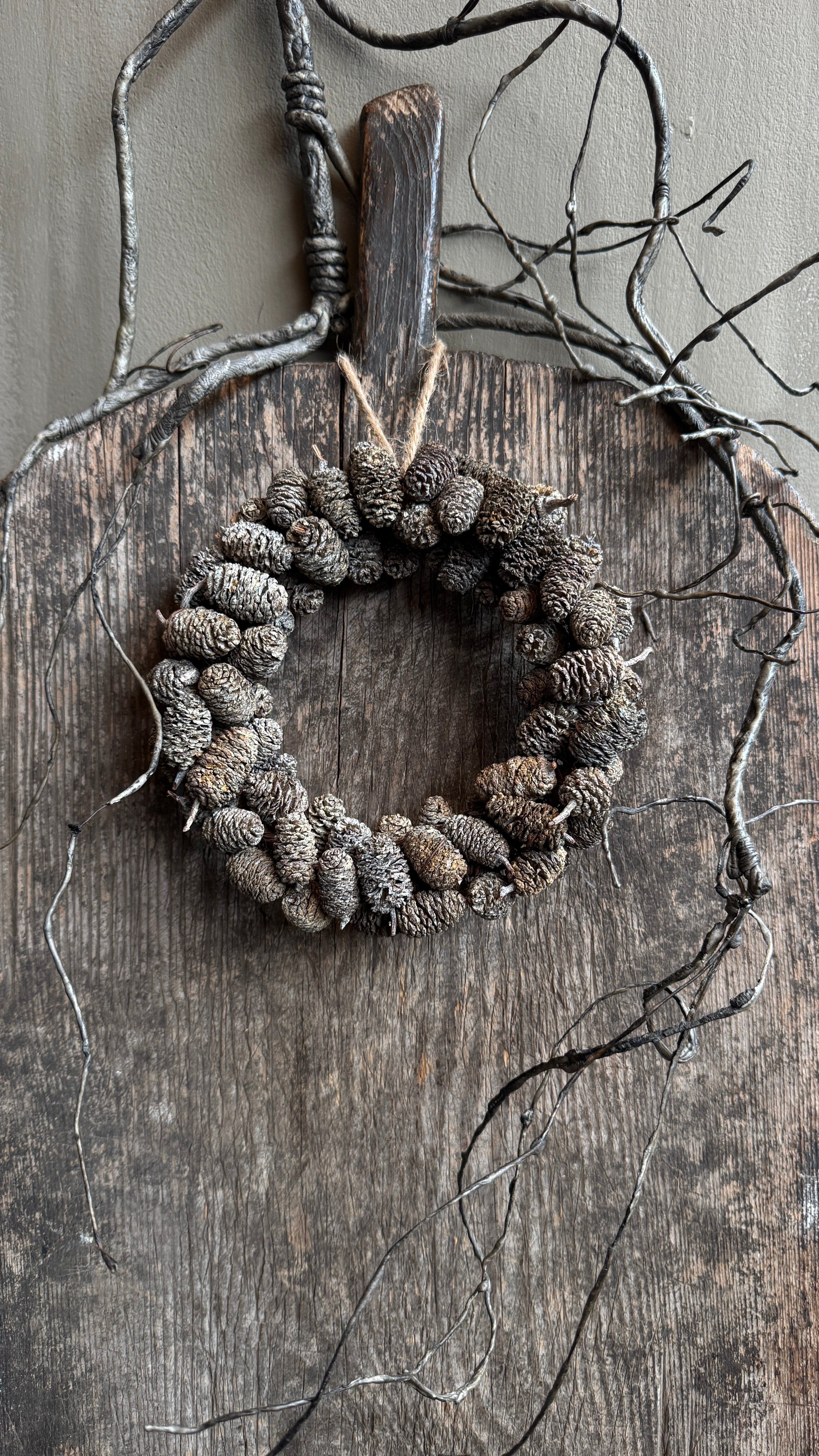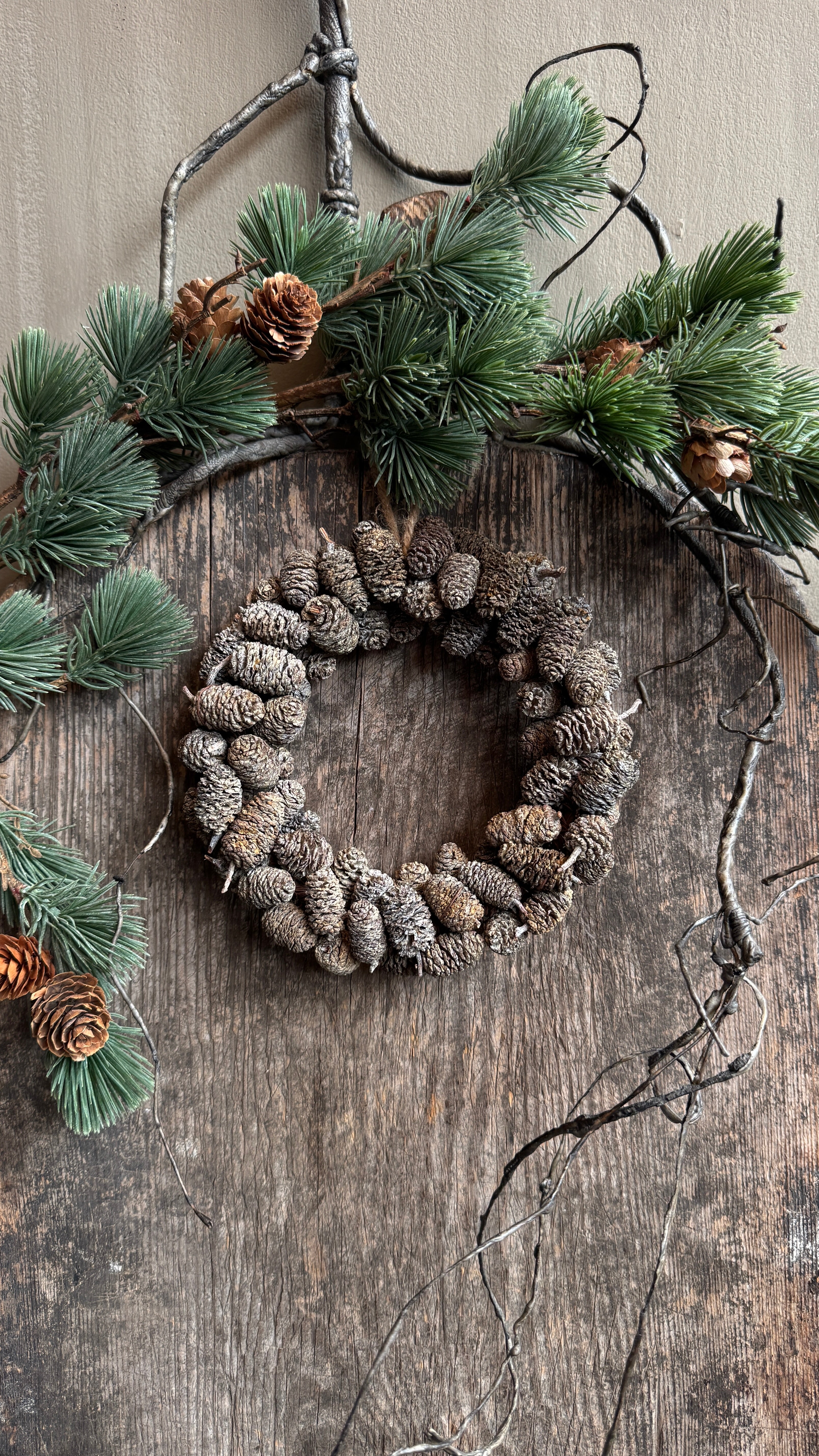 Deze kleine dennenappel krans heeft een stoere en sobere uitstraling en past perfect in een landelijk interieur.
