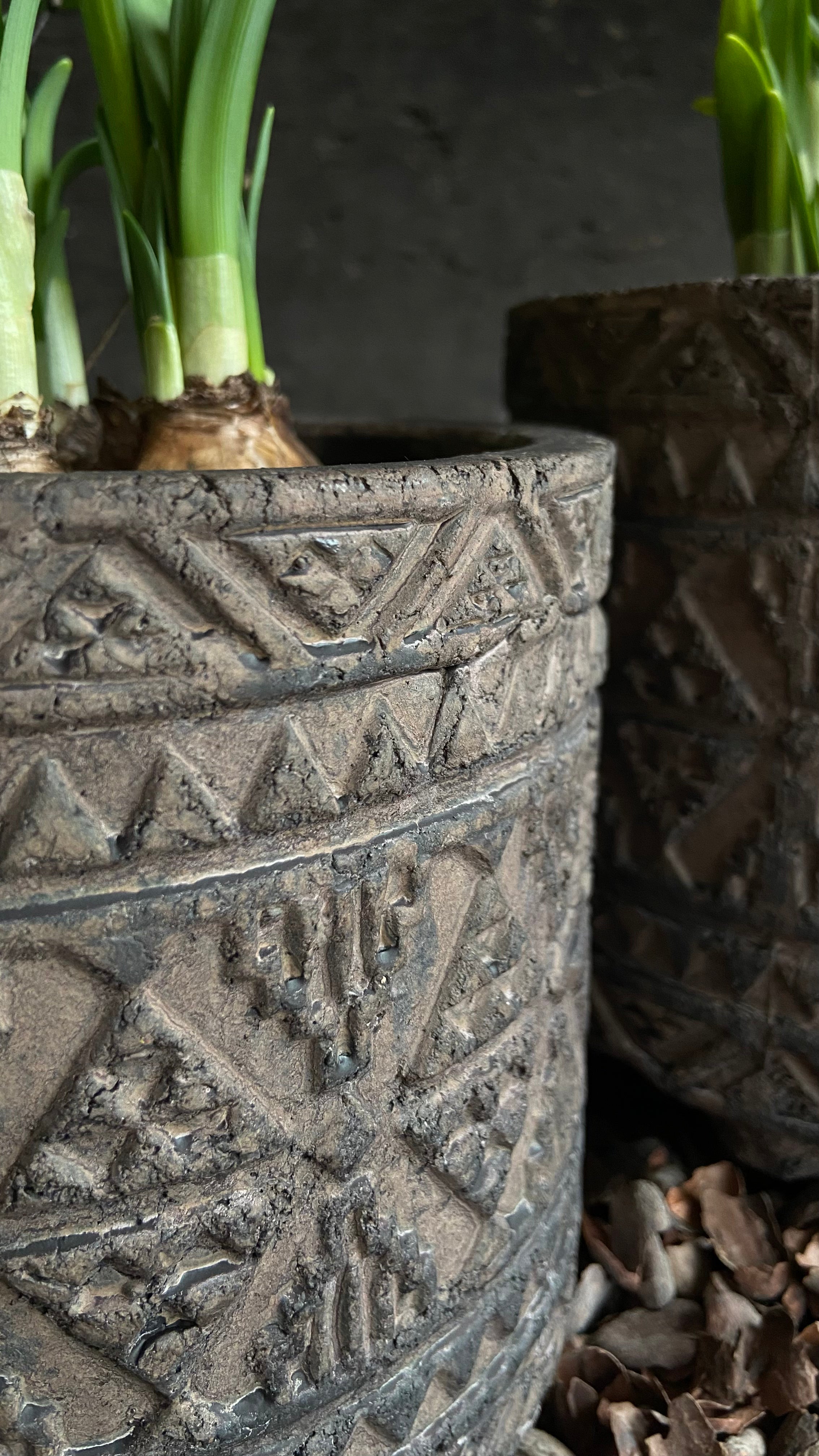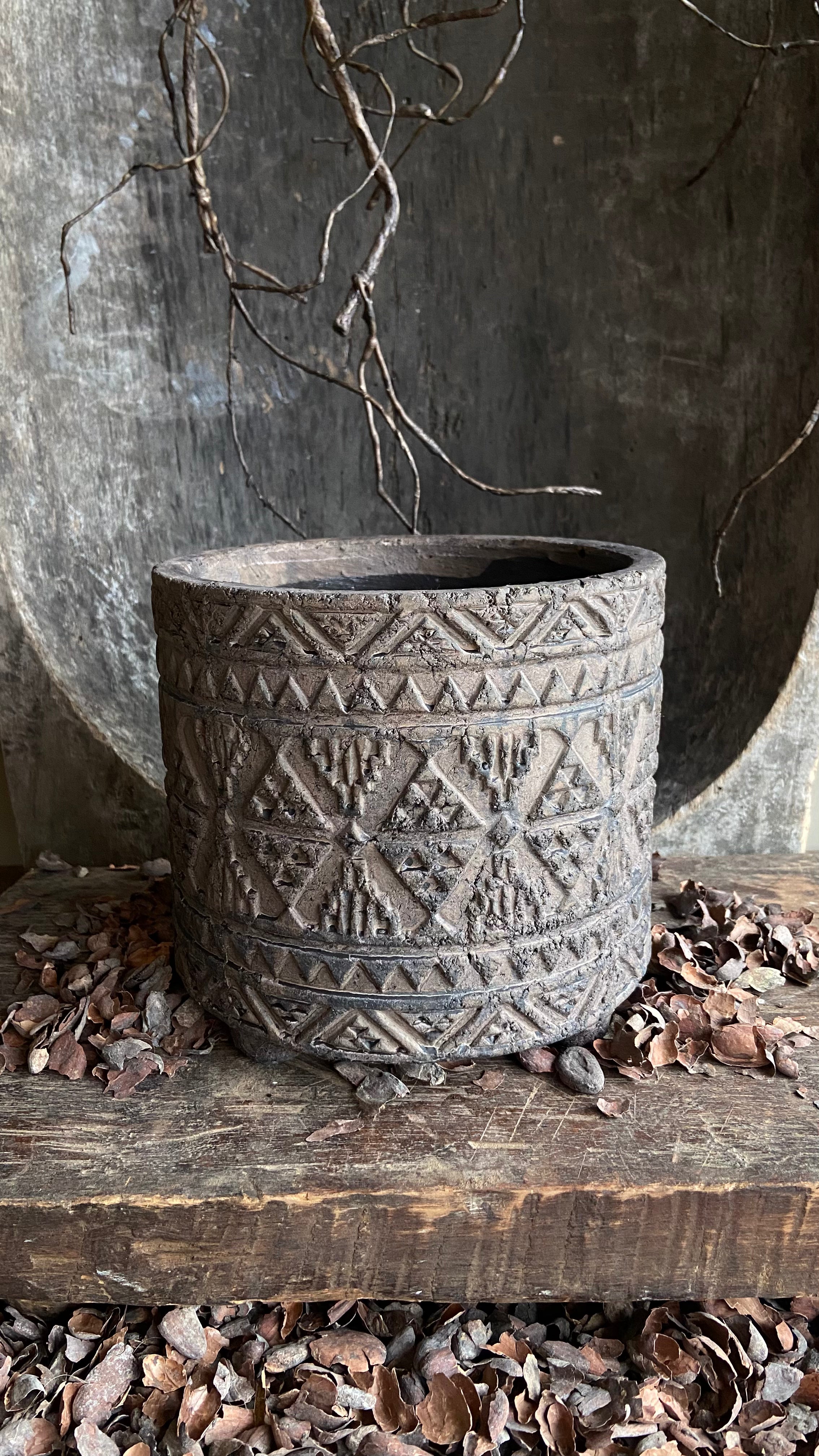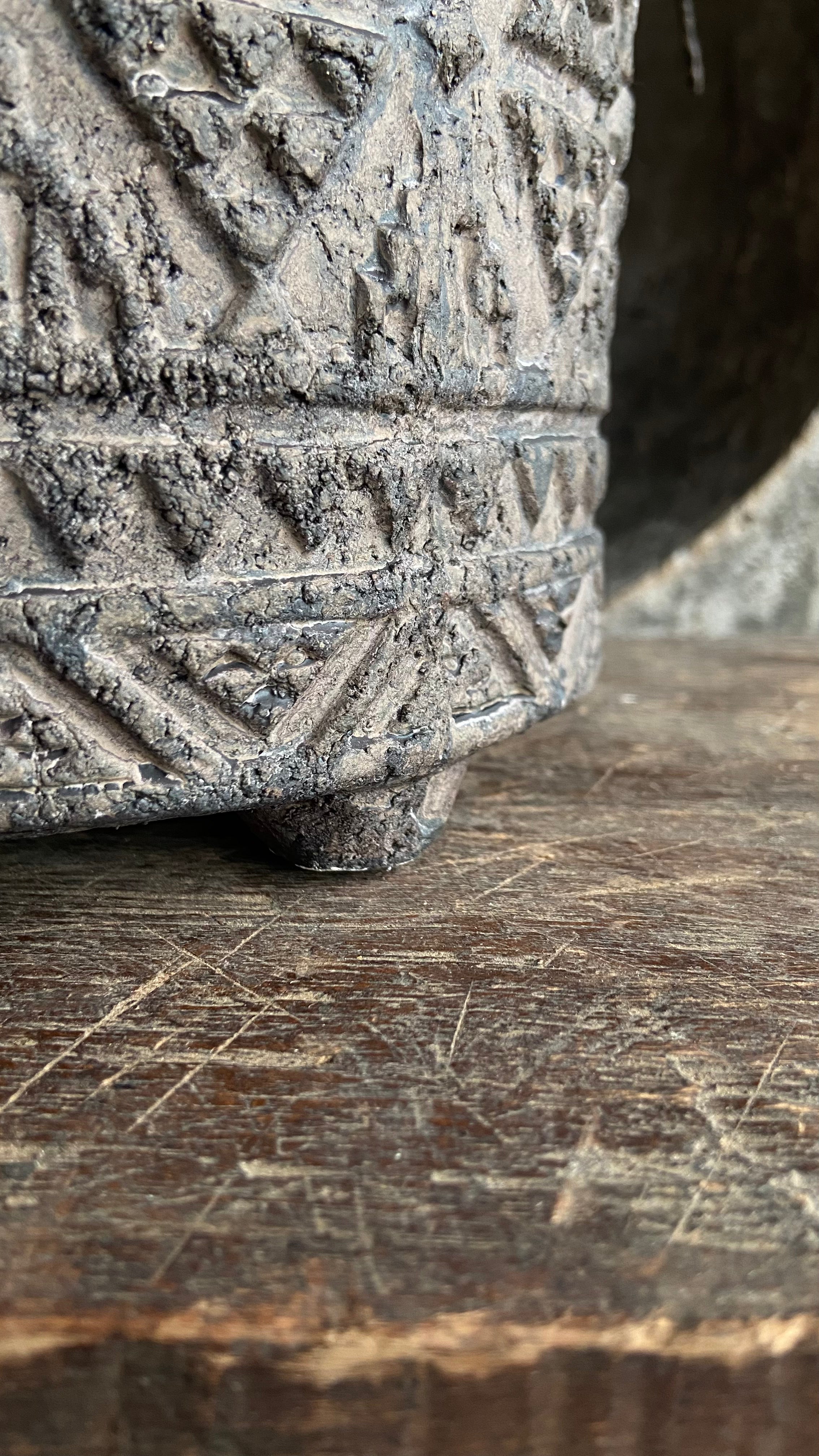 - Dieser Topf ist aus Stein und hat rundherum ein schönes Muster