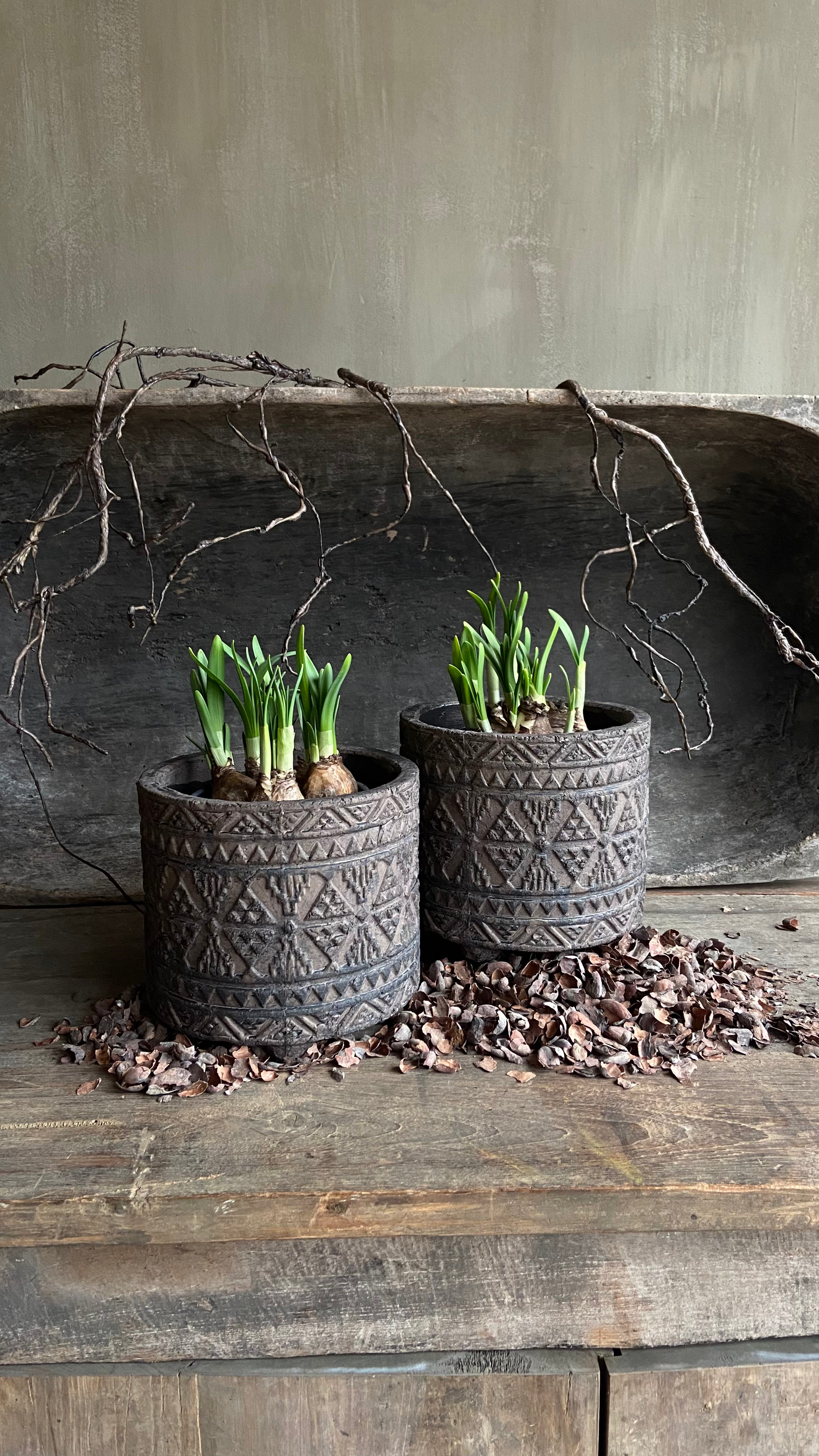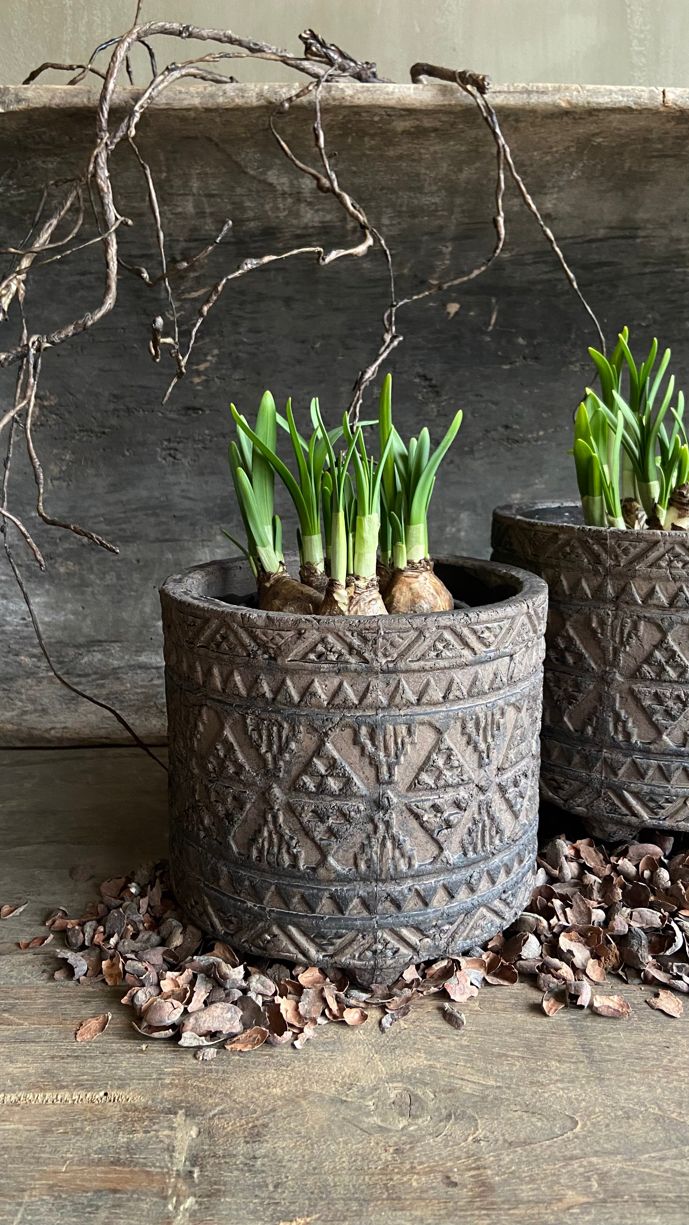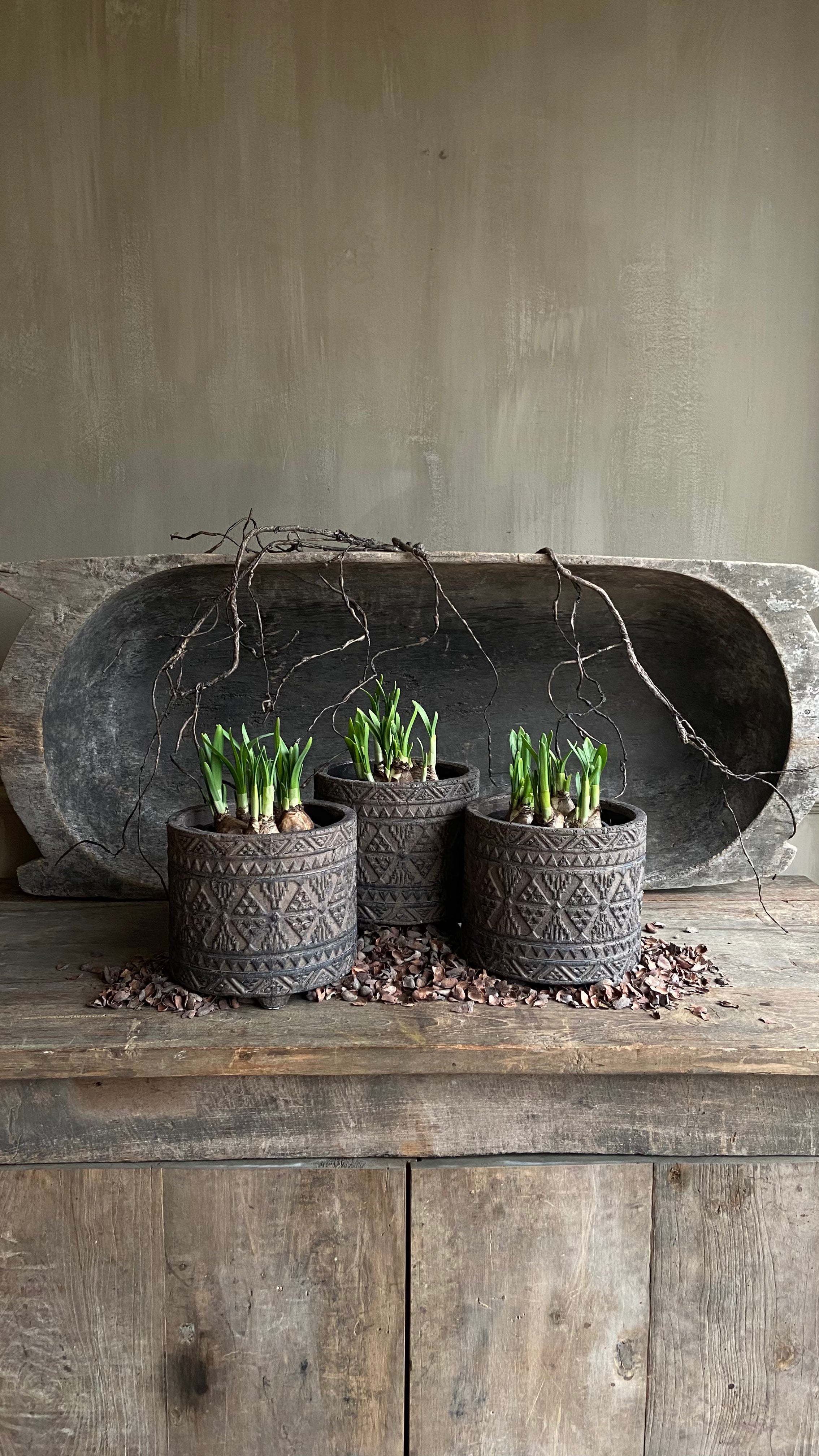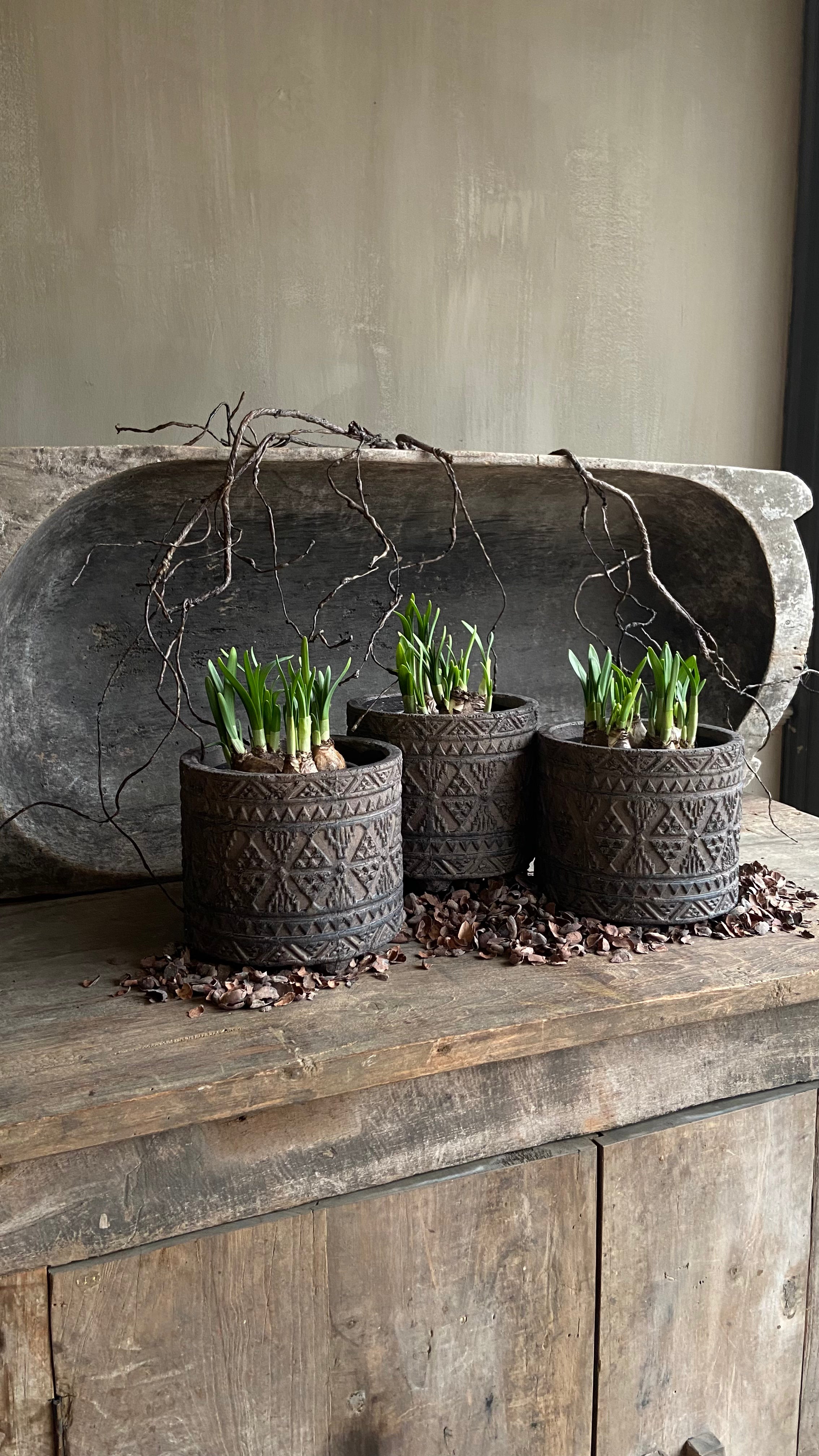 - Dieser Topf ist aus Stein und hat rundherum ein schönes Muster