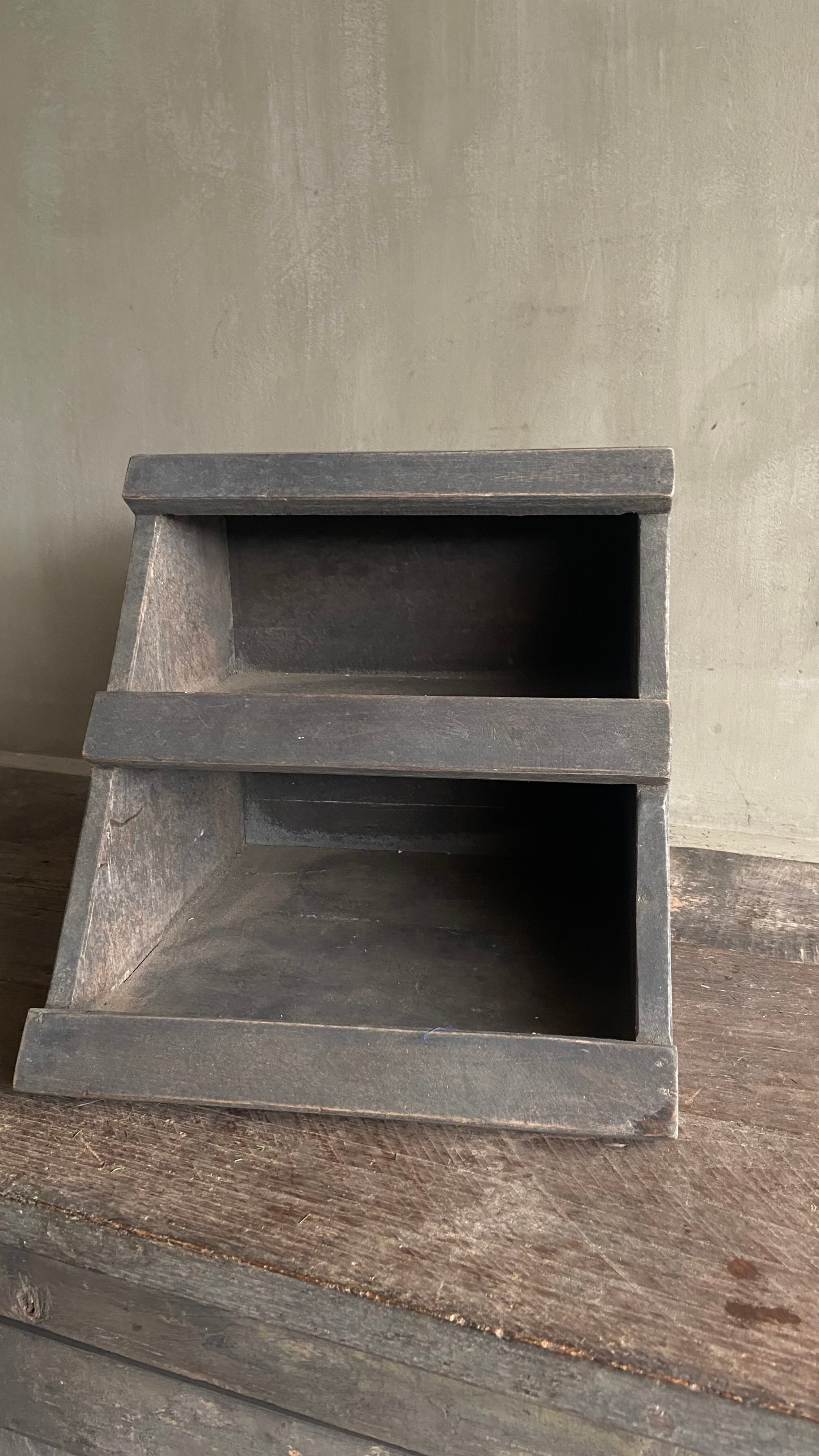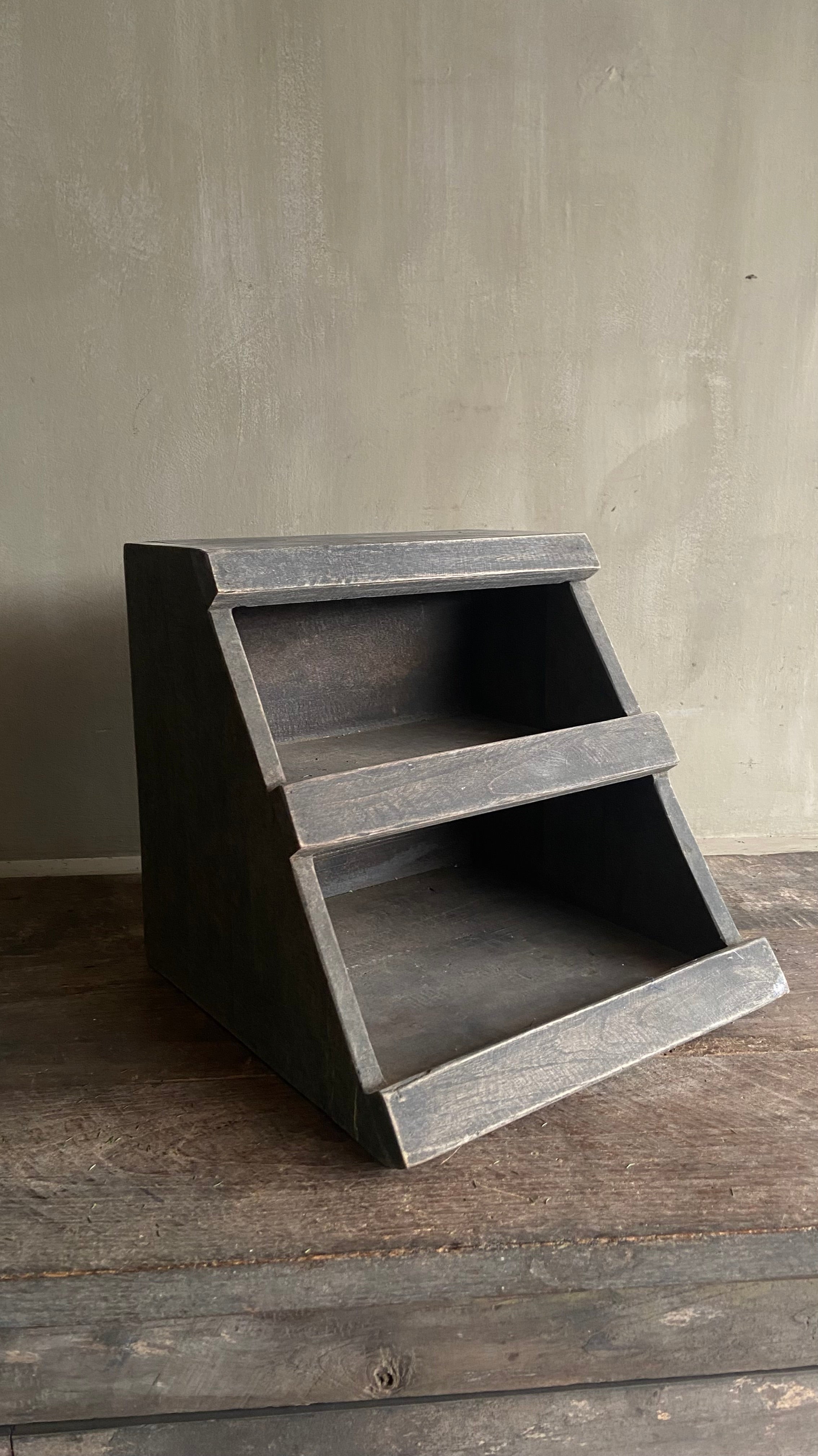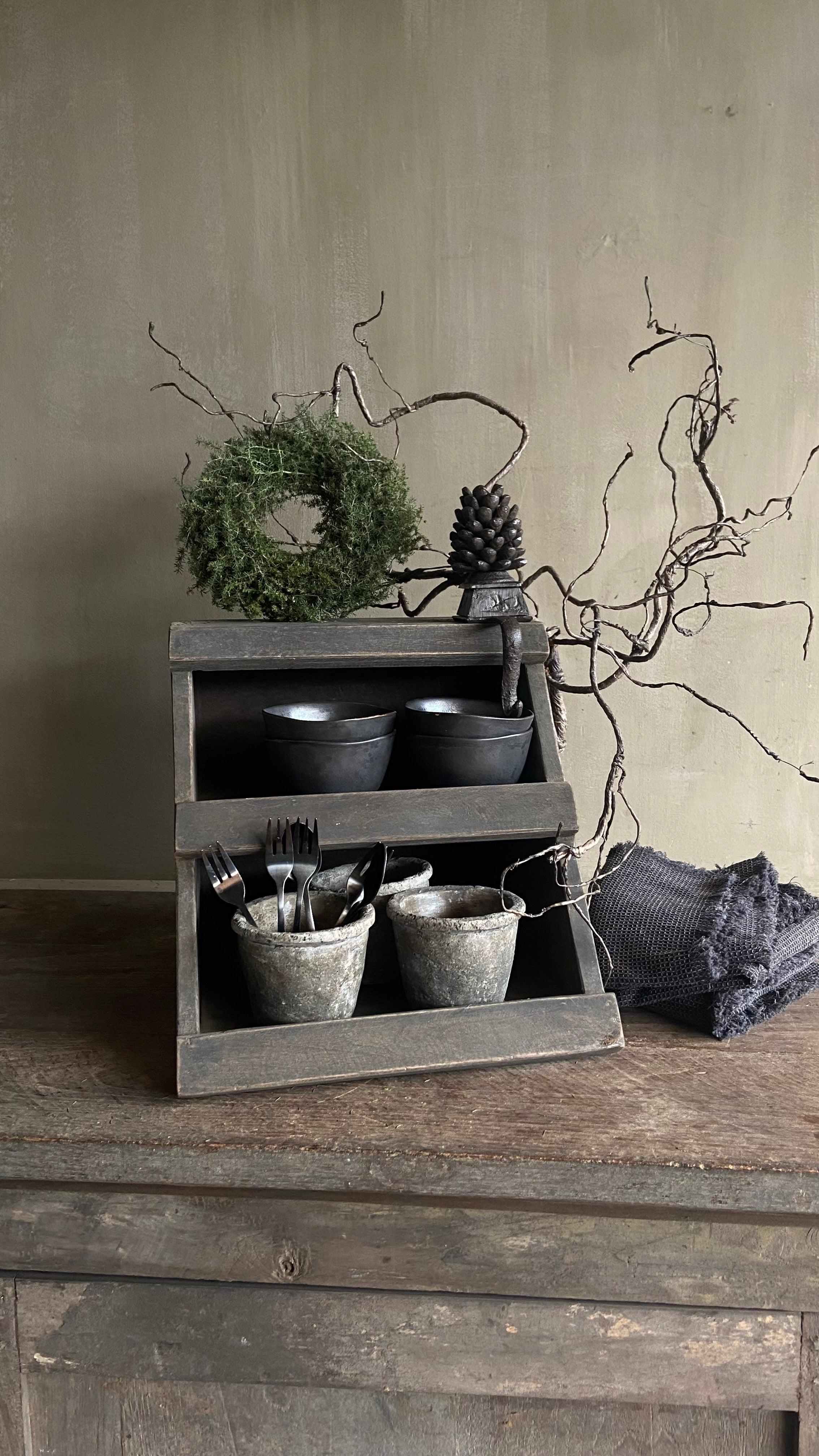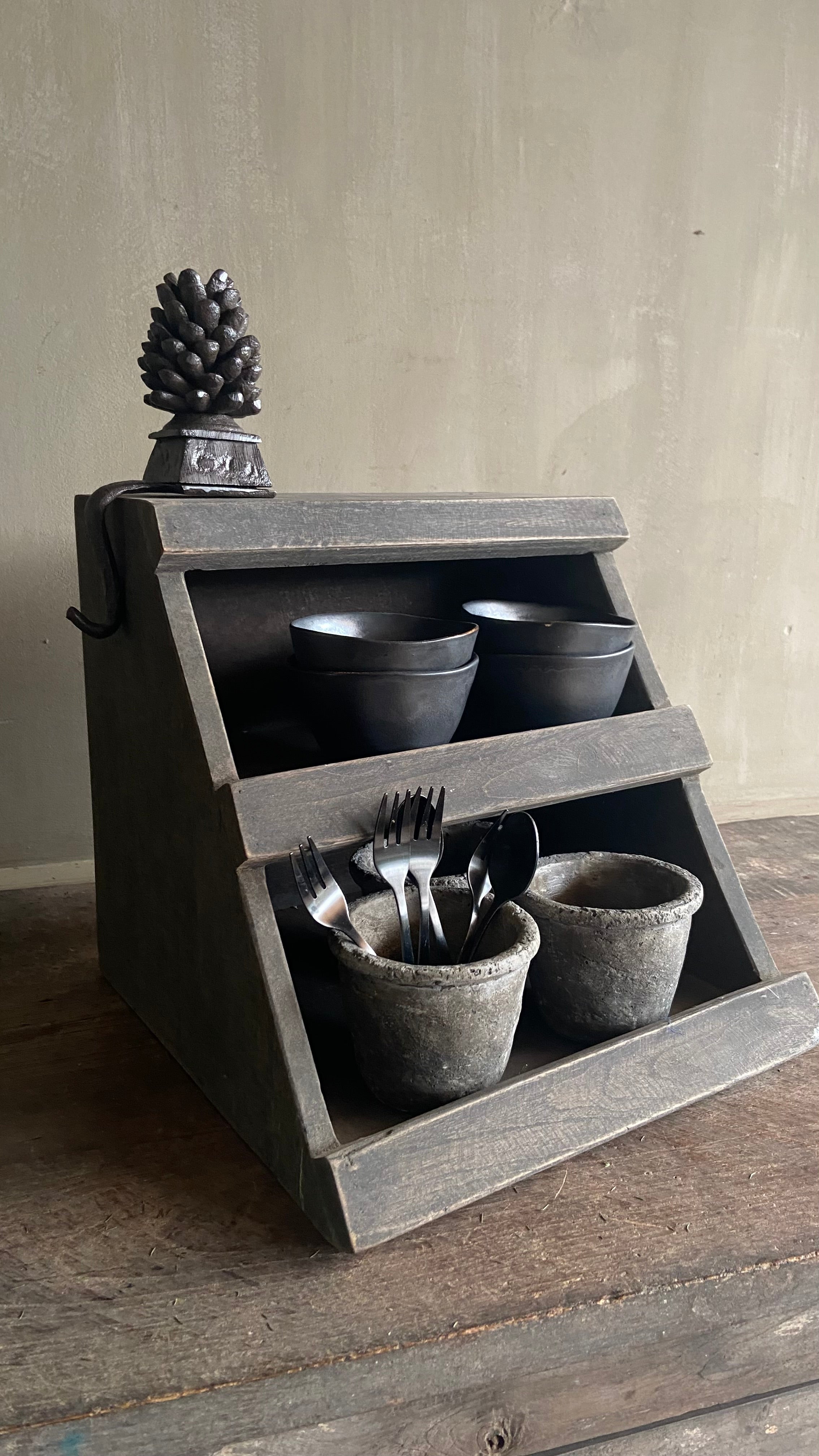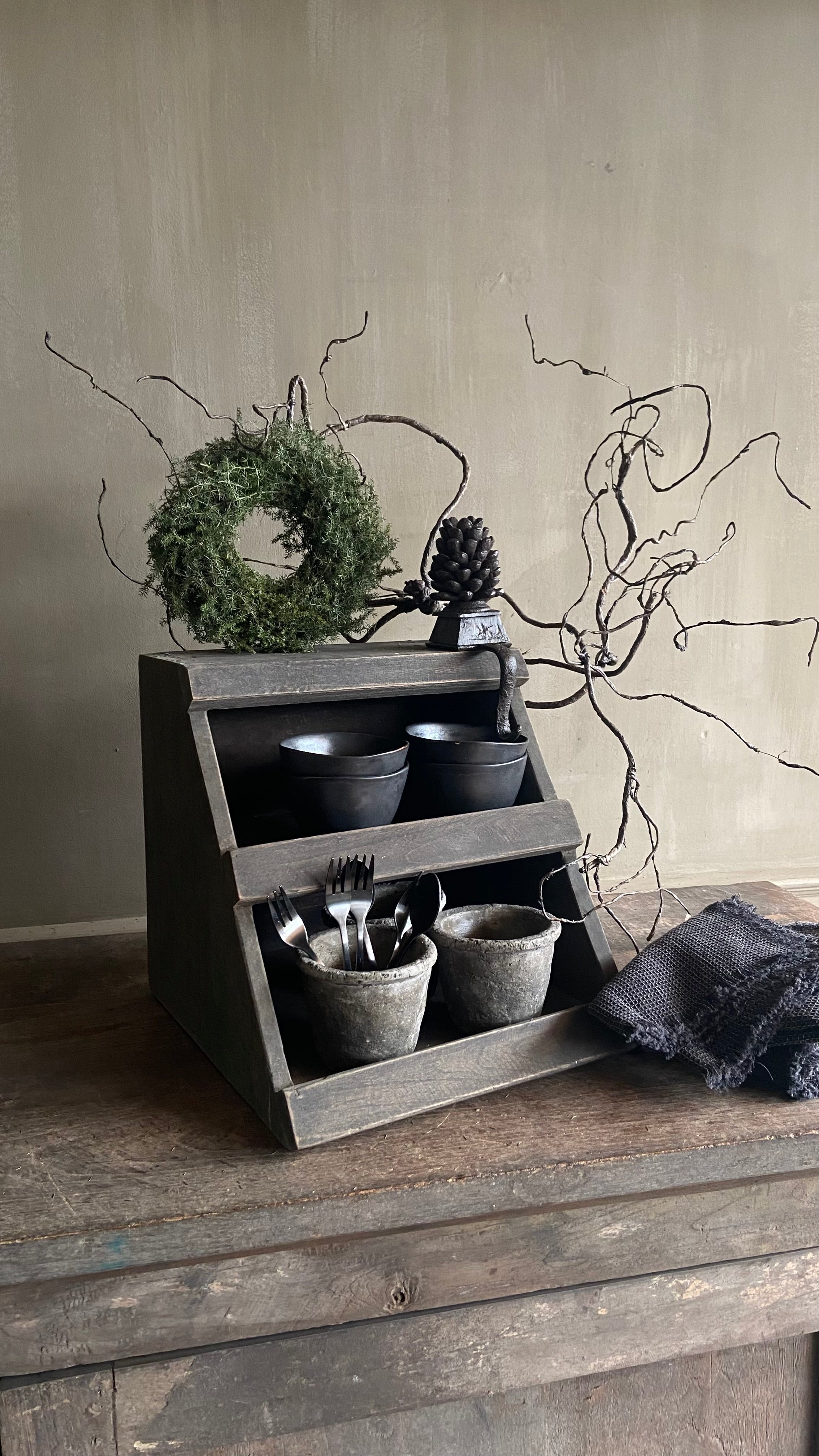 De bak heeft een verweerde donkergrijze afwerking, wat hem een robuuste en authentieke uitstraling geeft. Dankzij het tijdloze ontwerp past hij perfect in verschillende interieurstijlen, van modern tot landelijk. Ideaal voor op het aanrecht, in een kast of als decoratief item op tafel.
