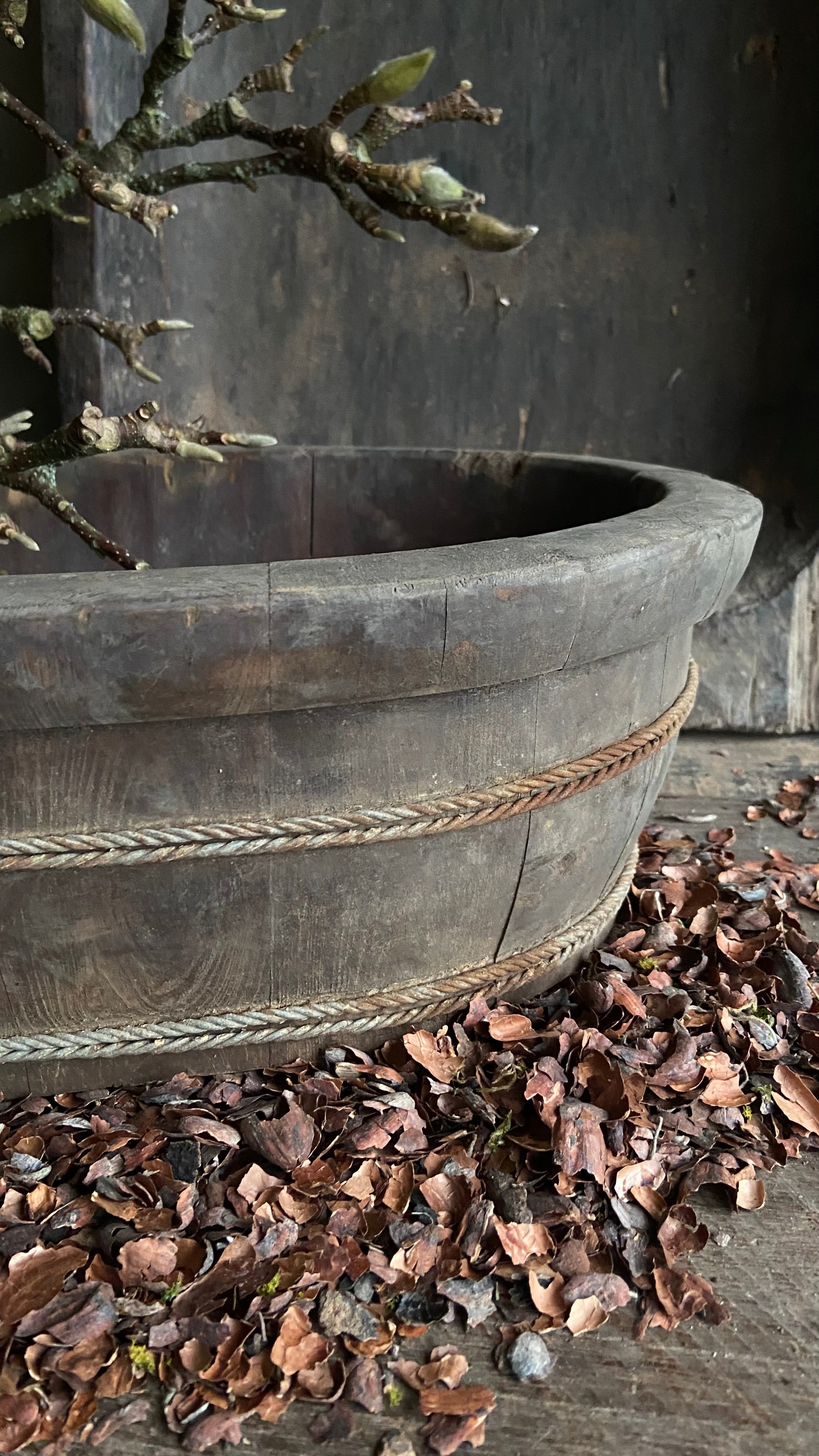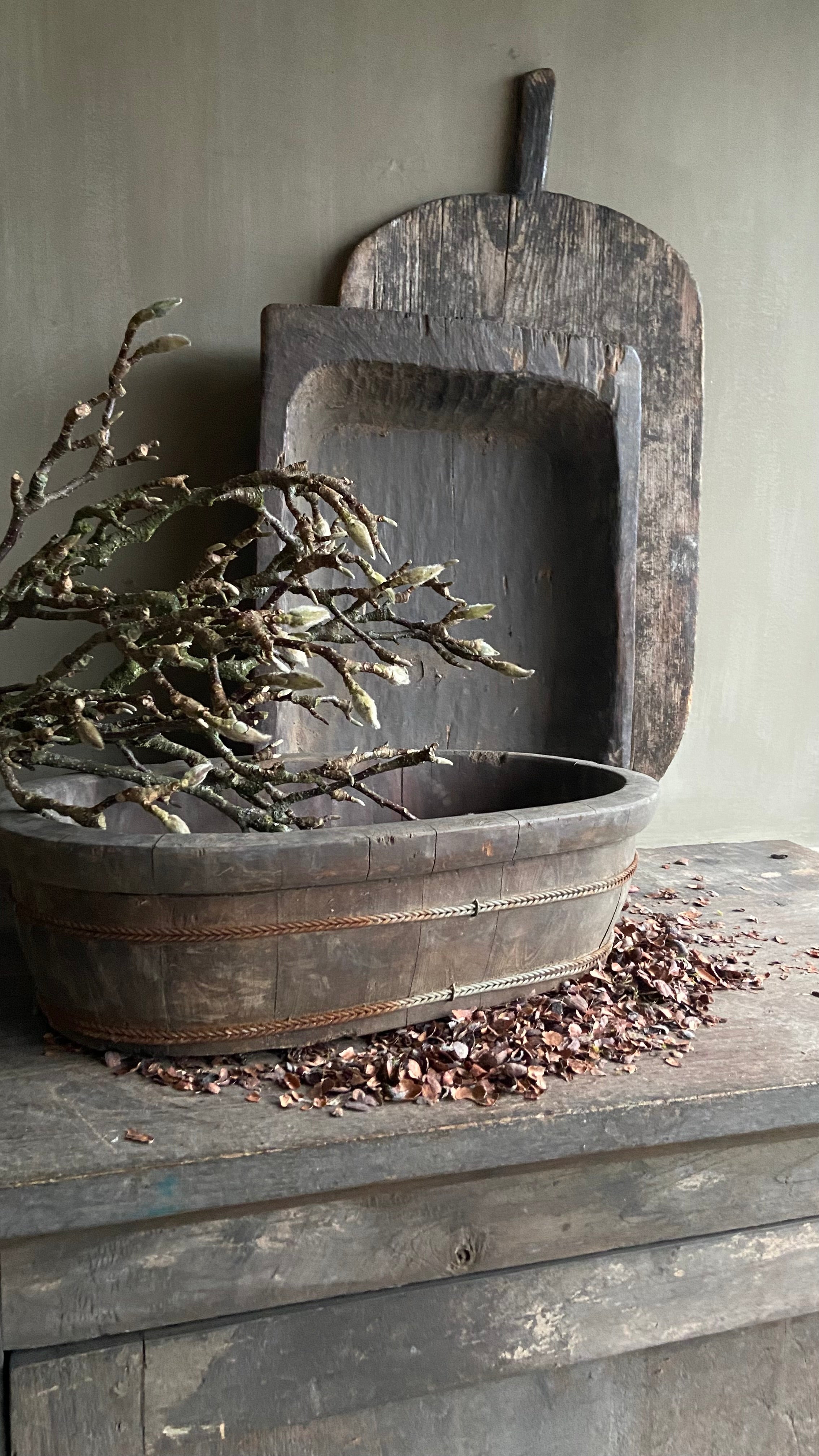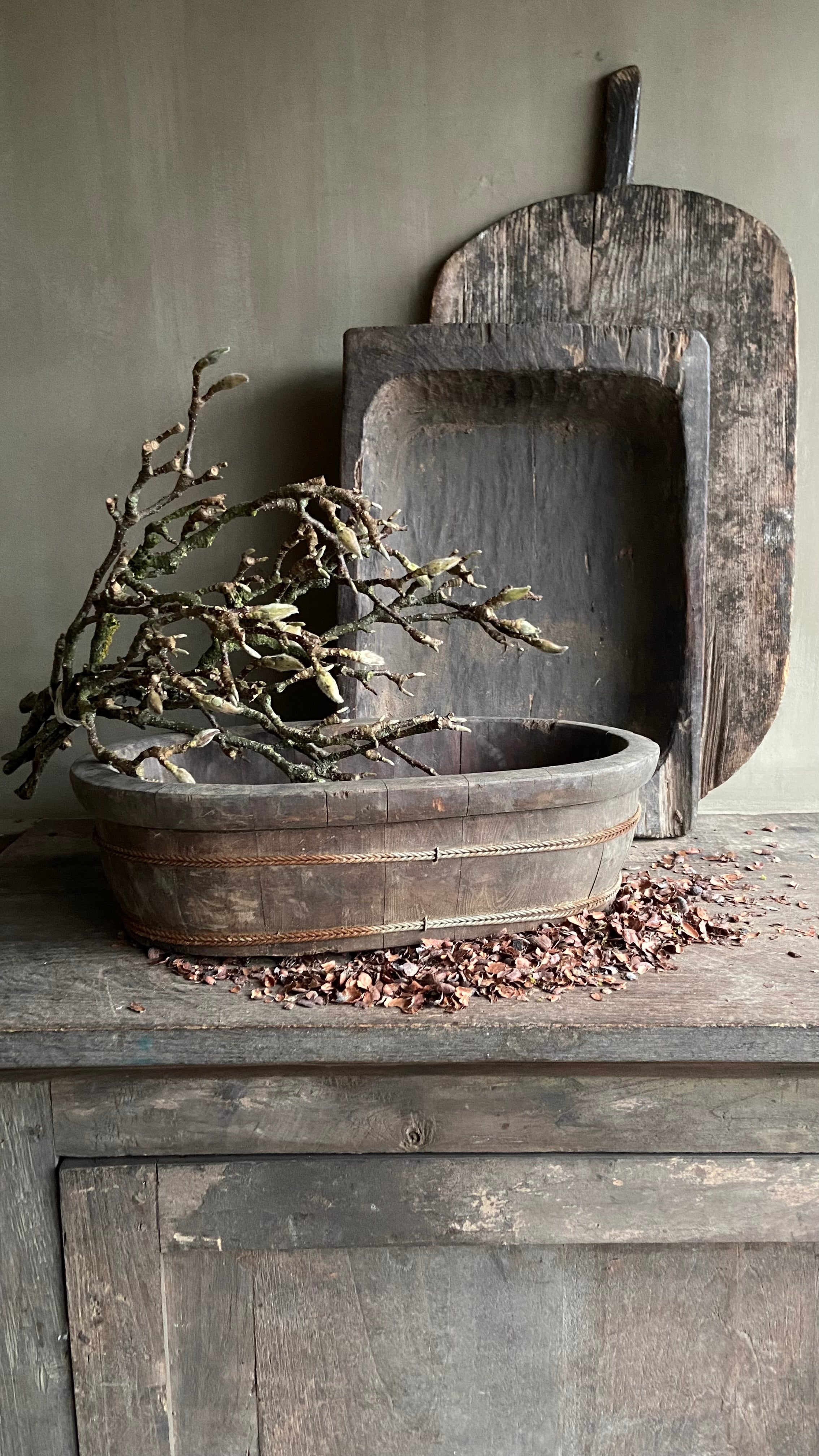 Deze oude houten olijfbak is een prachtig, doorleefd exemplaar met een authentieke uitstraling. Oorspronkelijk gebruikt bij het verwerken van olijven, draagt hij een uniek stukje geschiedenis met zich mee. De verweerde houtstructuur en natuurlijke veroudering zorgen voor een robuuste en karaktervolle look.