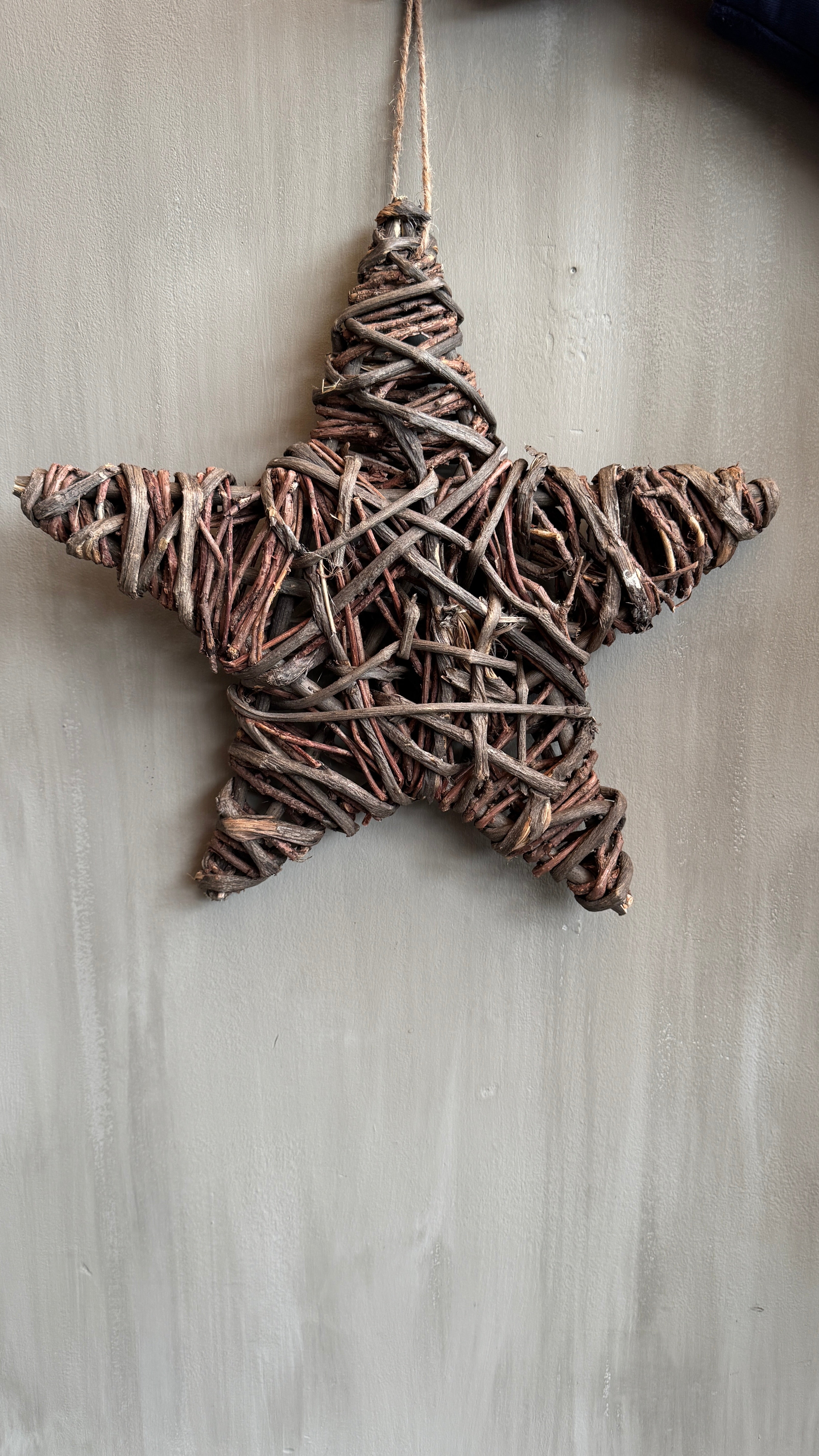 Met de hand gemaakt van gevlochten takken en hout. Het grove vlechtwerk en de vergrijsde kleur geven de ster een doorleefde look, waardoor elk exemplaar uniek is.