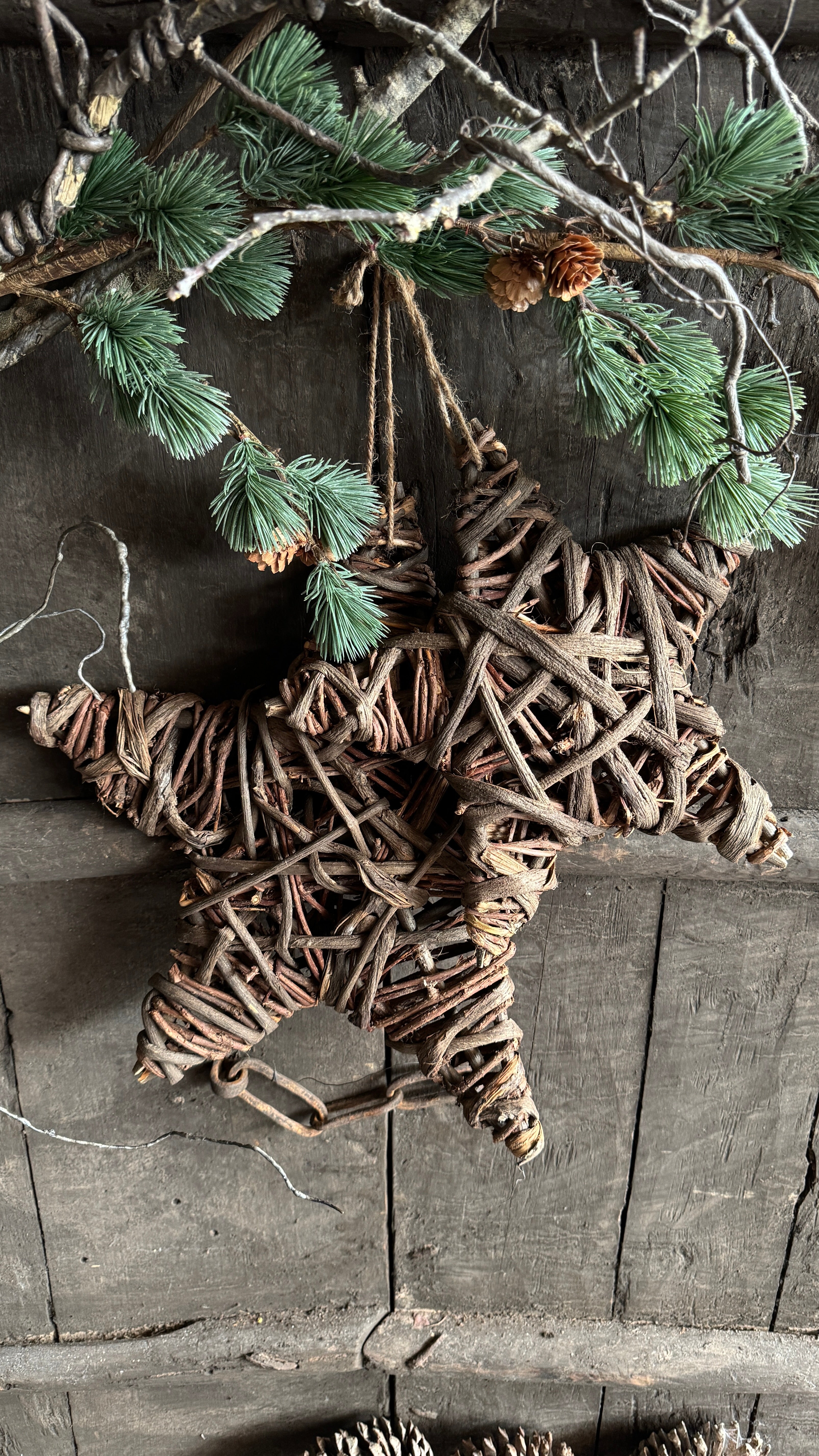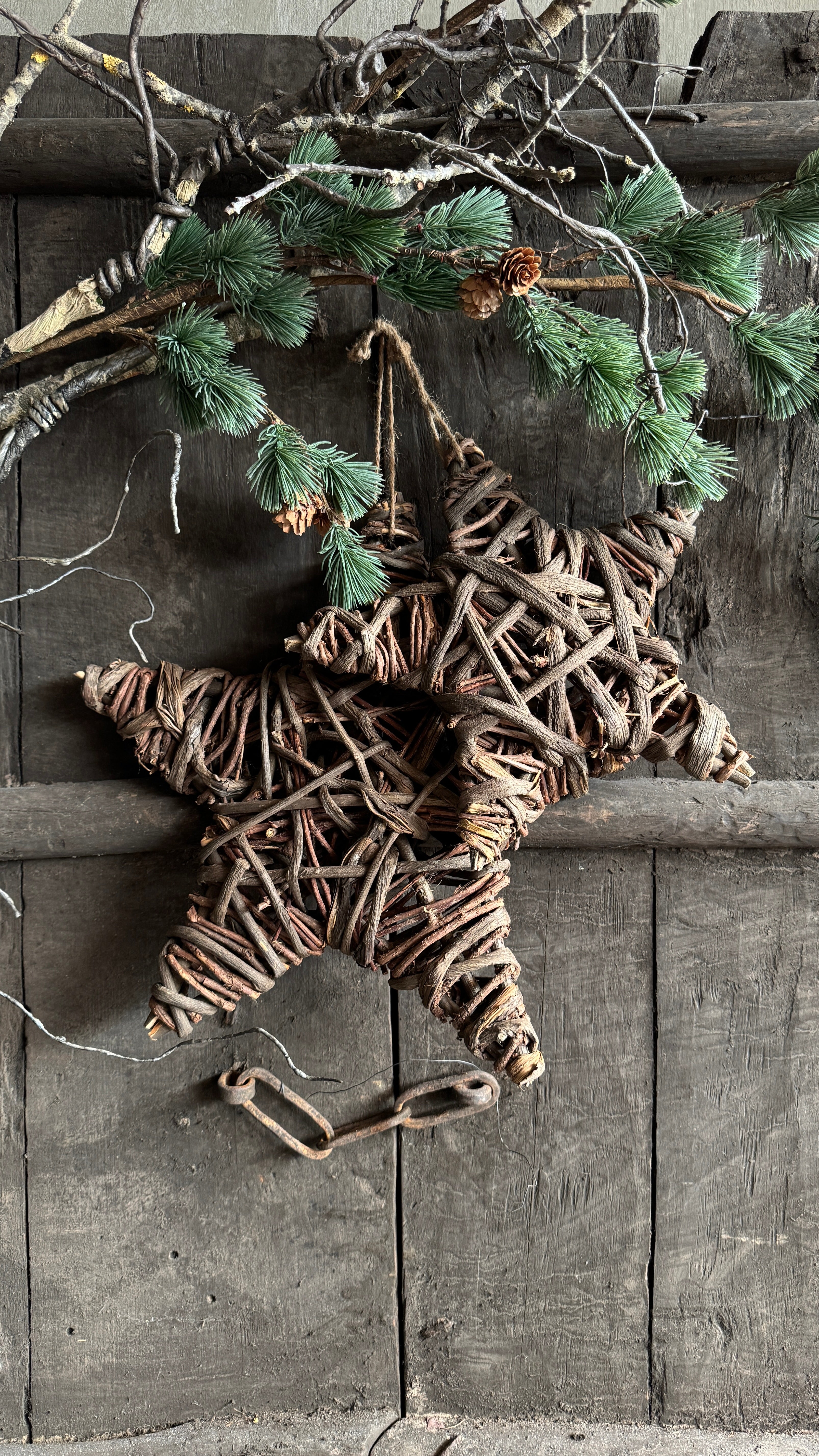 Met de hand gemaakt van gevlochten takken en hout. Het grove vlechtwerk en de vergrijsde kleur geven de ster een doorleefde look, waardoor elk exemplaar uniek is.