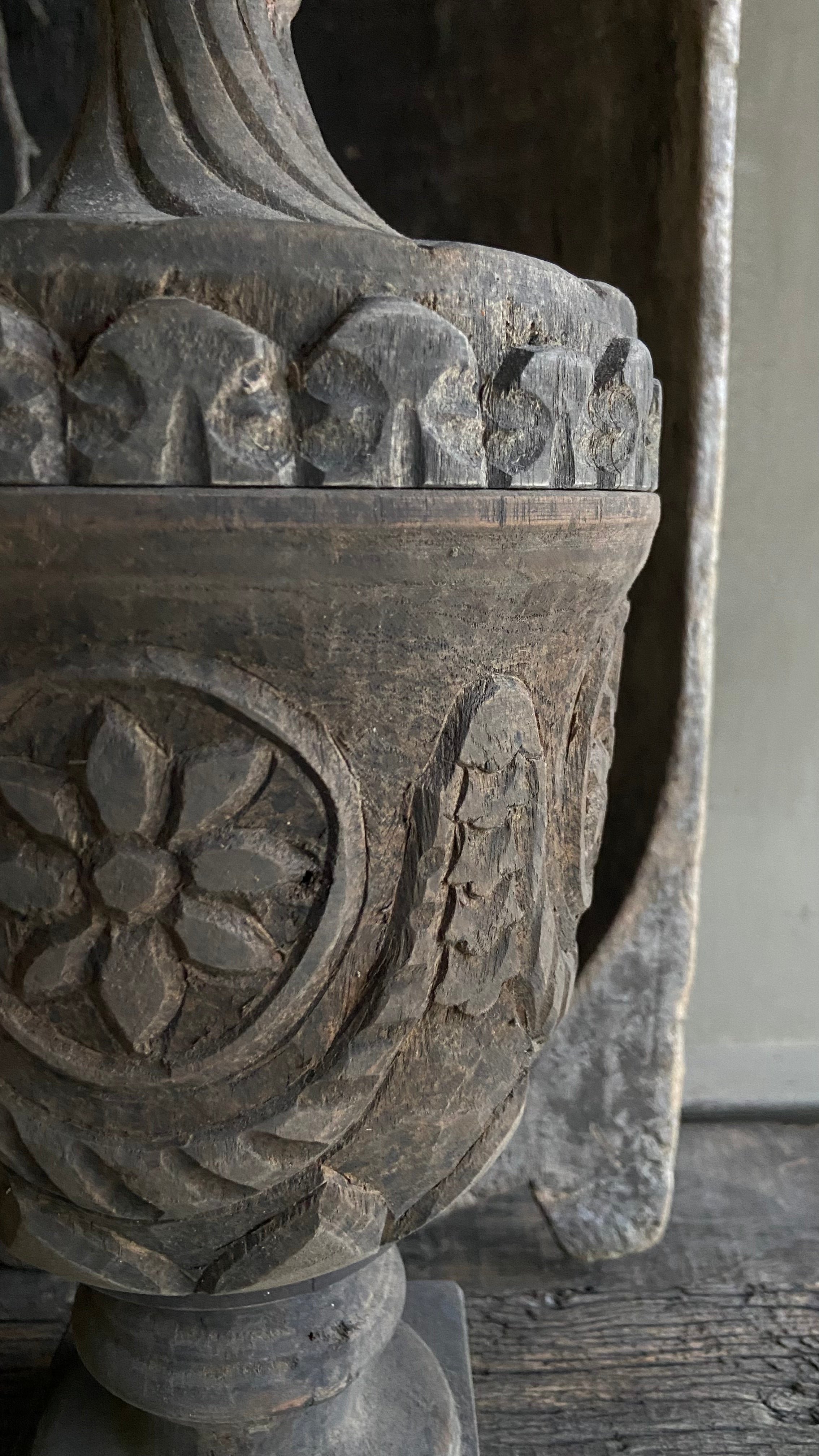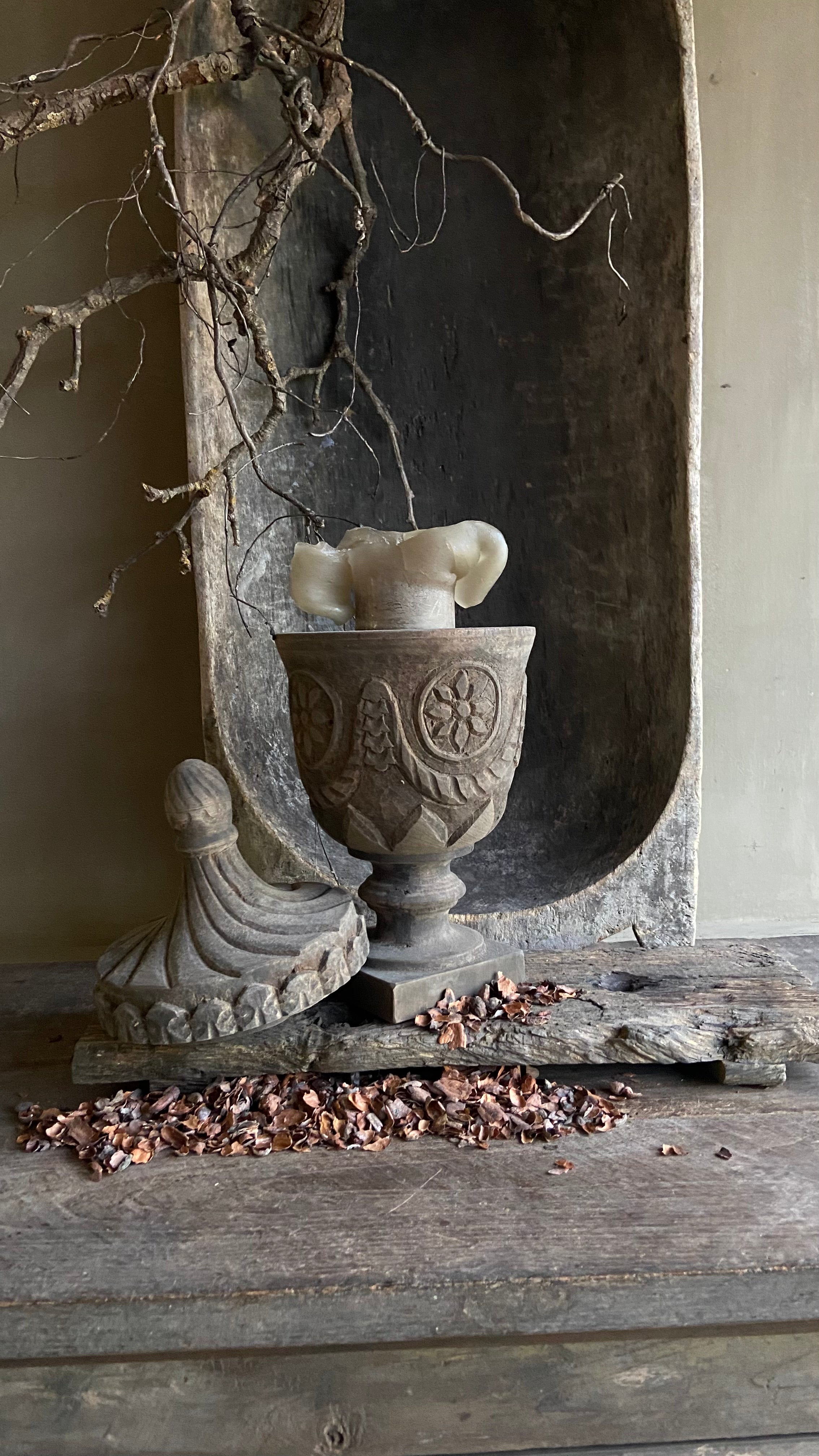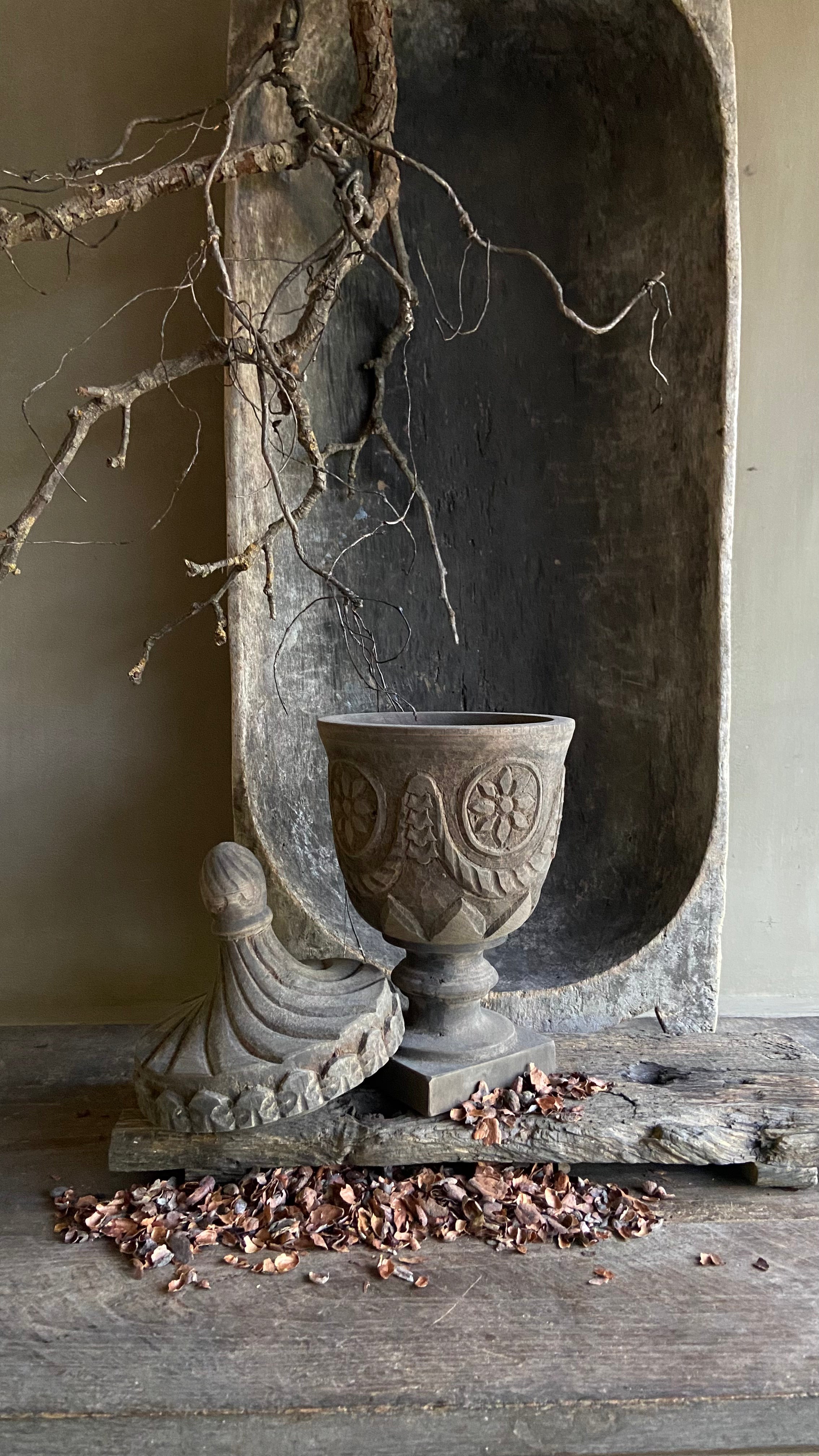 Deze houten kelk met deksel van LUKSA Home Collection heeft een stoere, verweerde grijze afwerking en is rondom rijk bewerkt met een mooi reliëf. De kelk voelt stevig aan en heeft een robuuste uitstraling die goed past in een sober en stijlvol interieur.