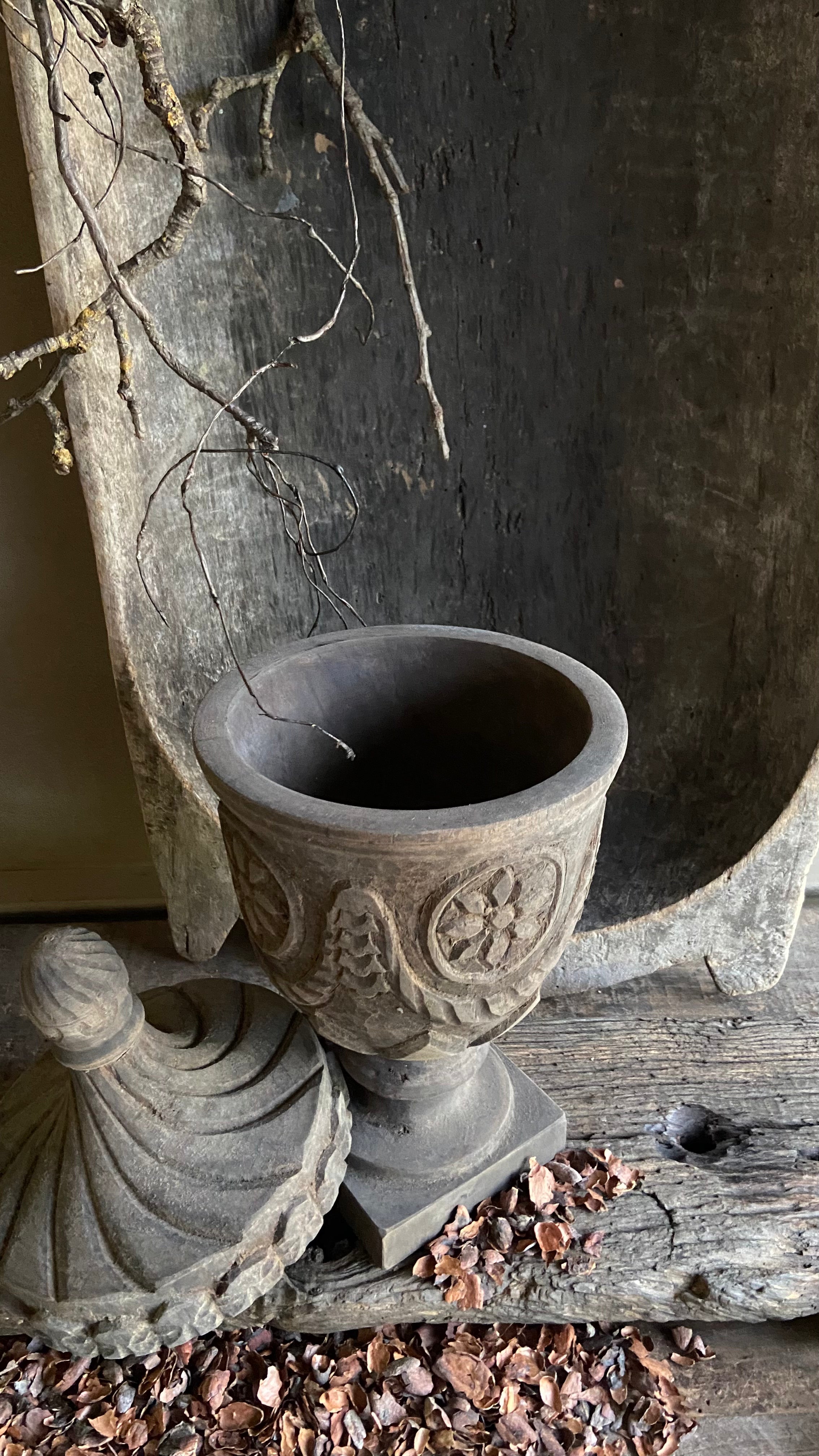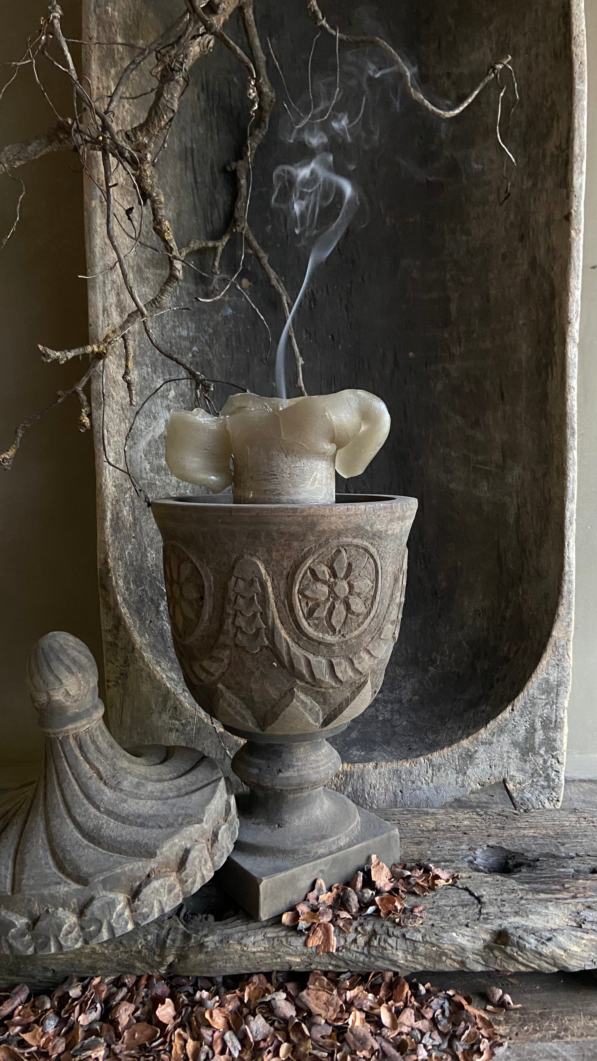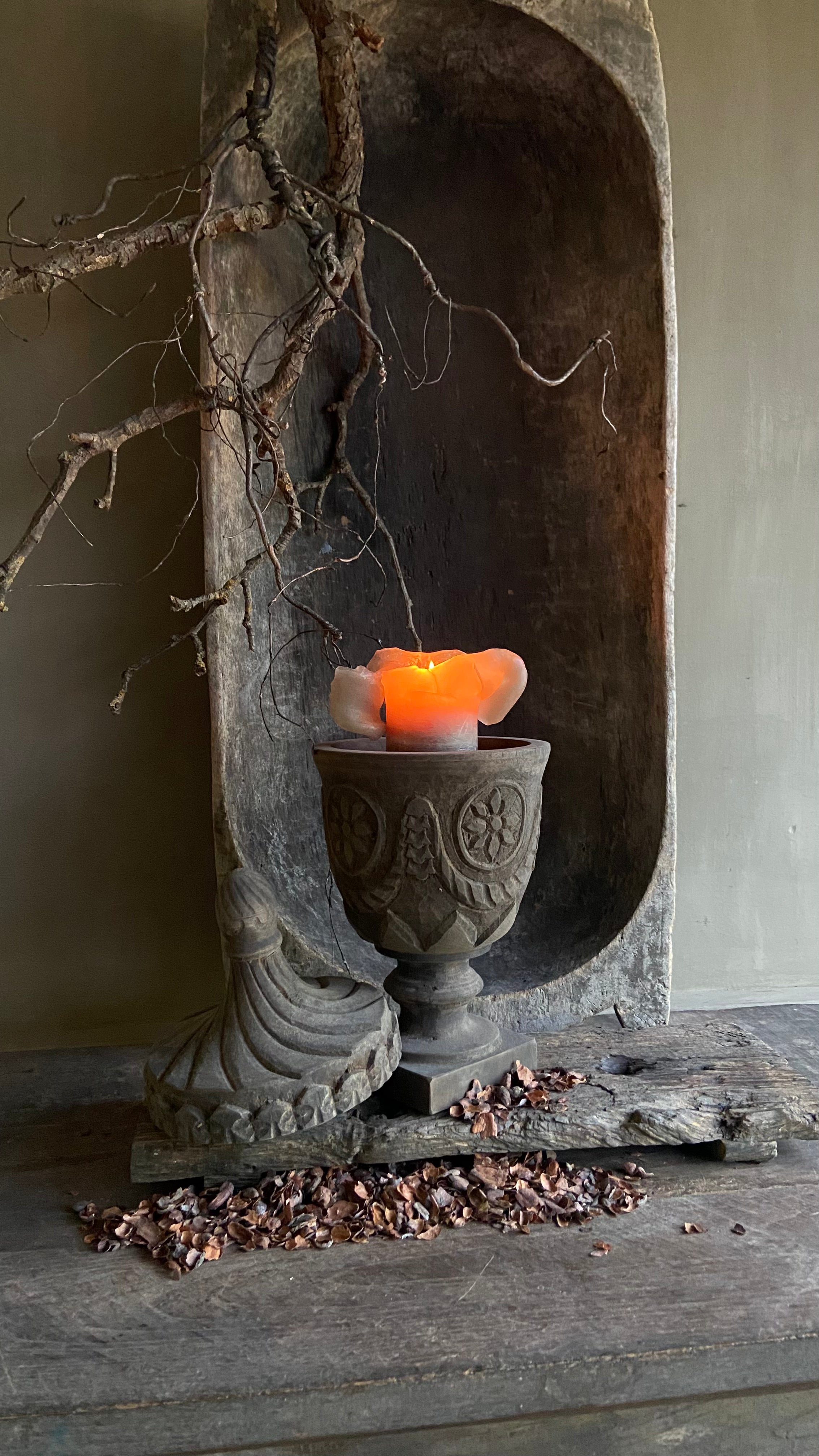 Deze houten kelk met deksel van LUKSA Home Collection heeft een stoere, verweerde grijze afwerking en is rondom rijk bewerkt met een mooi reliëf. De kelk voelt stevig aan en heeft een robuuste uitstraling die goed past in een sober en stijlvol interieur.