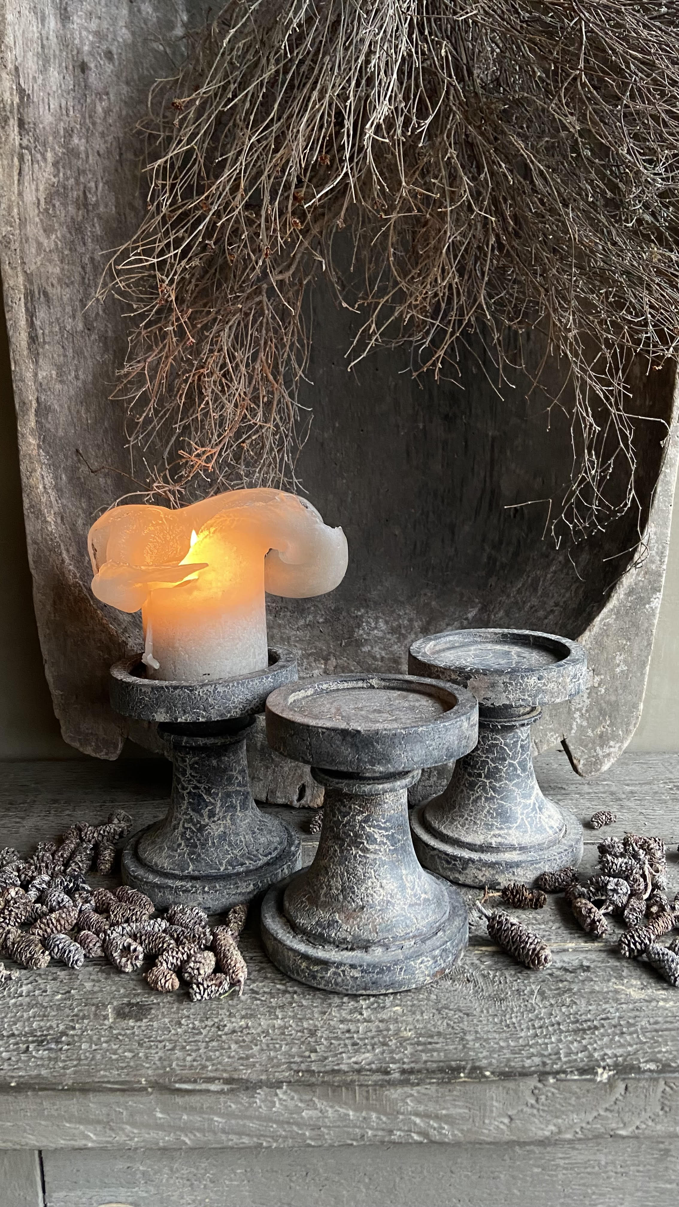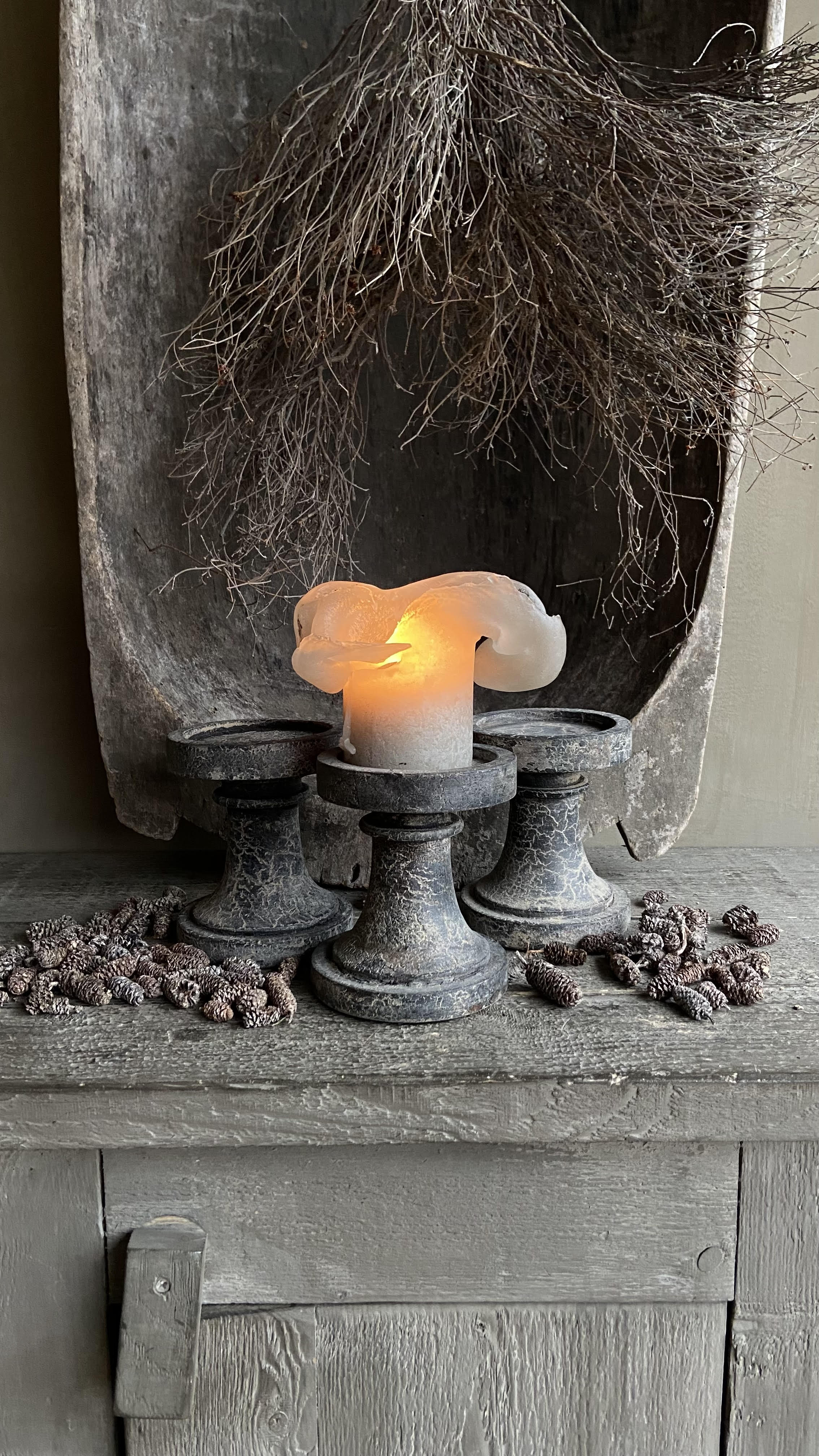 - El candelabro está hecho de madera y tiene un acabado tierra.
