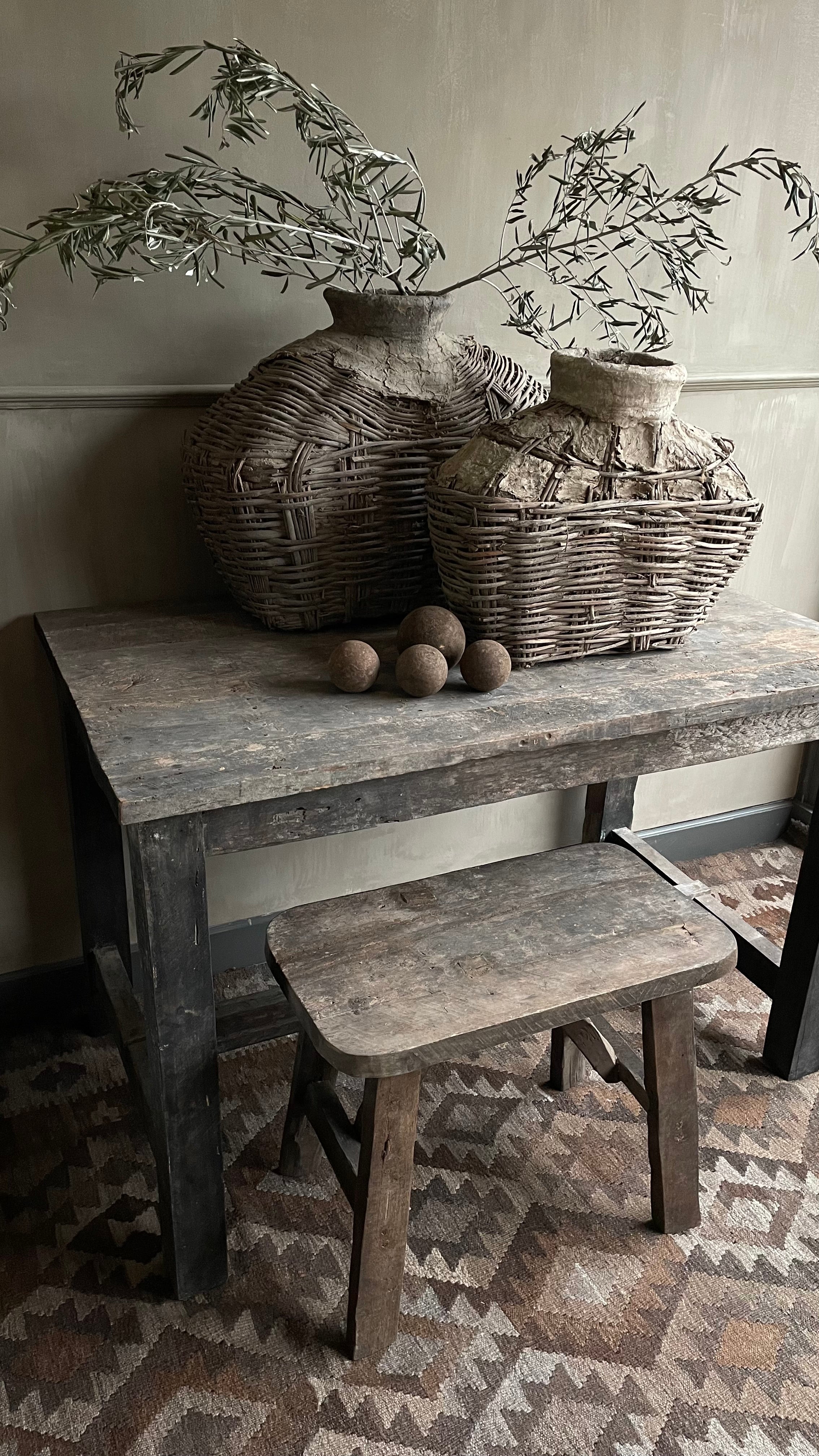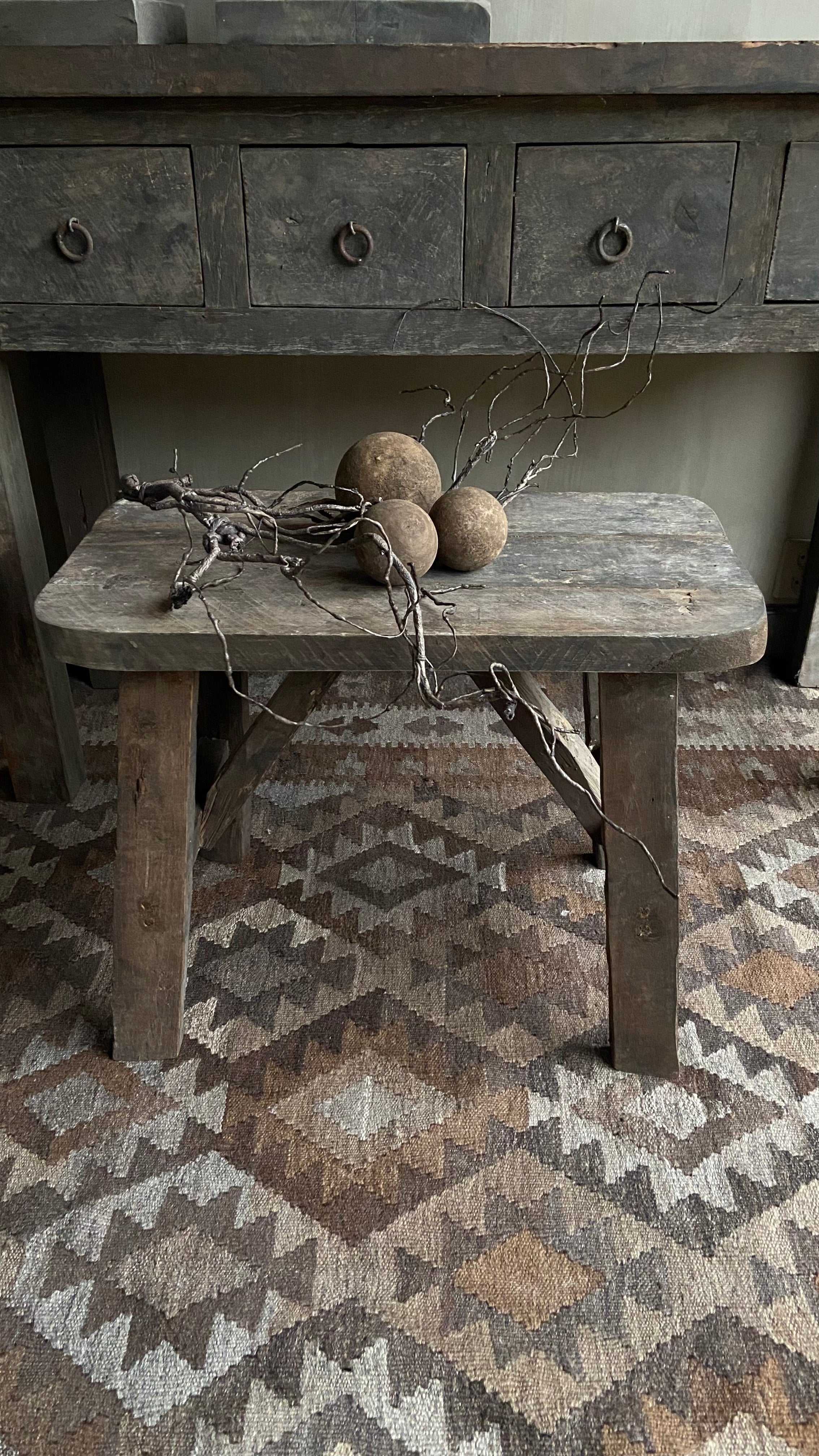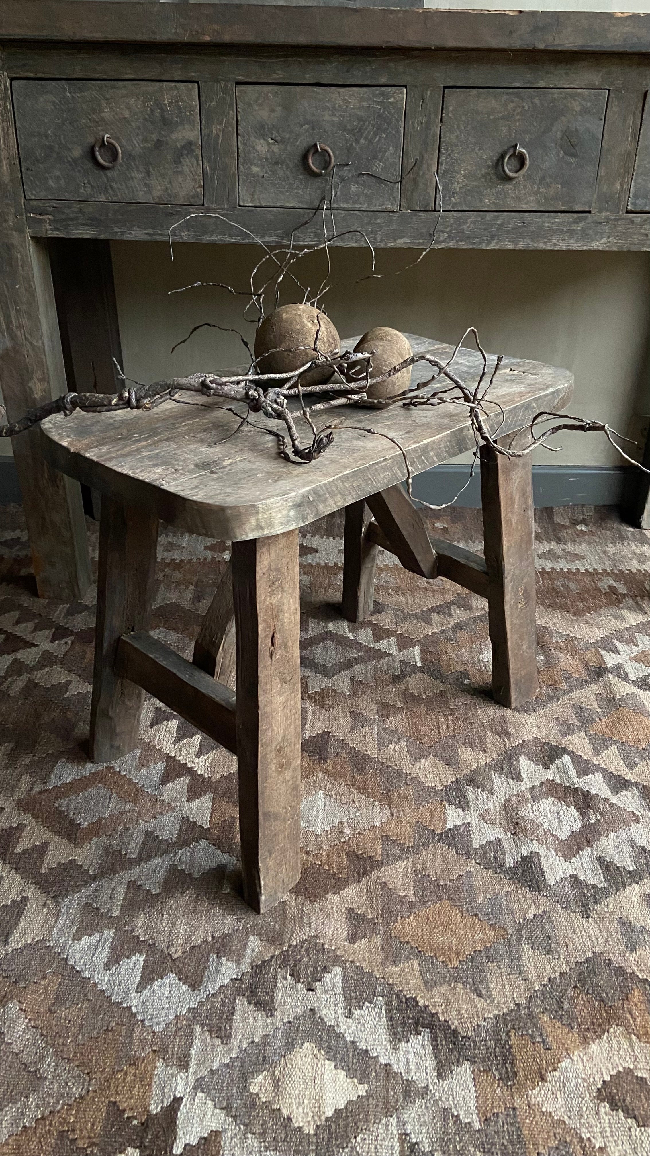 Je kunt hem op veel plekken kwijt: naast een dressoir, onder een sidetable, in de keuken of gewoon als klein bijzetkrukje. Ook als stylingobject doet hij het goed. Op de foto’s zie je hoe hij mooi combineert met kruiken, takken en rustieke accessoires. Dankzij zijn compacte formaat schuif je hem overal makkelijk tussen, en juist dat maakt hem zo’n fijn item om mee te stylen.