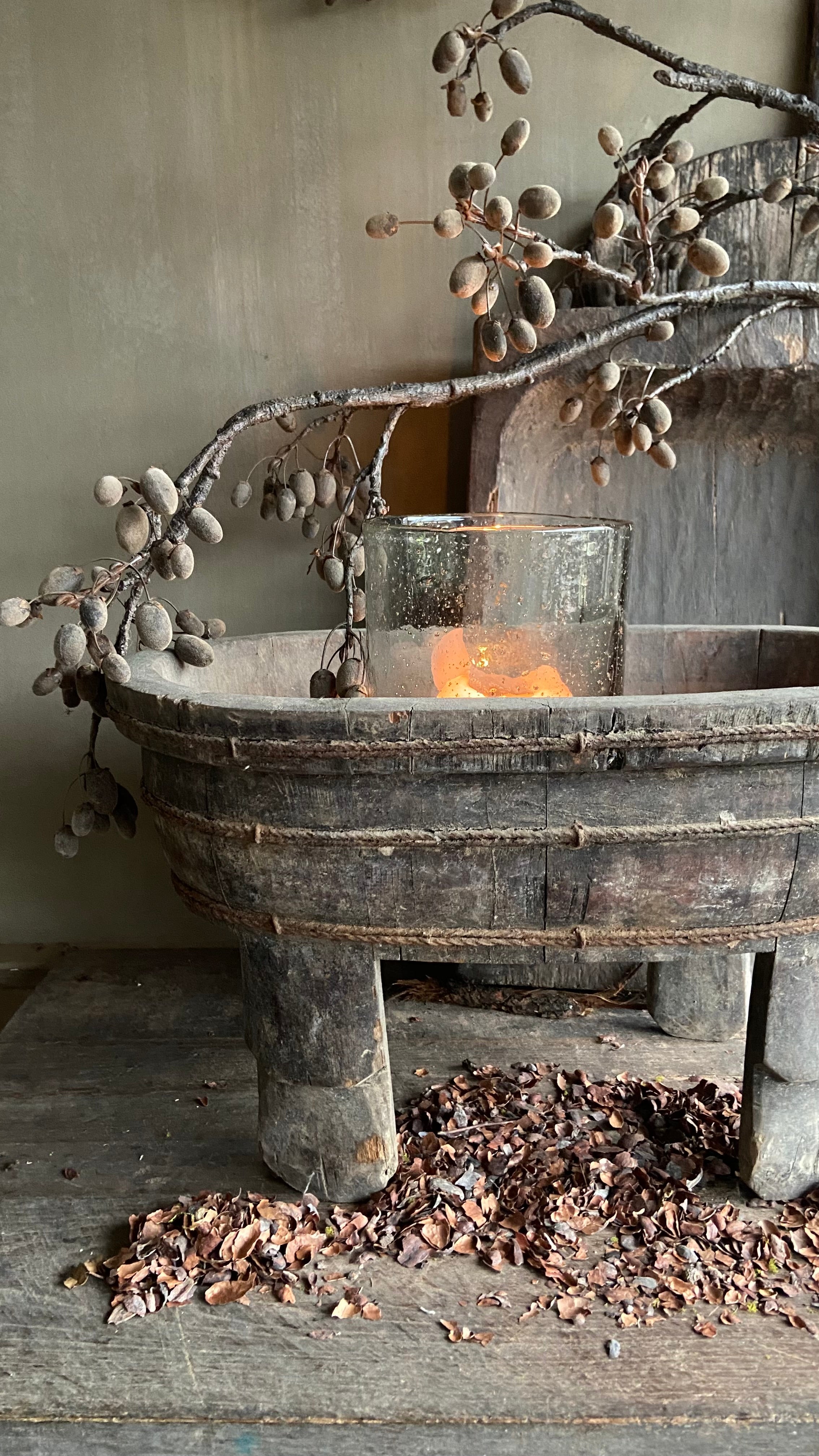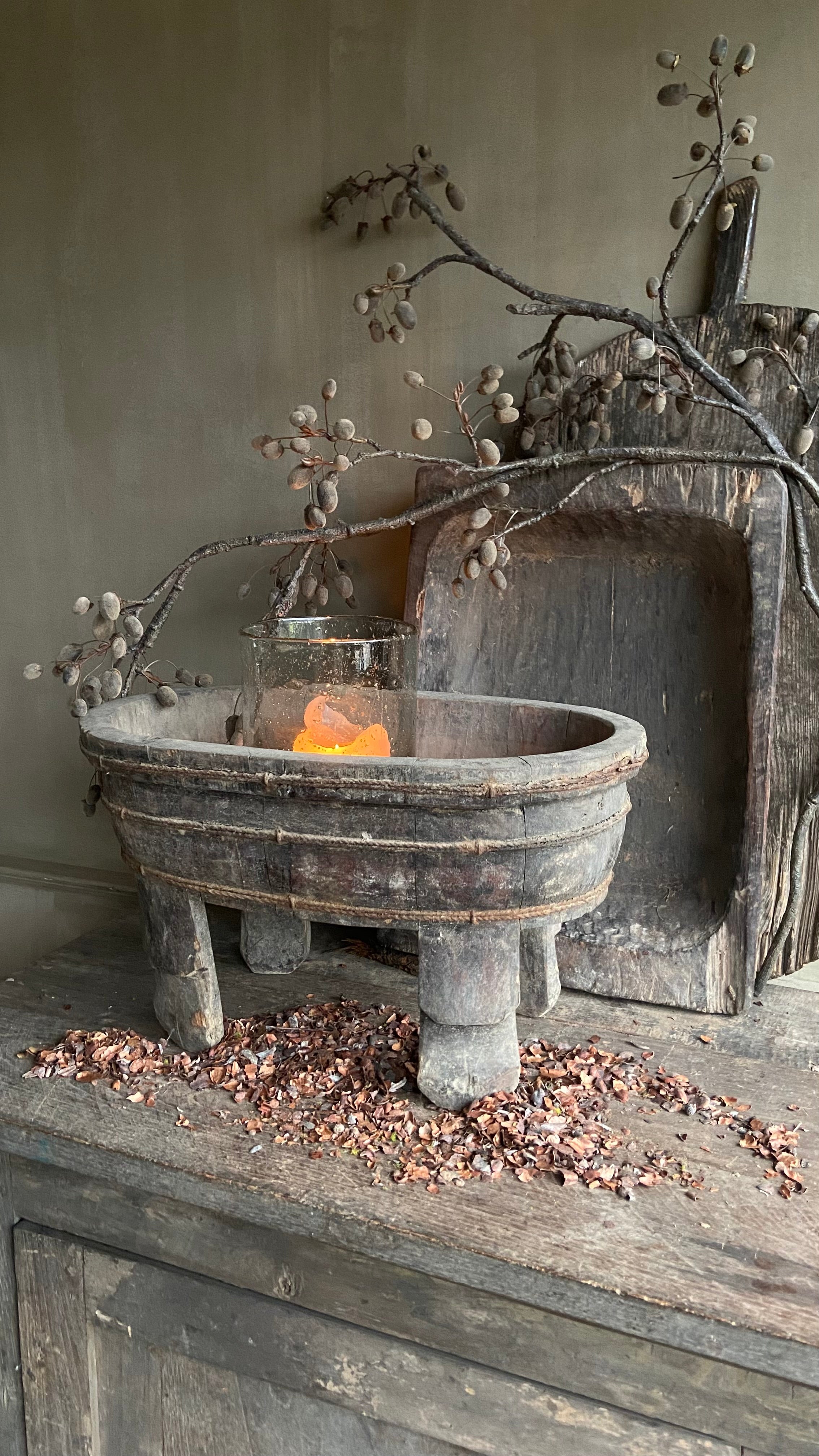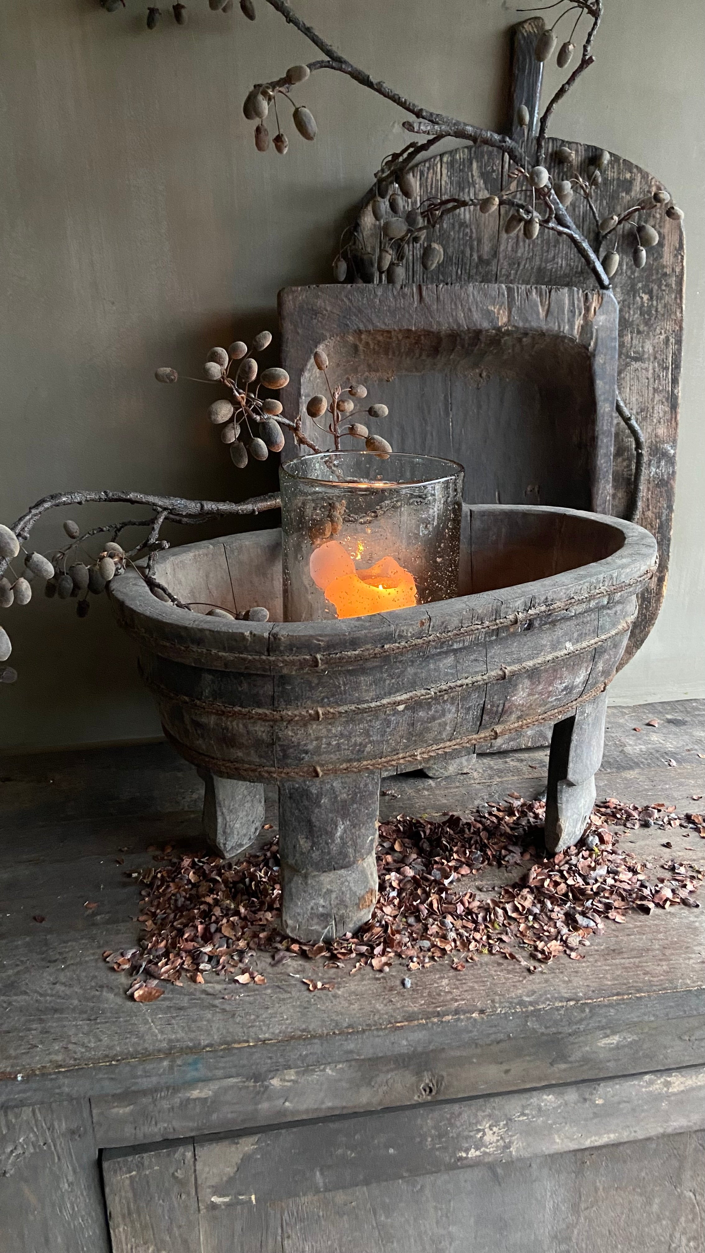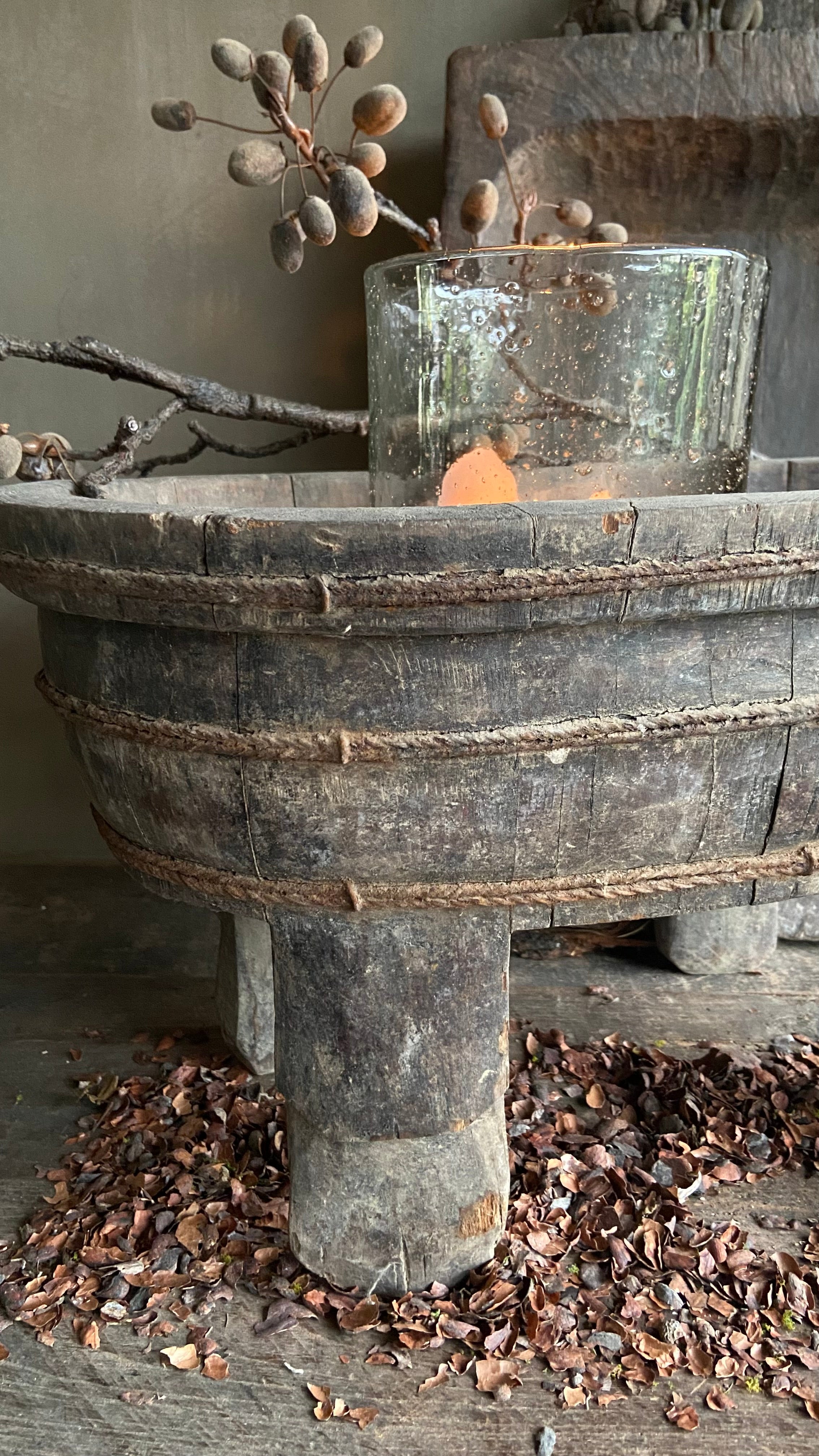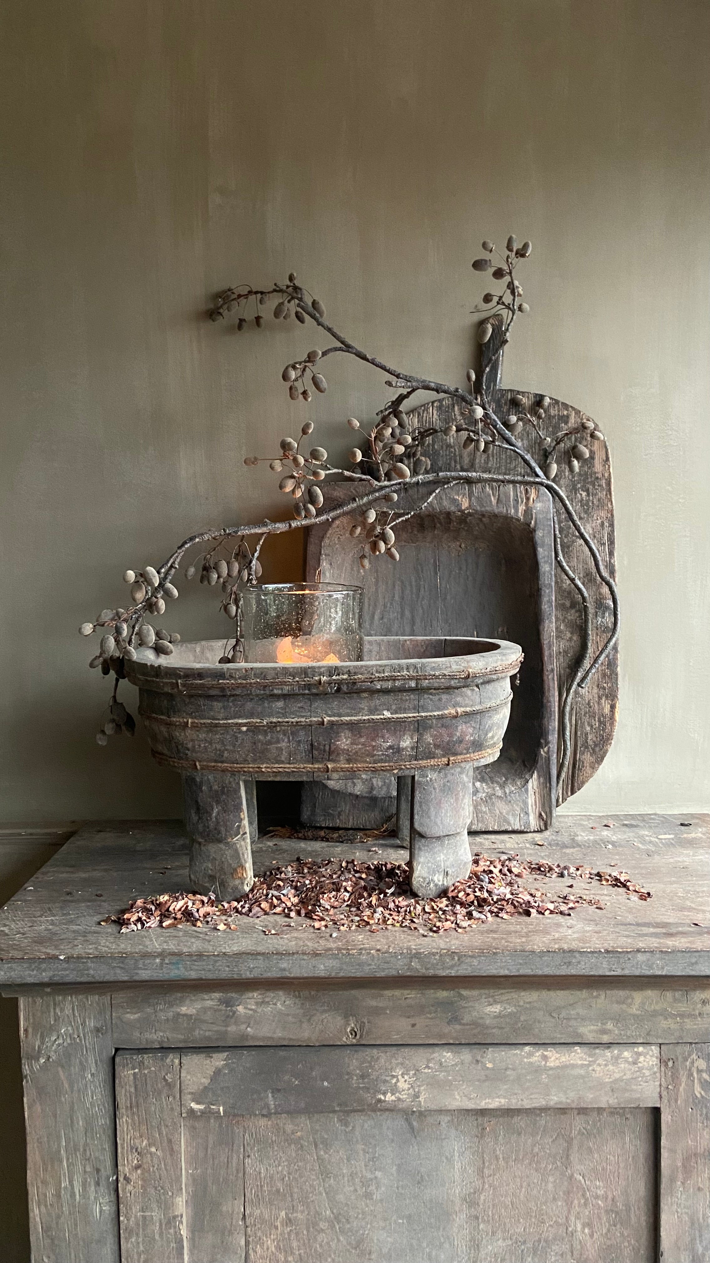 Este antigua caja de madera para aceitunas con patas Es un bello ejemplar desgastado y de aspecto auténtico. Antiguamente este recipiente se utilizaba para procesar aceitunas, por lo que encierra en sí una pieza única de historia. La estructura de la madera desgastada y el envejecimiento natural confieren a este olivo un aspecto robusto y con carácter.