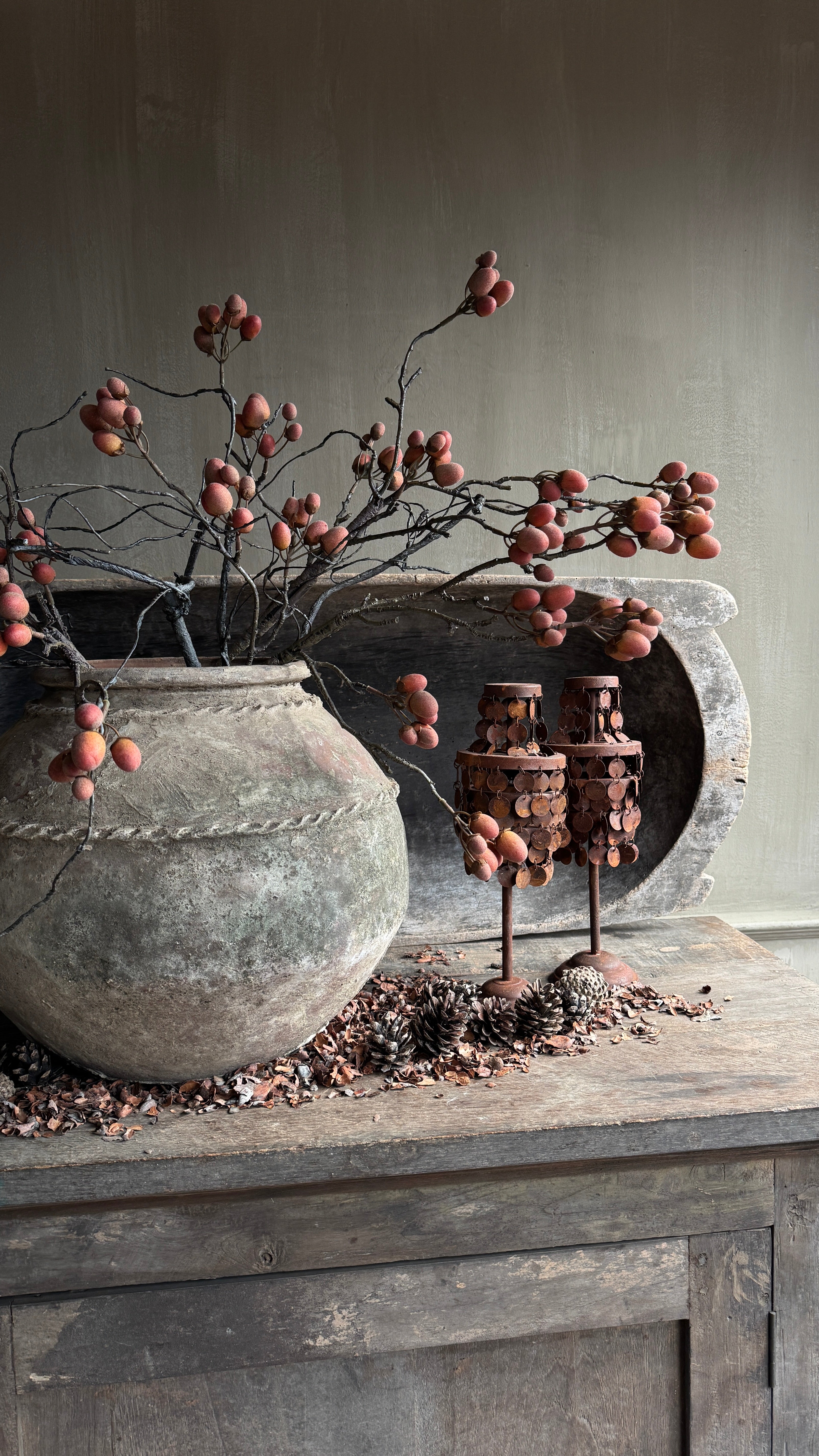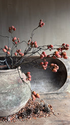 Gebruik de tak in een hoge vaas, of combineer meerdere in een stenen kruik voor een voller effect. Ook prachtig in een houten trog, een mand of als accent op een sidetable of kastje. Op de foto's zie je hoe deze tak moeiteloos opgaat in een sfeervolle, landelijke setting.