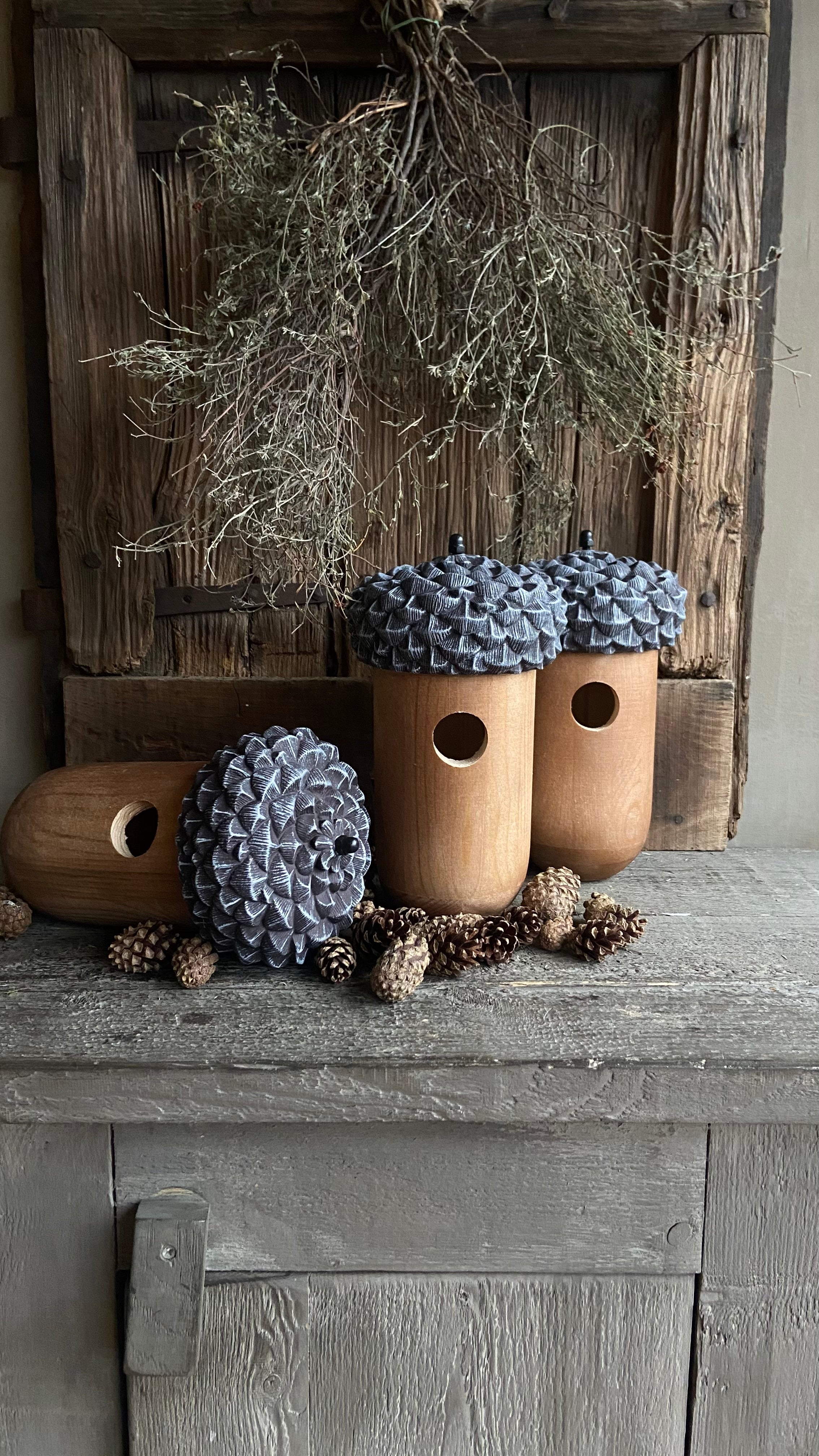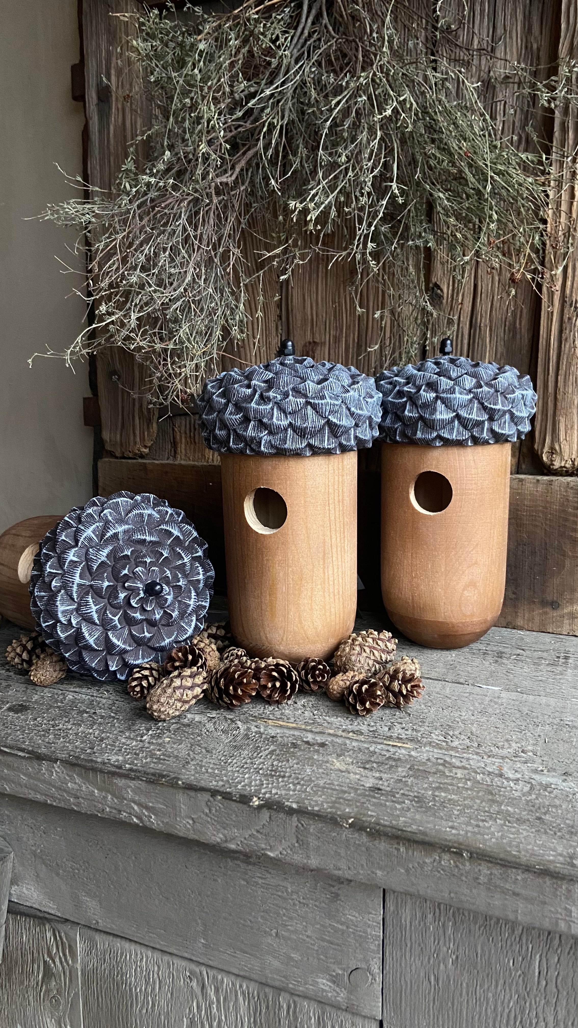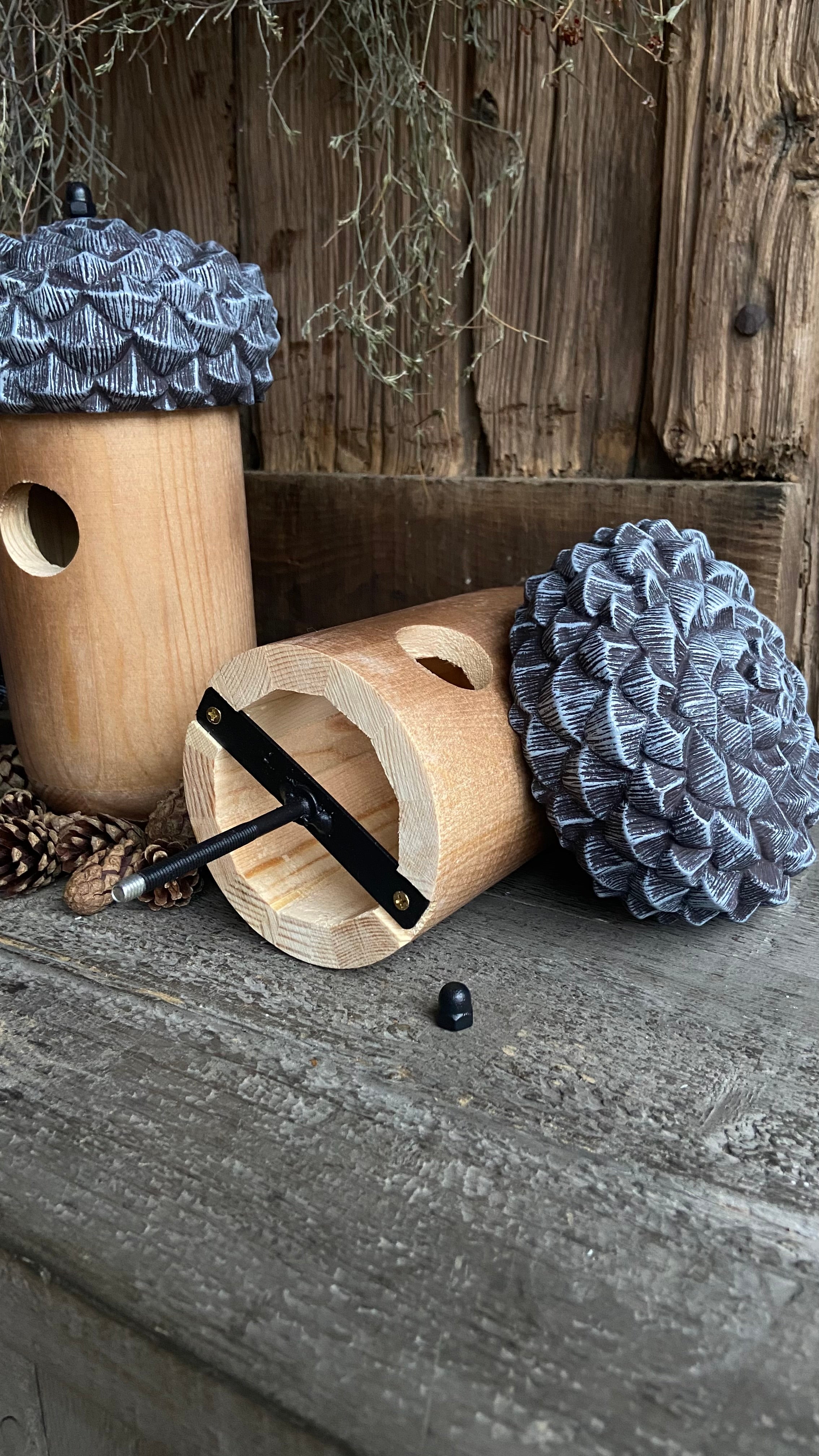 • La maison est en bois et le toit est en plastique en forme de capuchon de gland