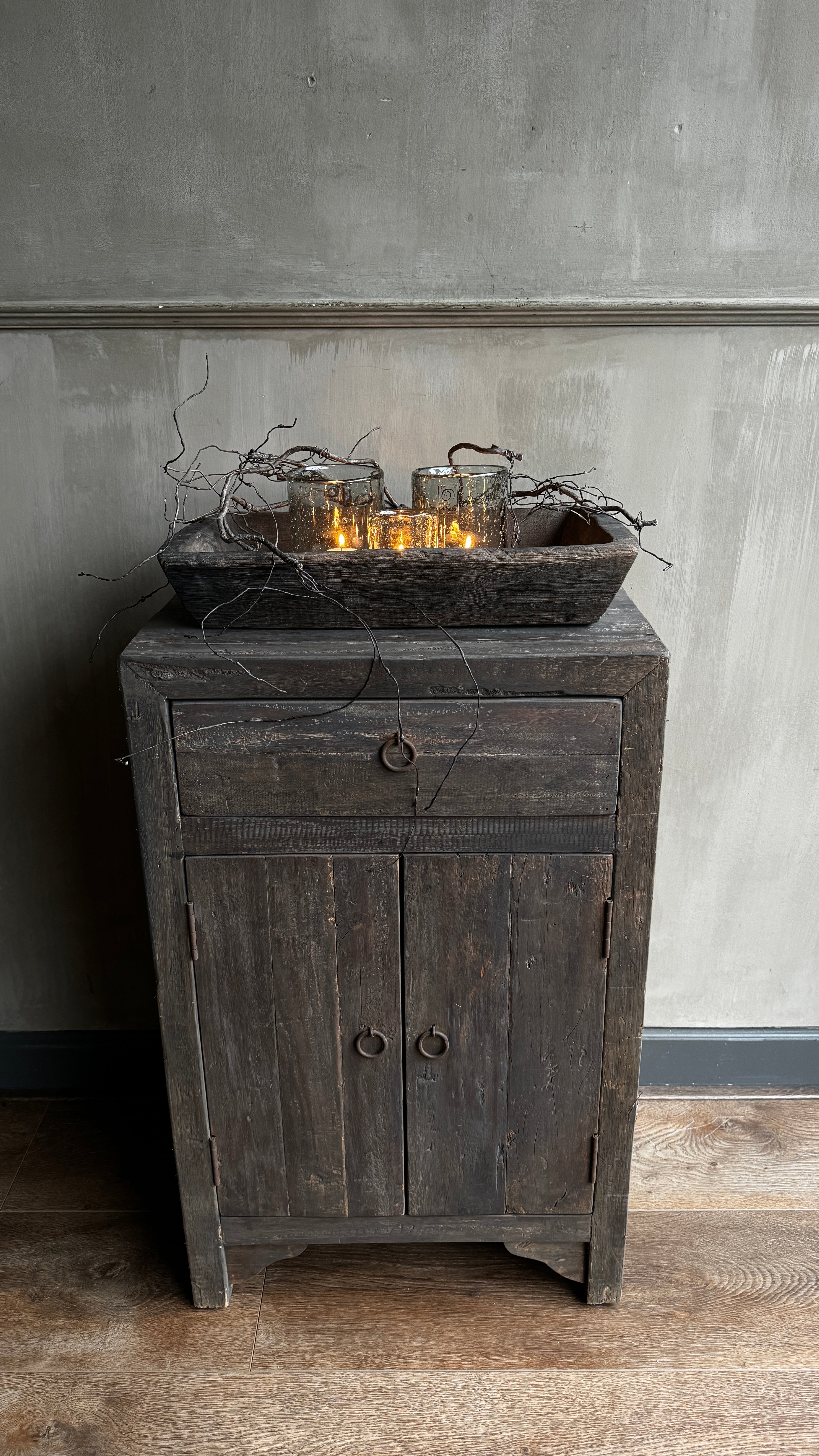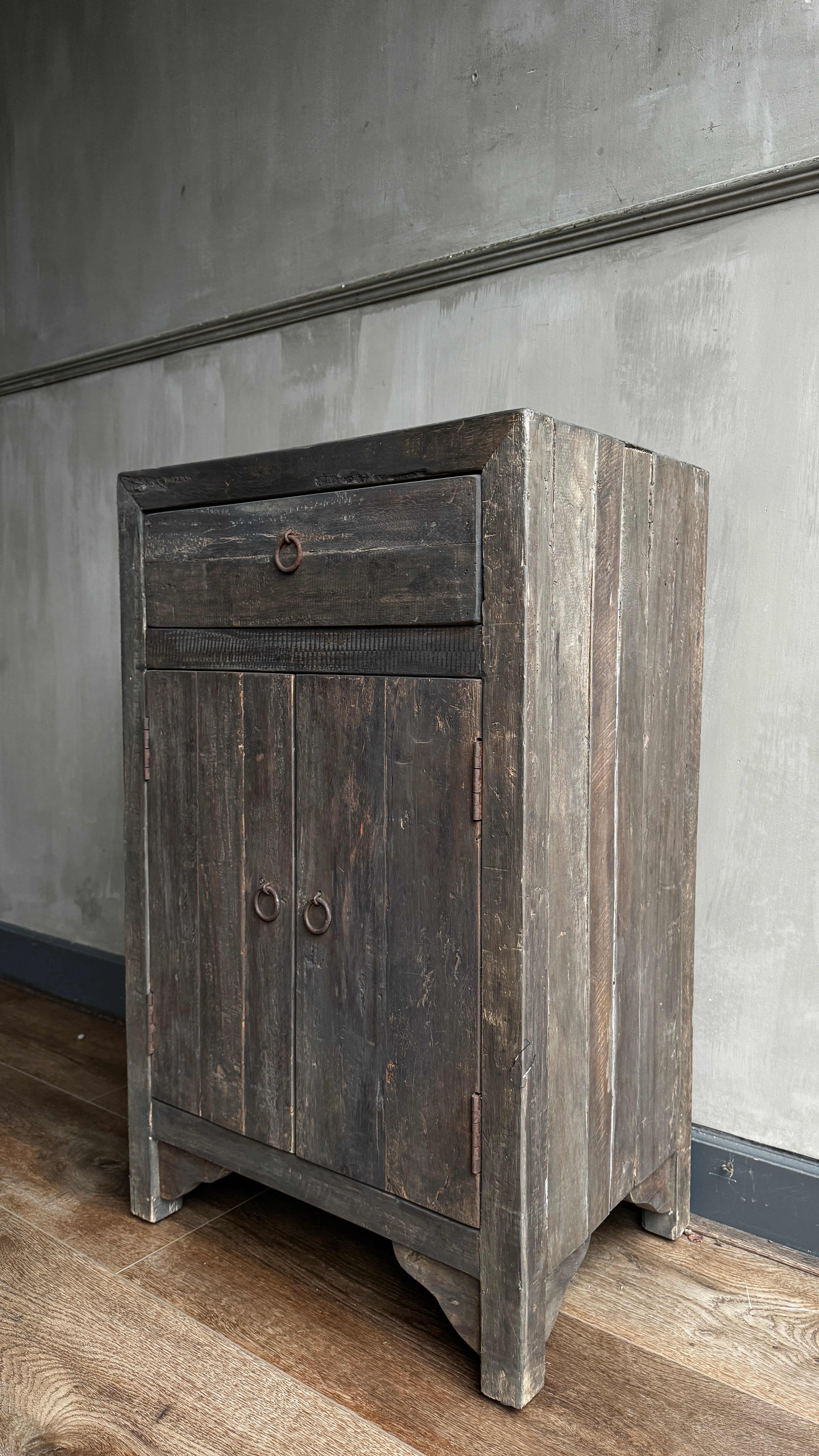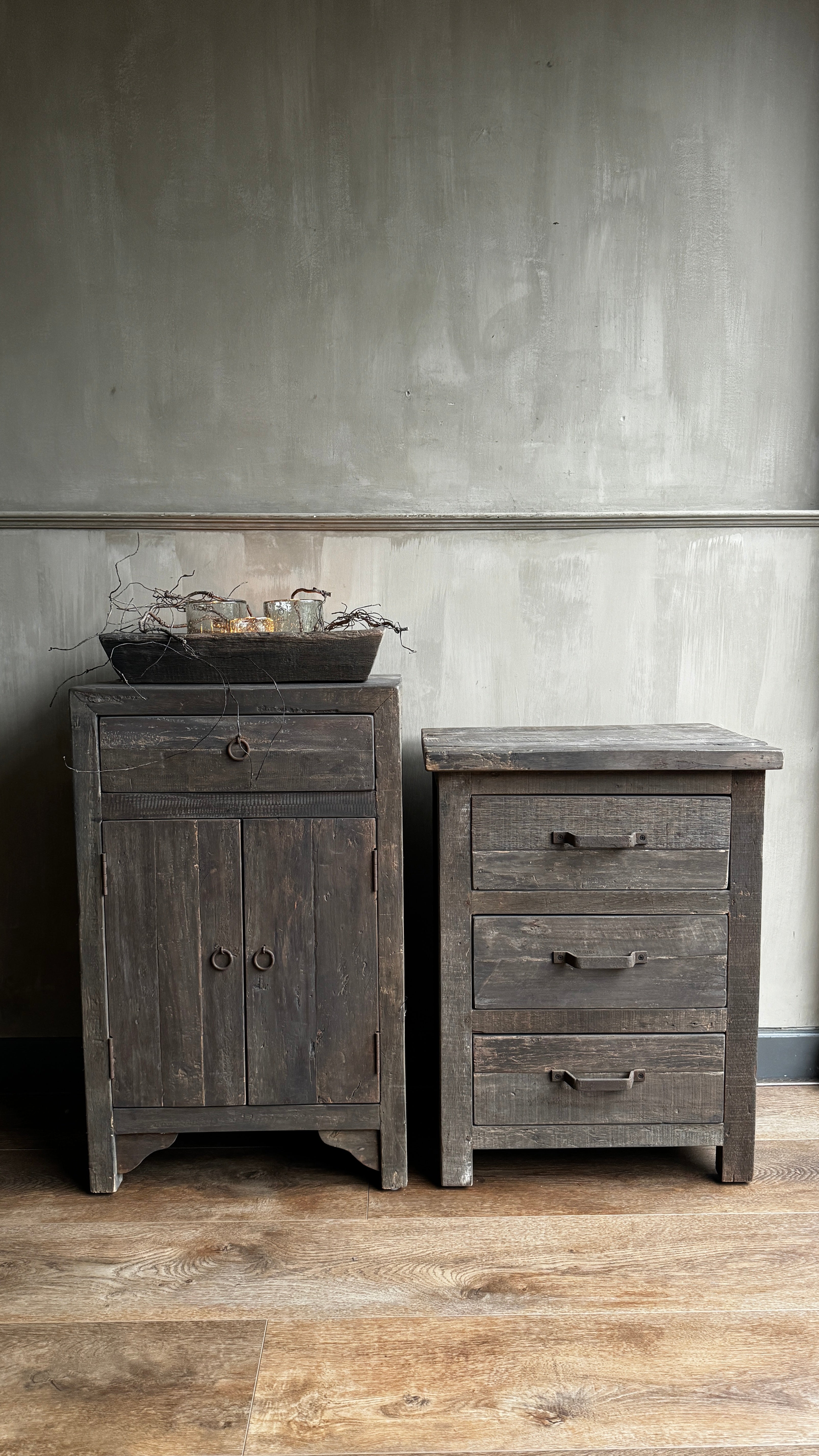 Les poignées rondes en métal confèrent à l'armoire un détail rustique subtil, tandis que le bois foncé et patiné offre un aspect authentique et vintage. Ce modèle est non seulement fonctionnel mais aussi un meuble frappant qui ajoute du caractère à la pièce.