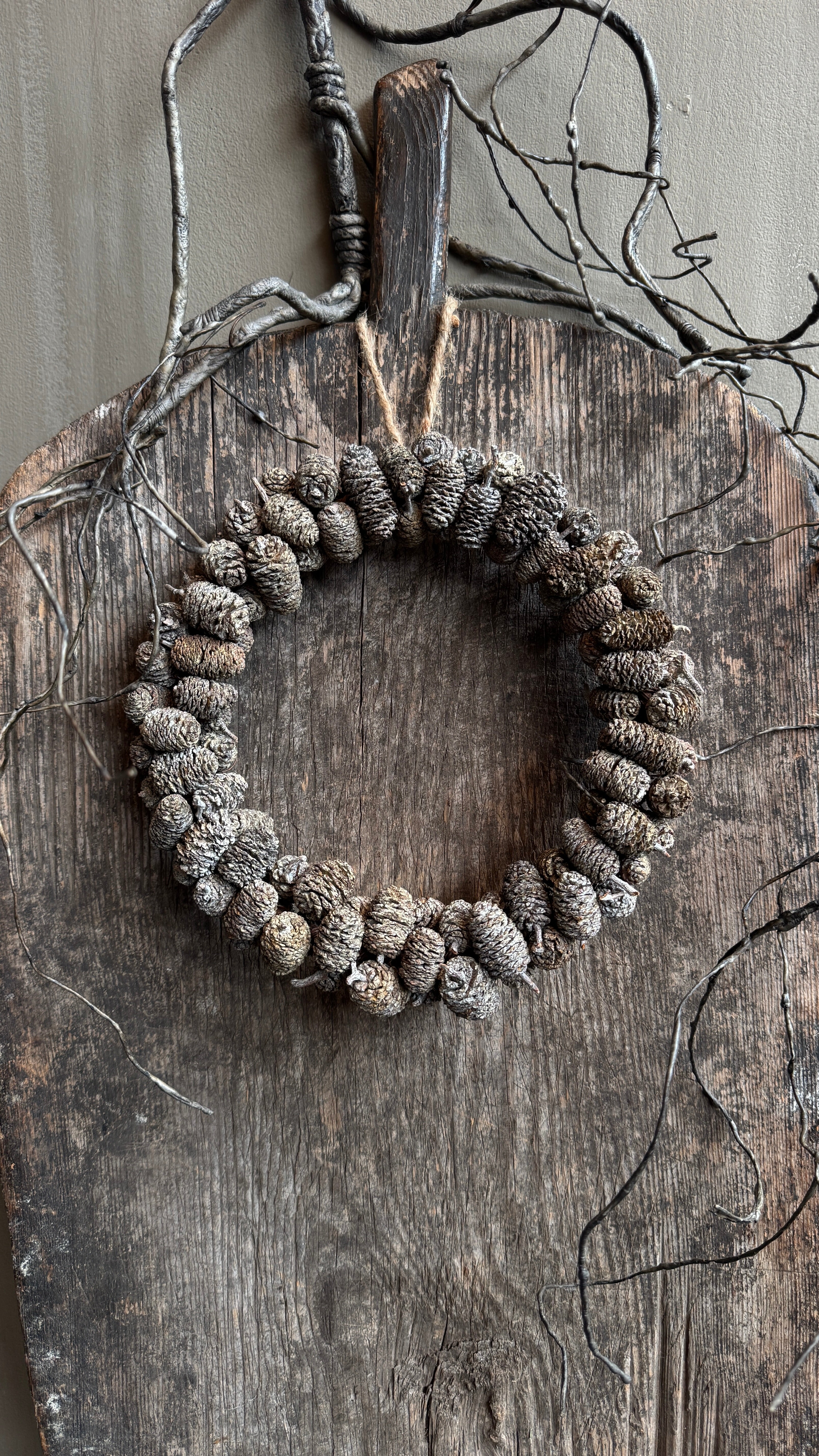 Deze dennenappel krans is een prachtige toevoeging aan een landelijk en sober interieur.