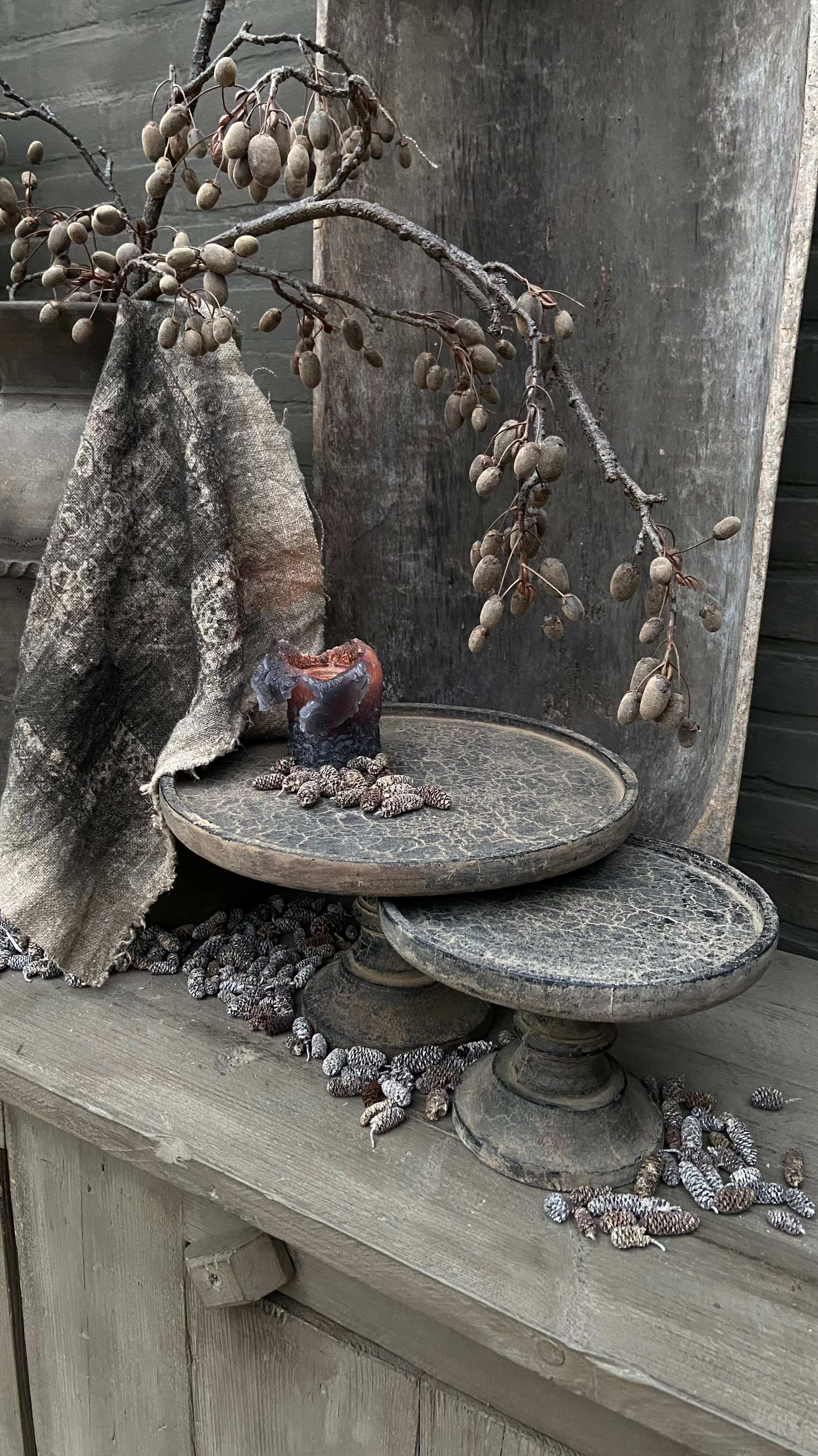 - Ce plateau en bois repose sur une base et présente une finition craquelée patinée.