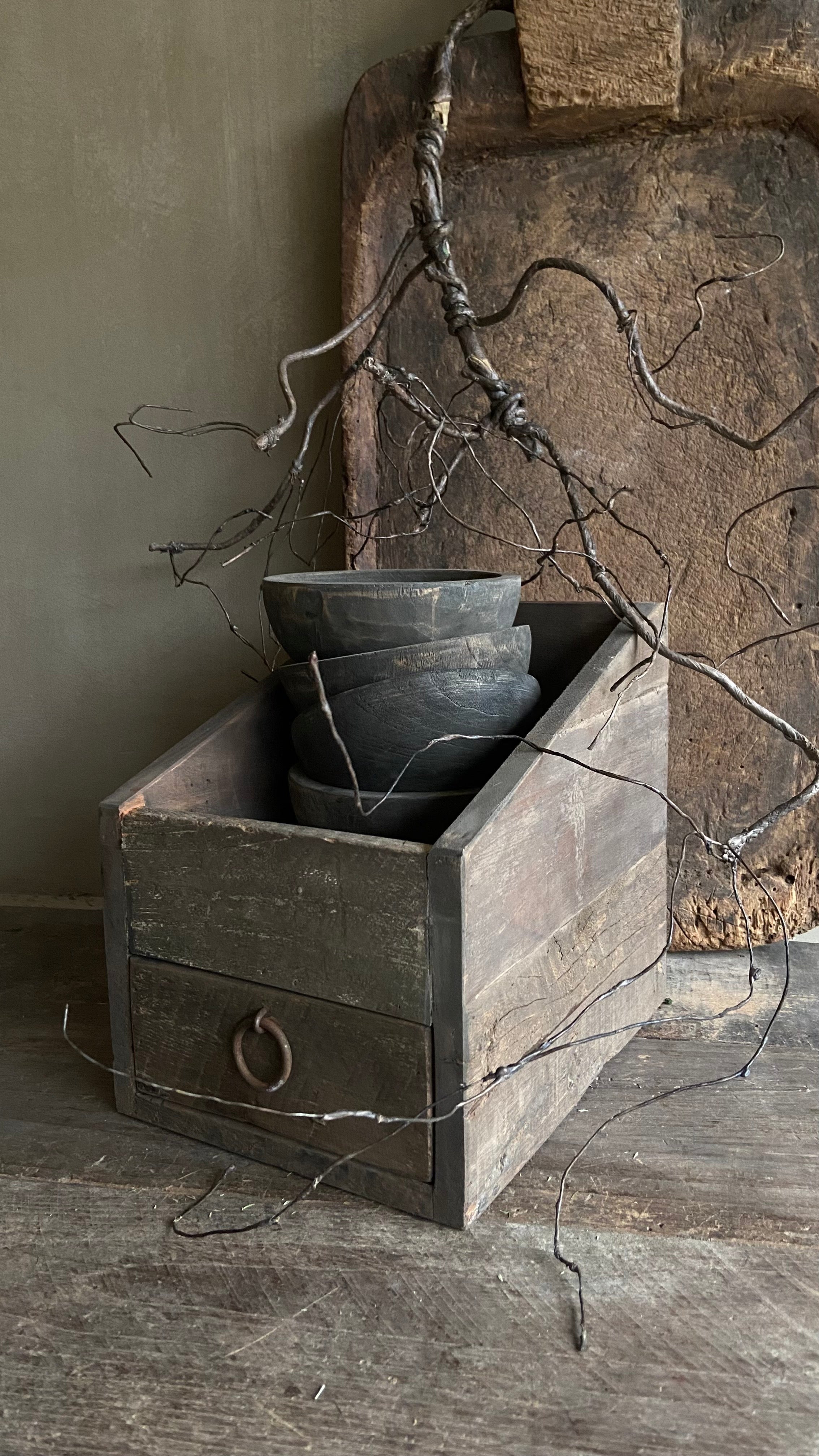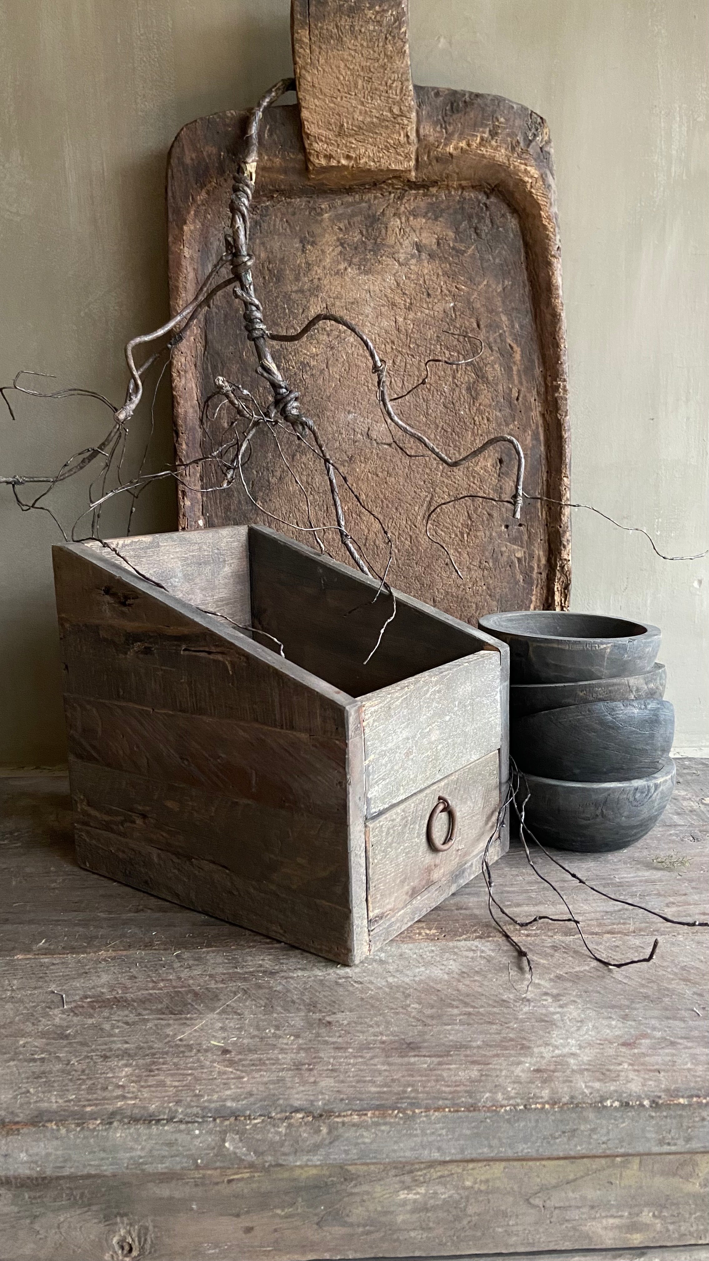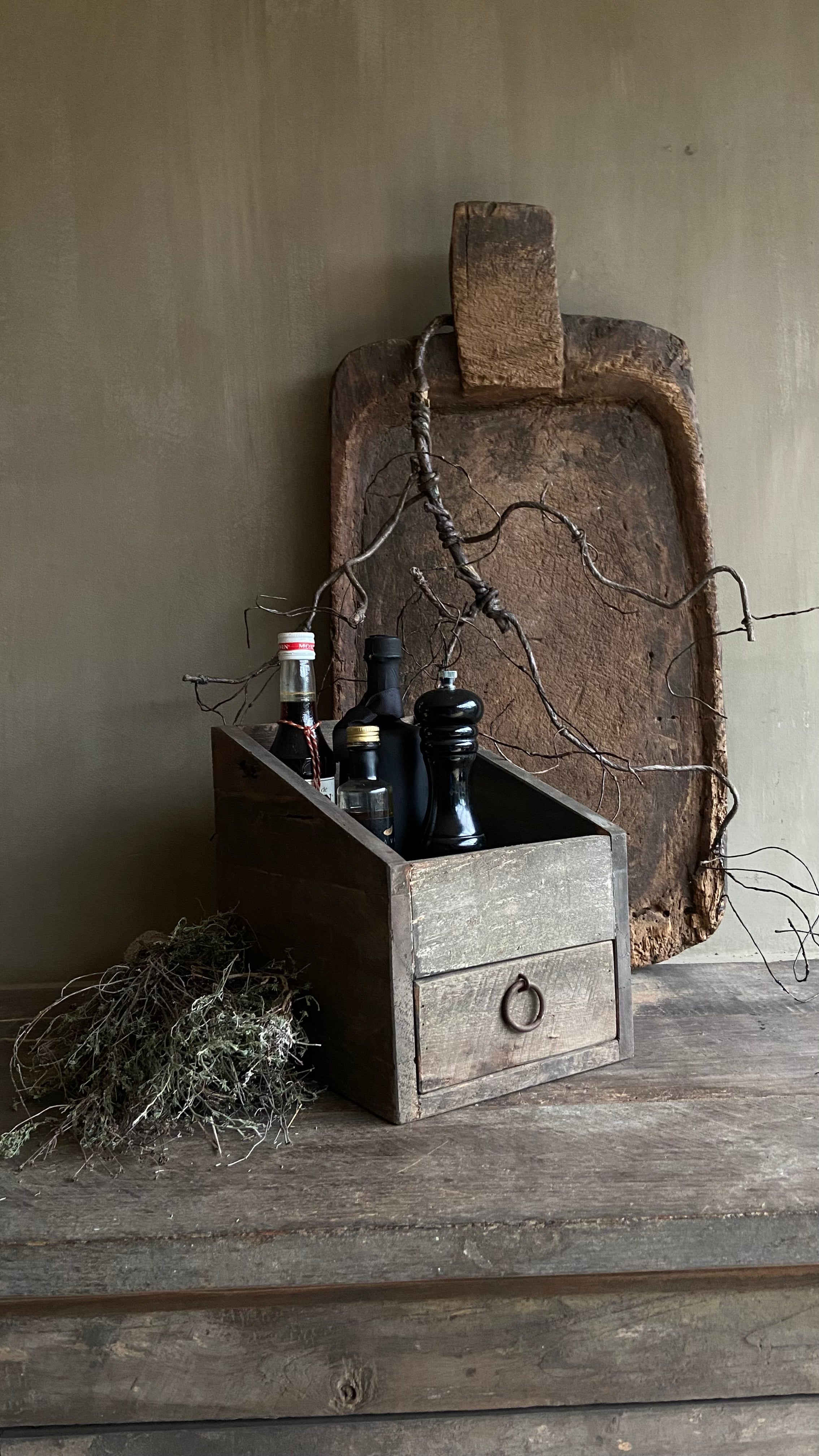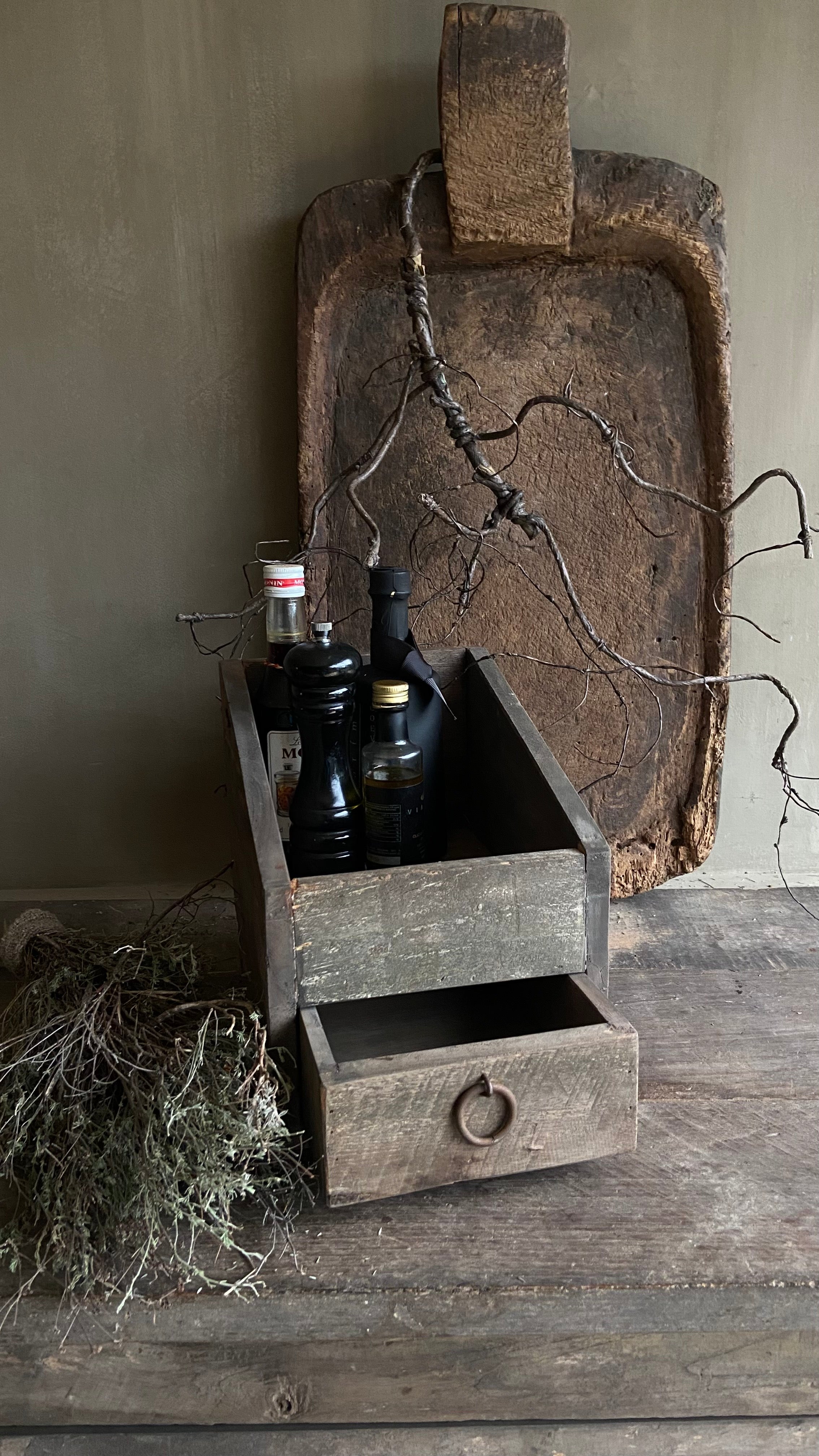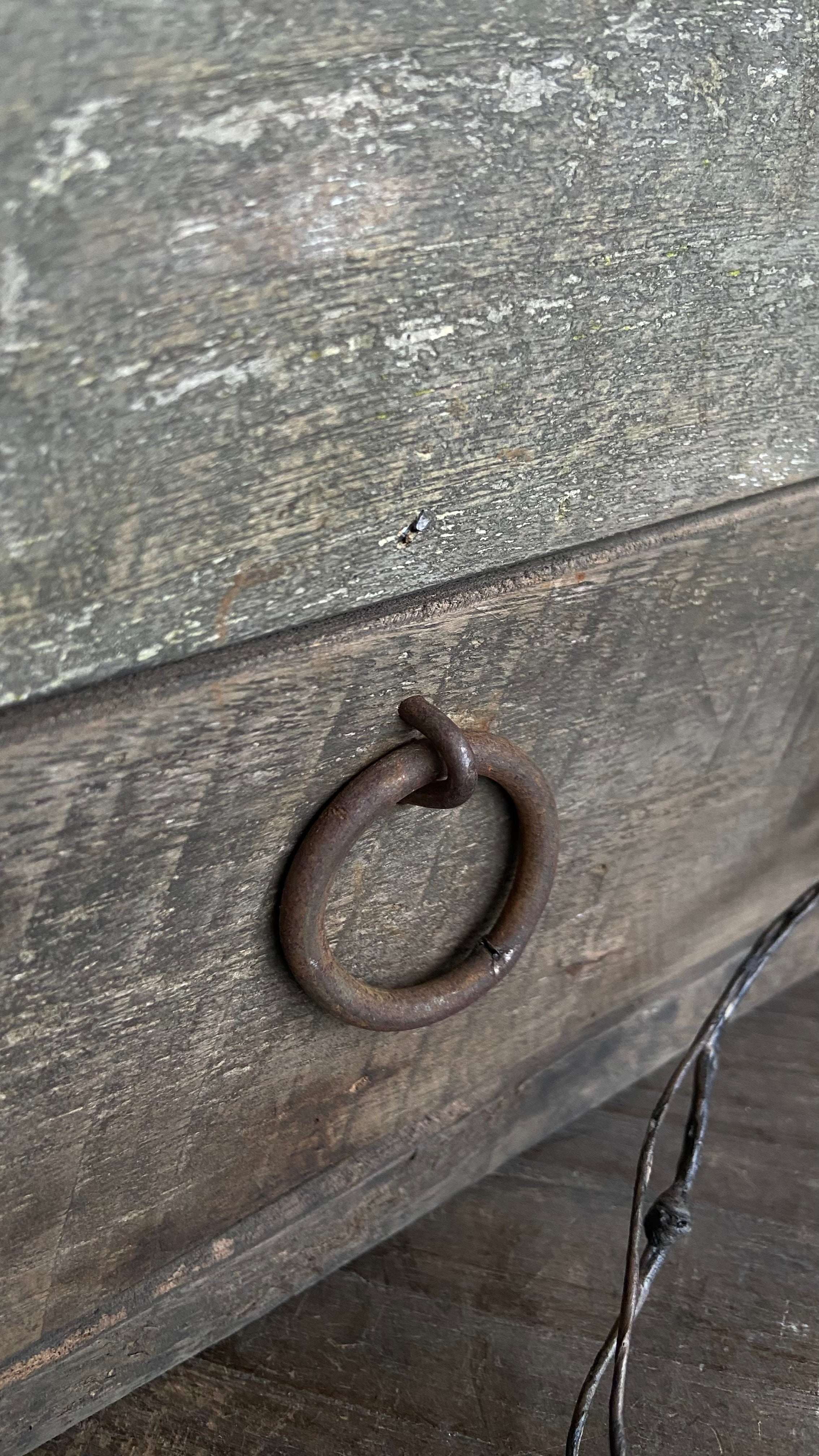 - La boîte a un tiroir avec un anneau en fer patiné attaché à celui-ci