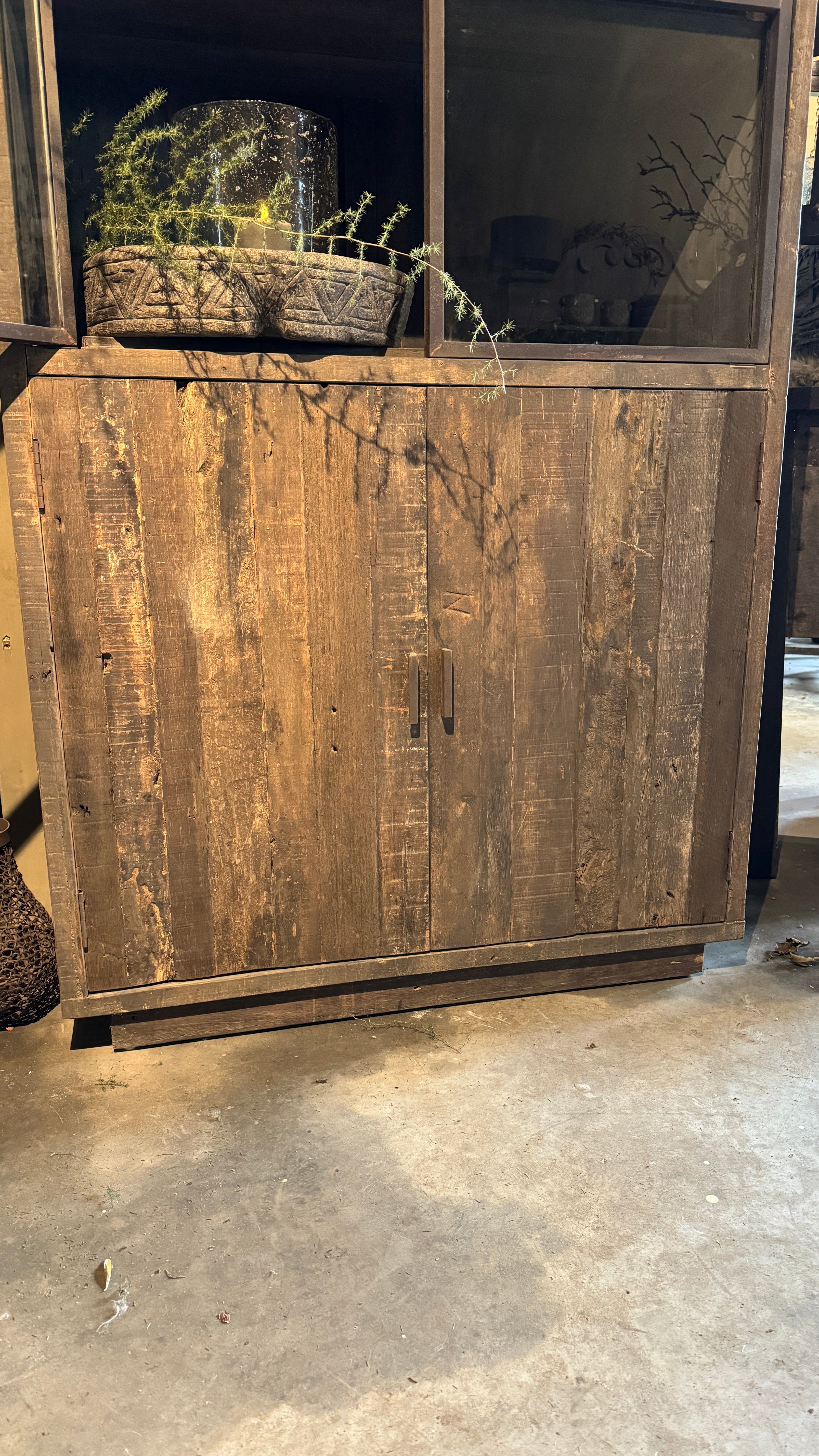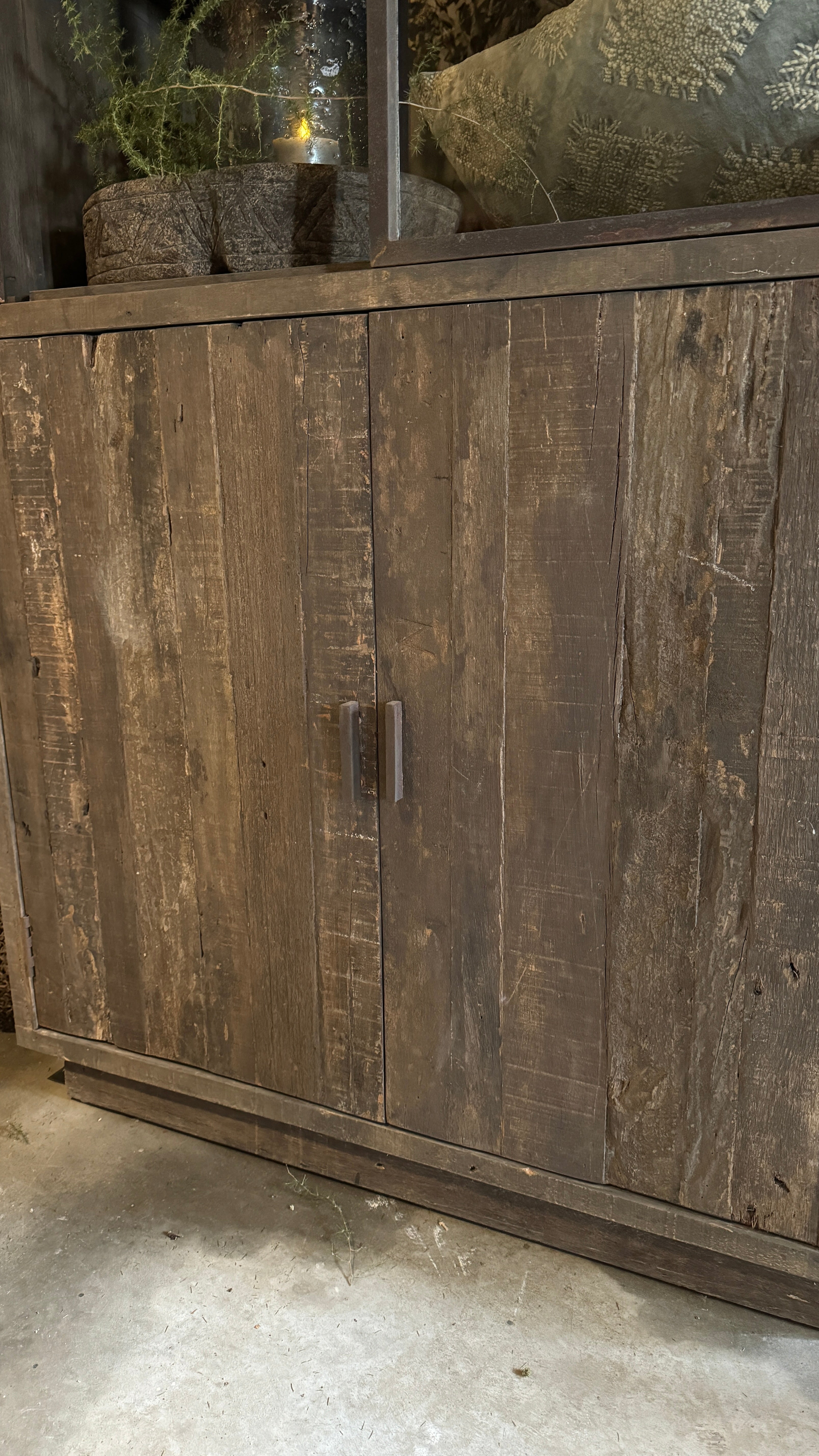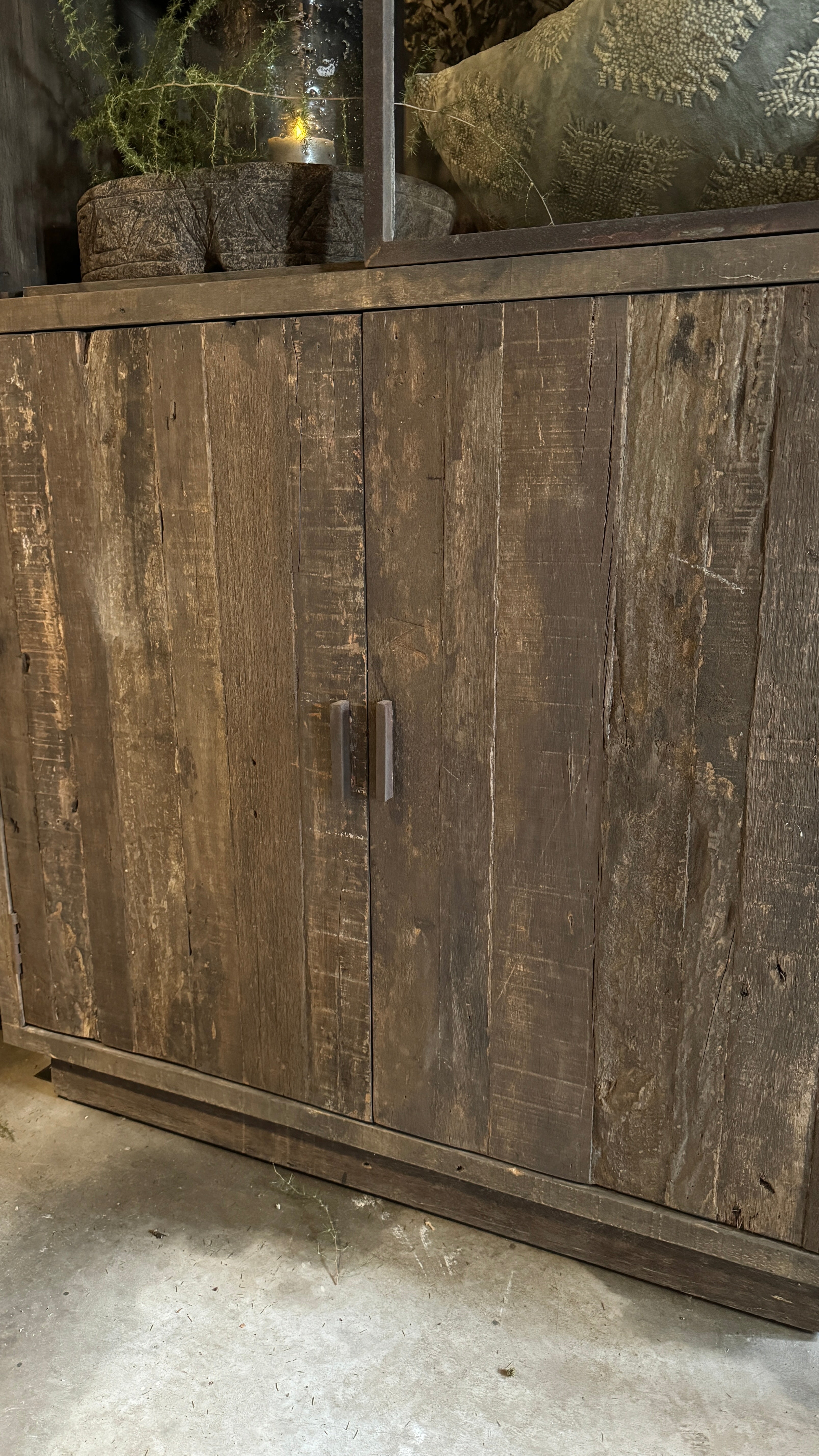 Porta un'atmosfera autentica e calda nei tuoi interni con questo imponente mobile della nostra esclusiva collezione Vecchio fienile collezione. Questa credenza realizzata a mano coniuga il fascino del legno invecchiato con un fresco design industriale ed è perfetta per gli amanti di interni robusti e di carattere.