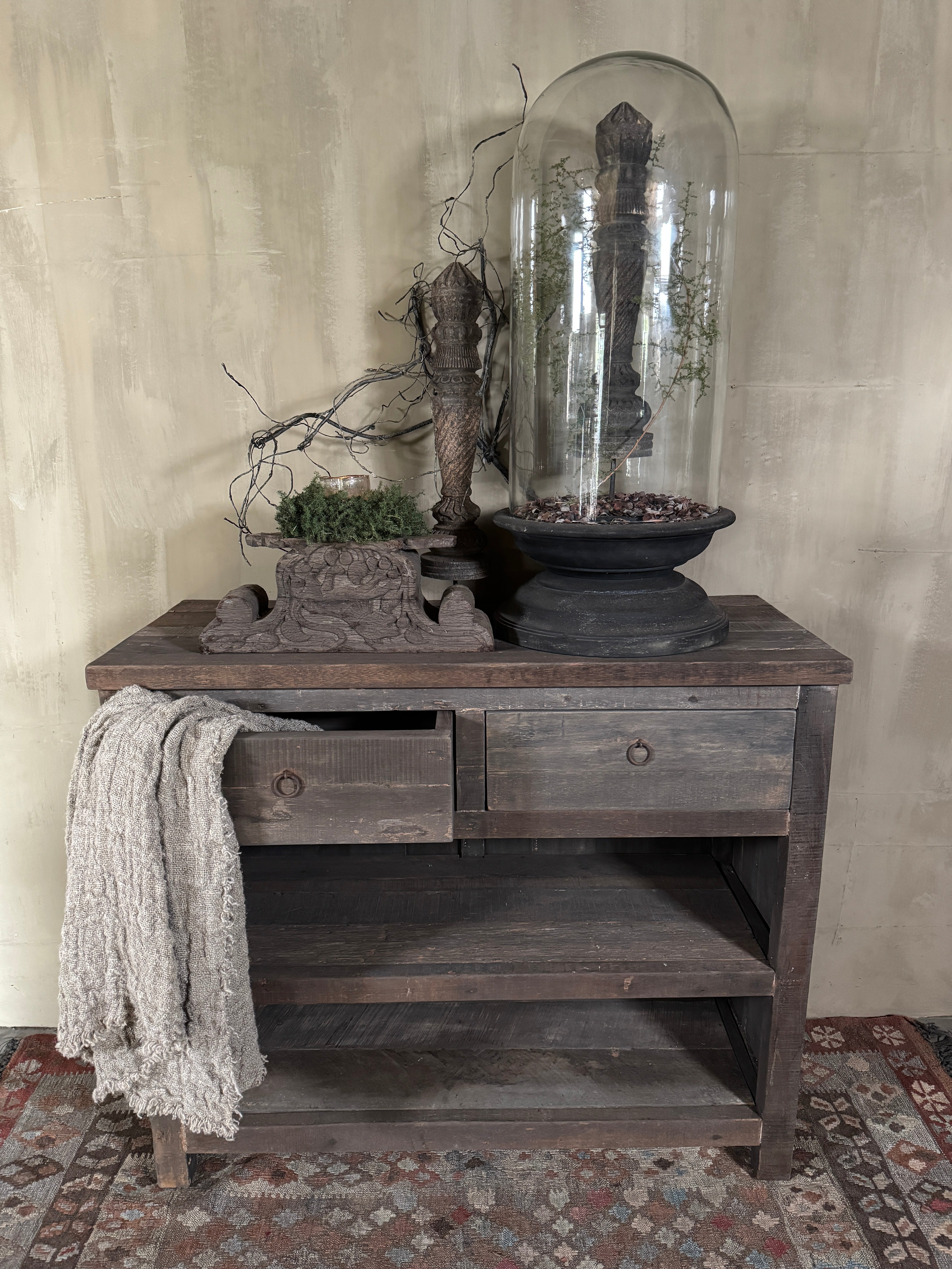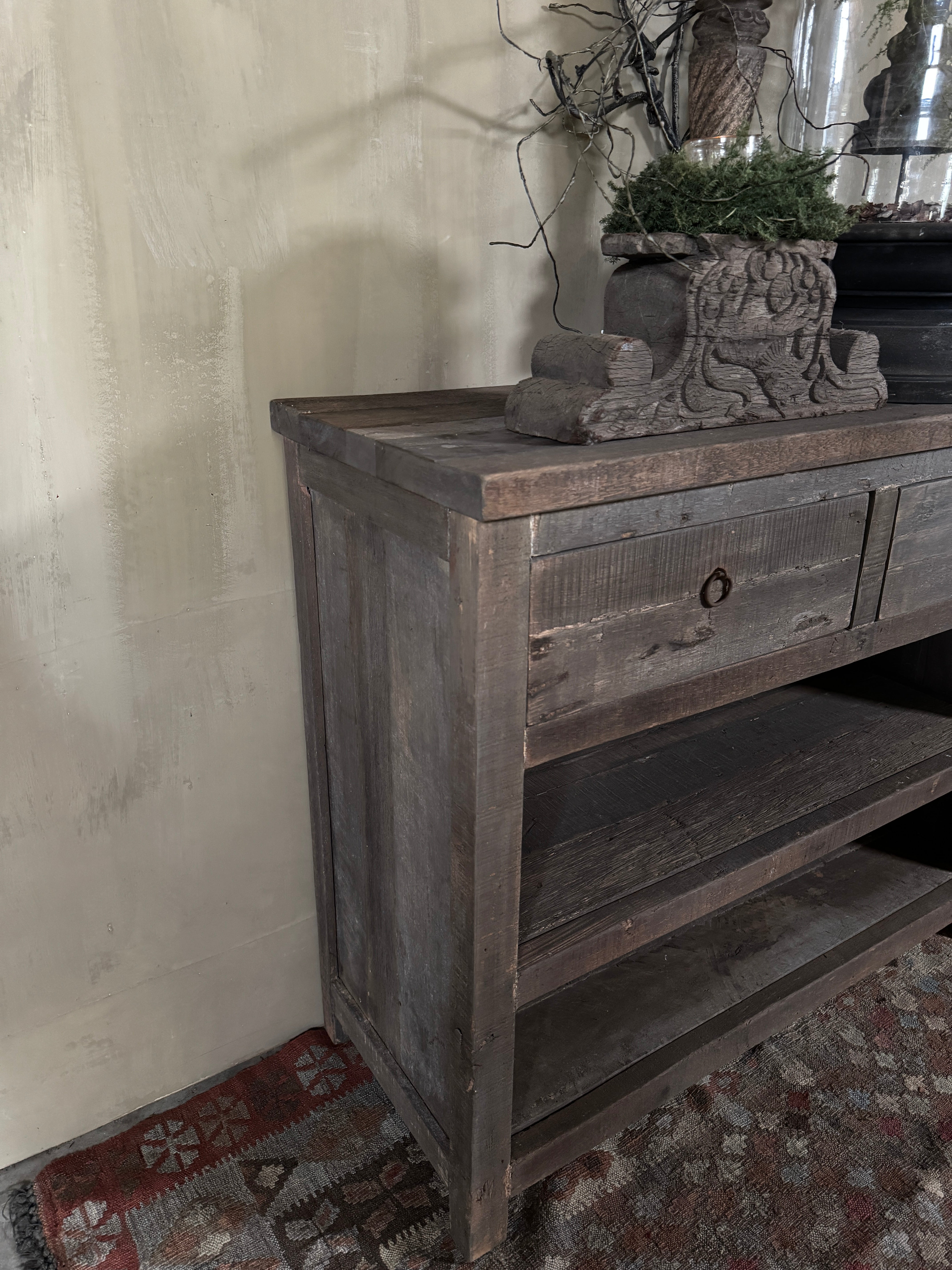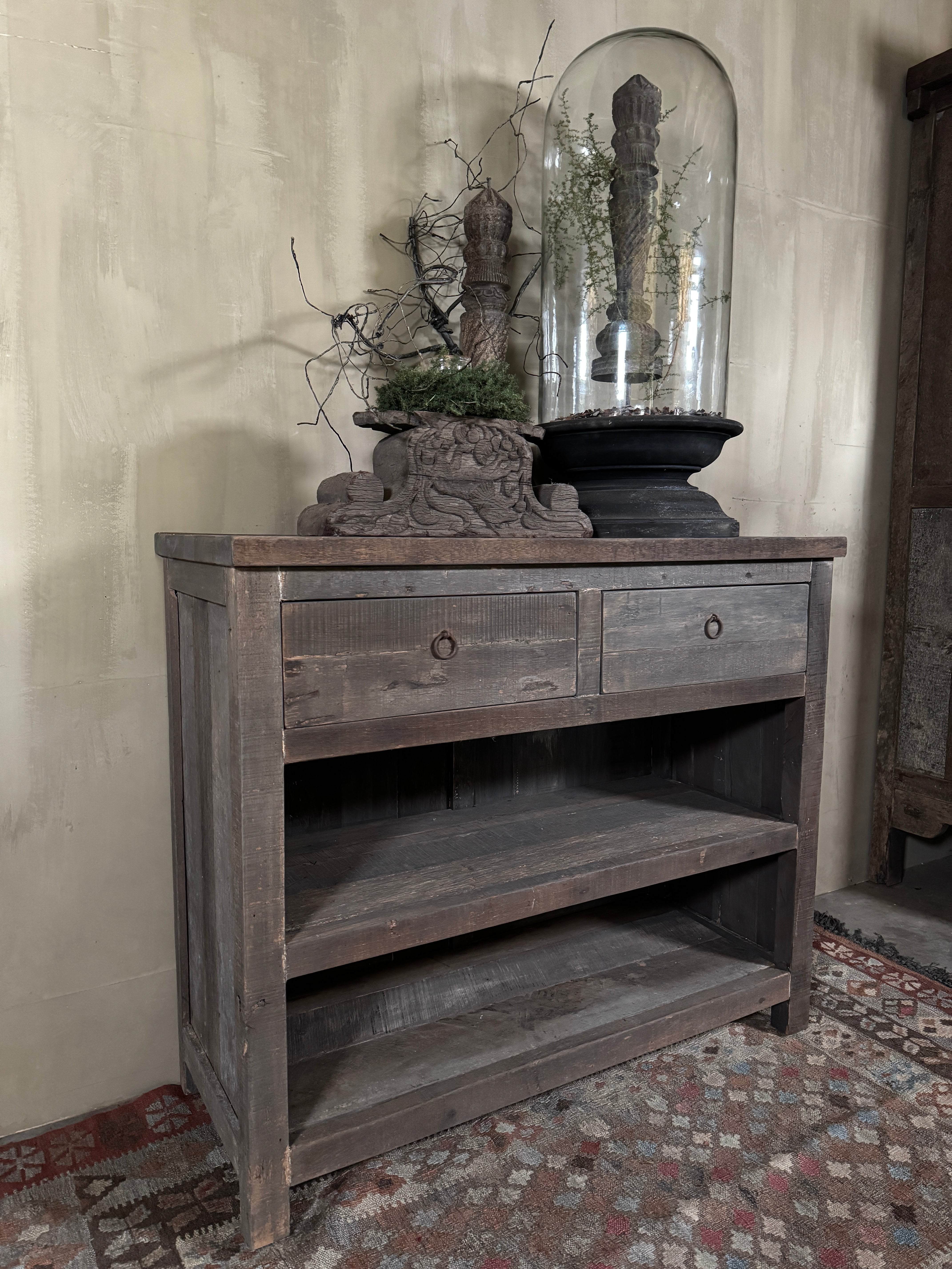 Deze Driftwood kast met 2 lades is een prachtig en praktisch meubel voor wie houdt van een warme, sobere woonstijl. De kast is gemaakt van stevig hout met een verweerde driftwood afwerking die meteen sfeer toevoegt aan je interieur.