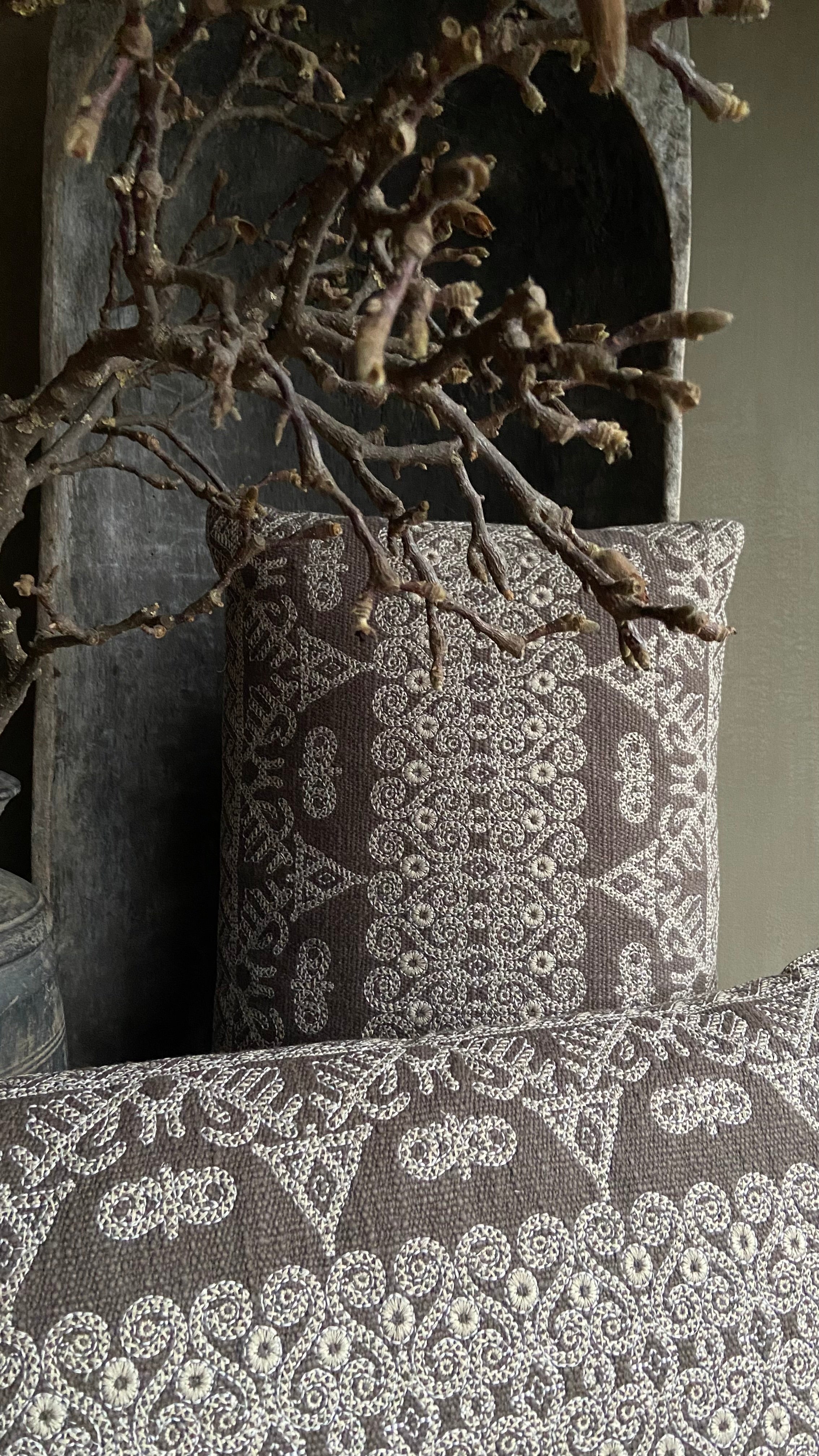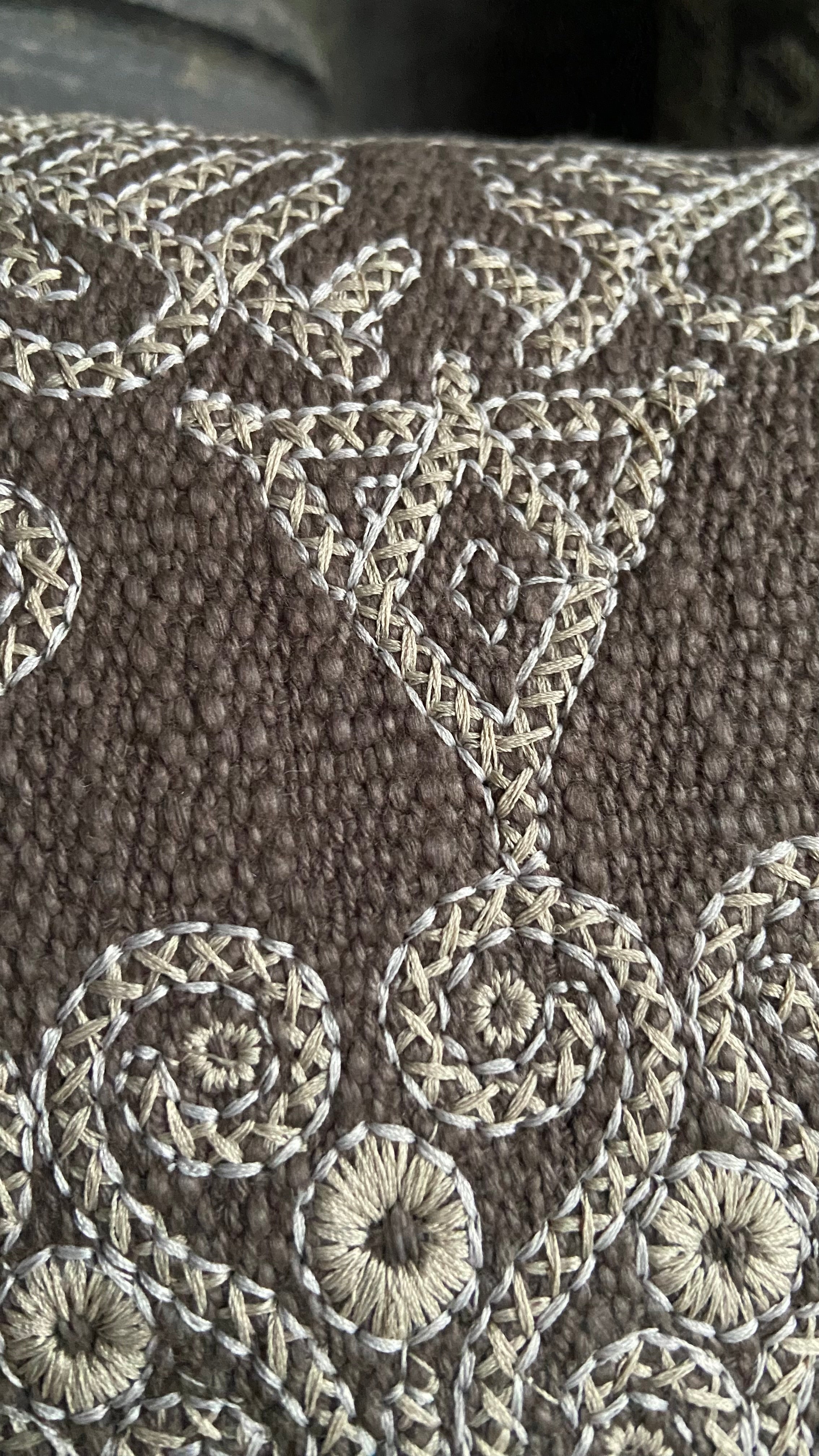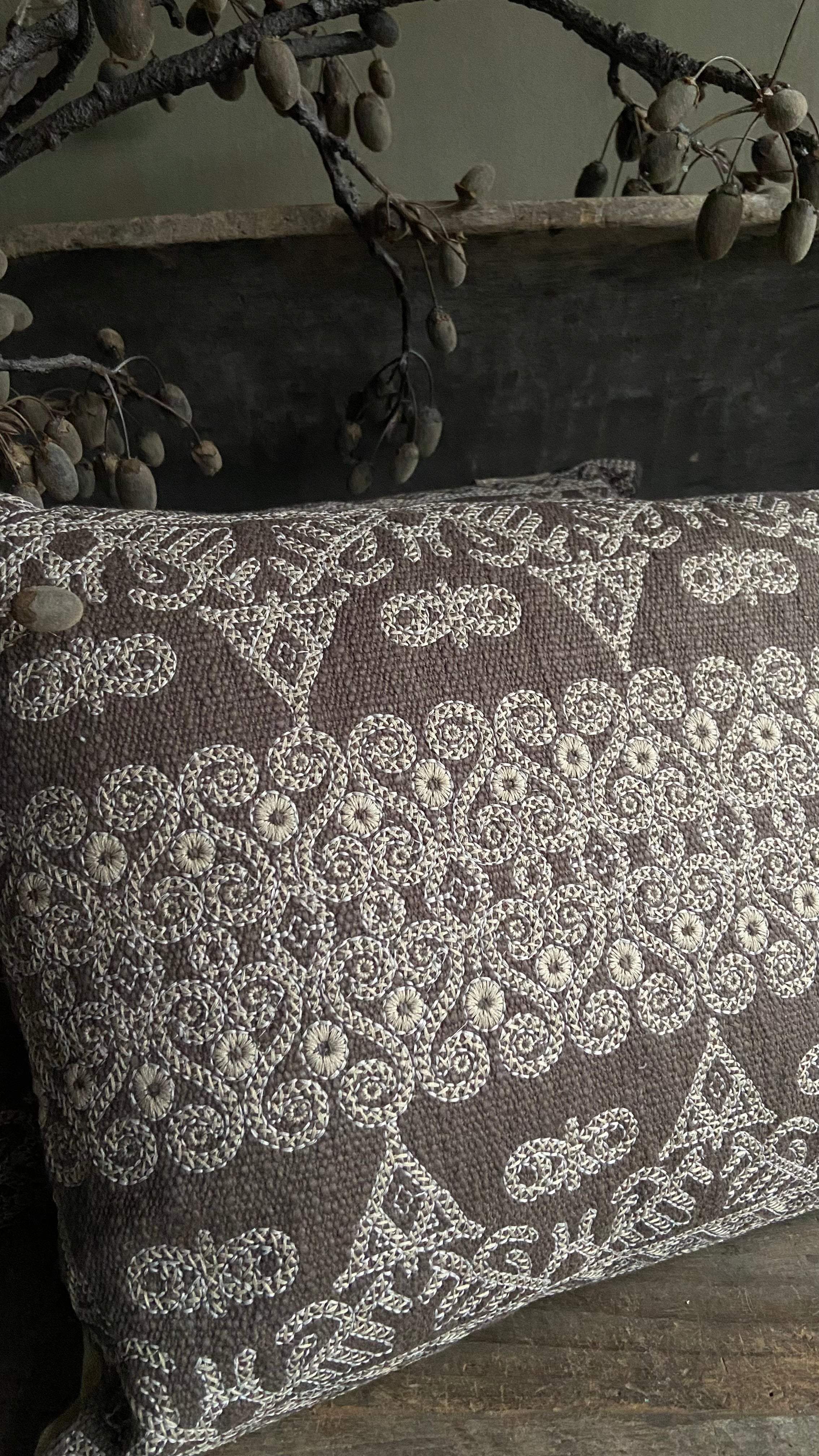 Questa bella baciare eseguito in lino con cotone ha una dura tinta talpa ed è di ottima qualità. La bella motivo ricamato conferisce al cuscino un aspetto elegante e senza tempo, ideale per qualsiasi interno.
