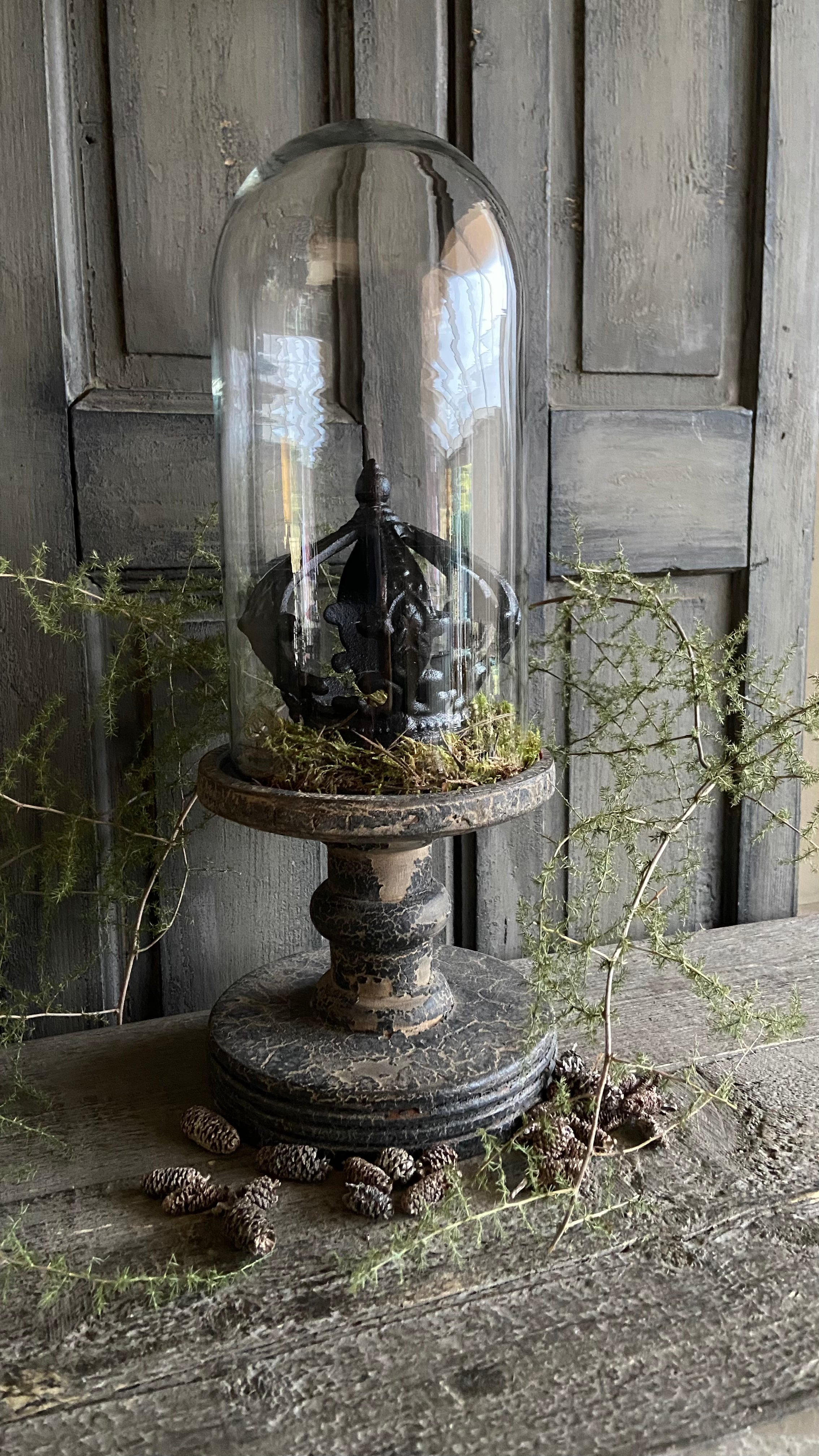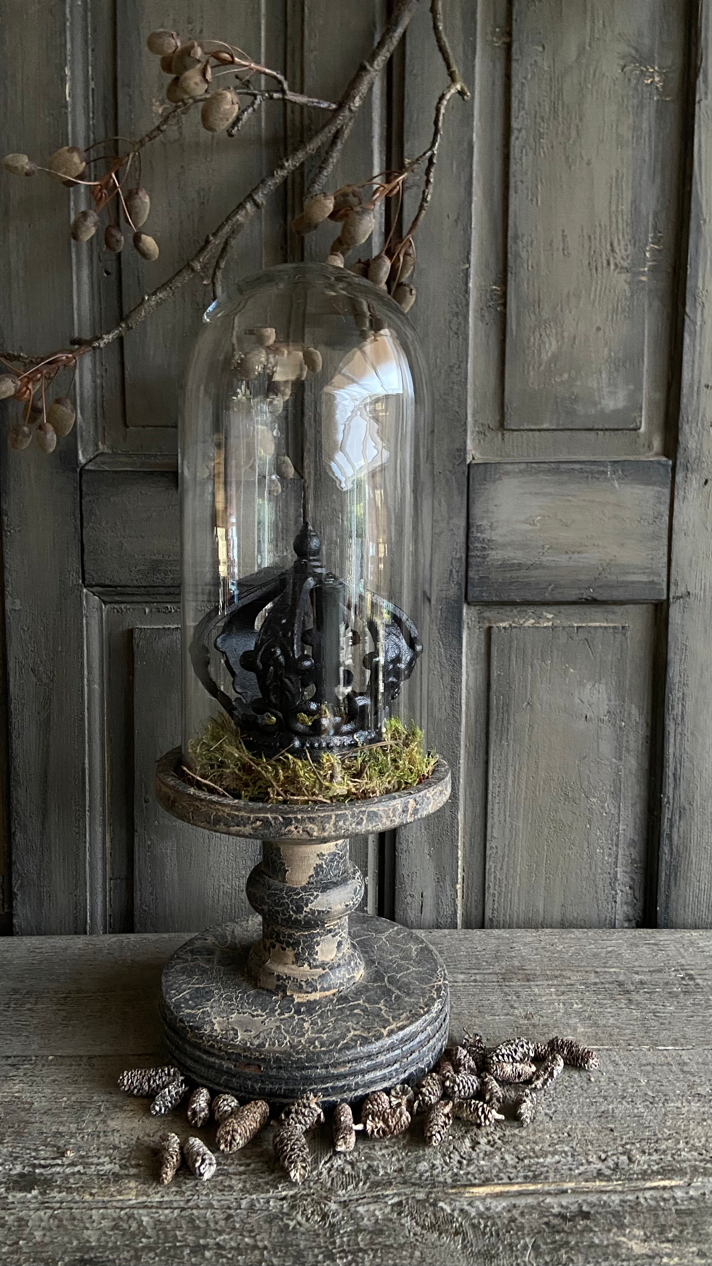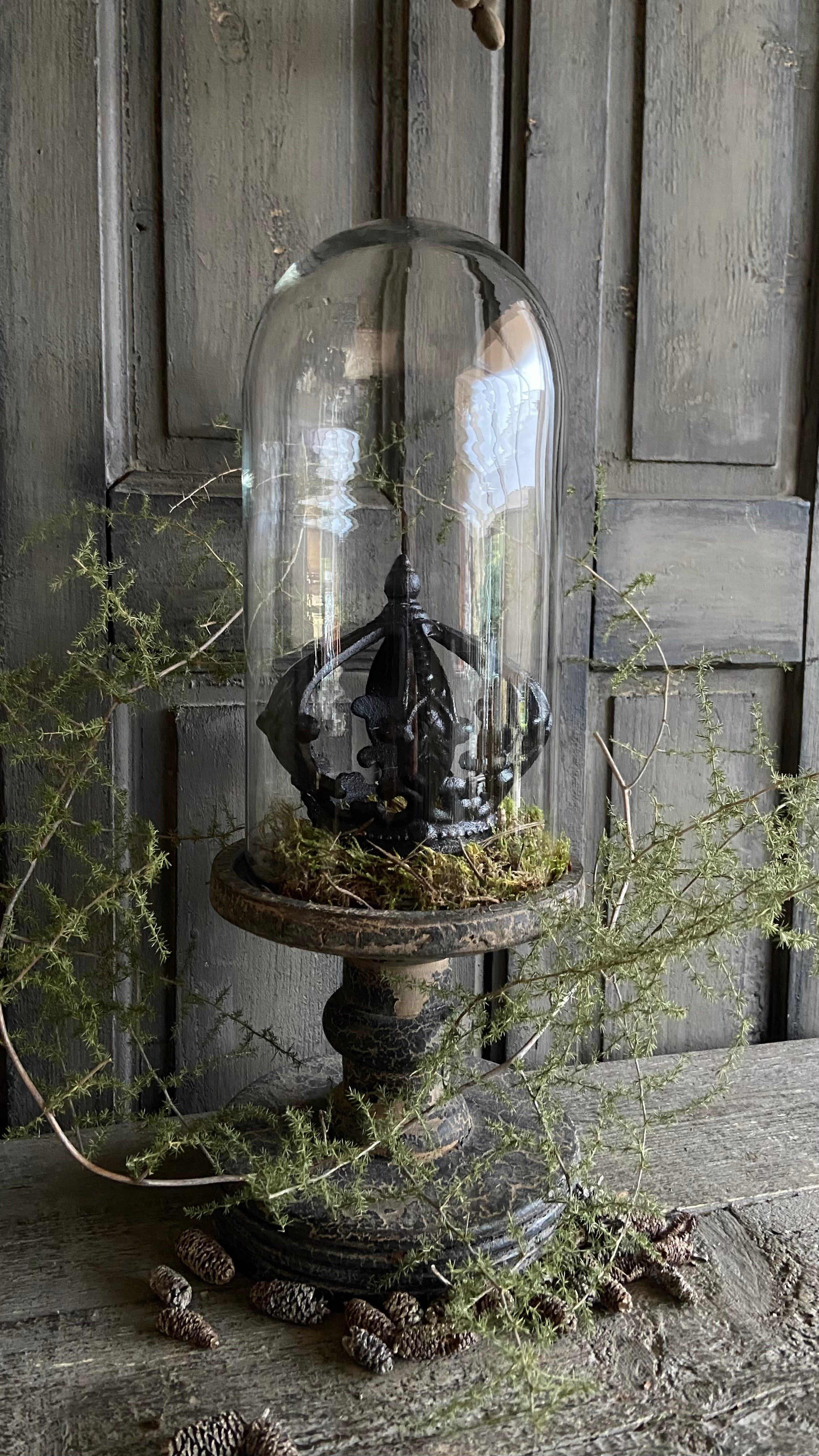 - Mooie landelijke stolp, afgewerkt in vintage finish, gecombineerd met een- met de mond geblazen- glazen stolp